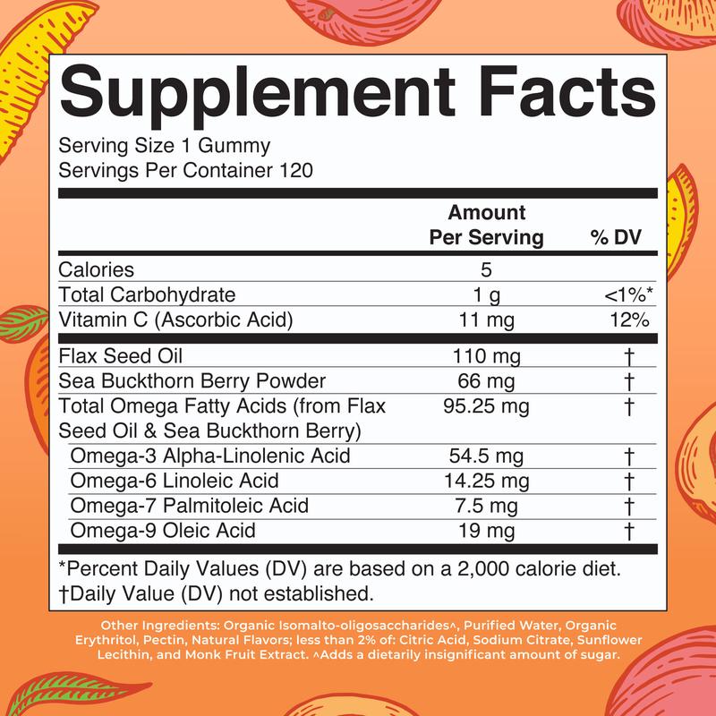 Our omega gummies are the furthest thing from fishy capsules! These vegan gummies — packed with omega fatty acids 3, 6, 9 and 7 — have three flavors in one: Peach Mango Apricot!