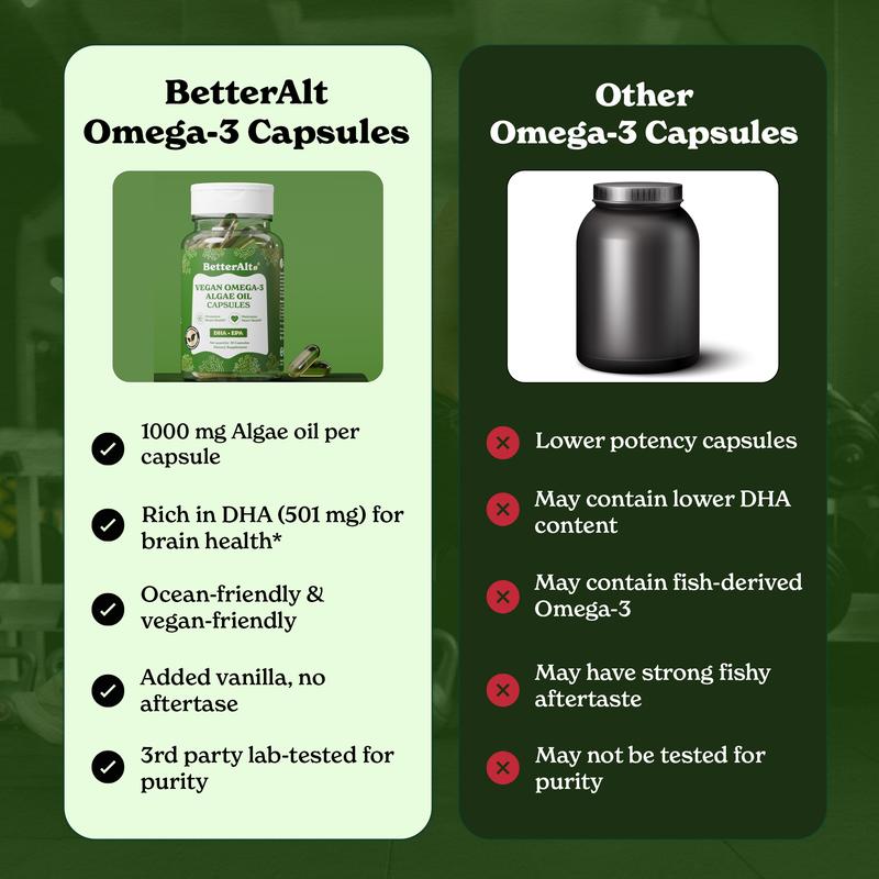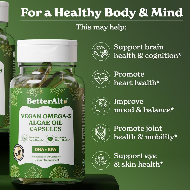 ·Fuel your body and mind with BetterAlt Vegan Omega-3 Softgel Capsules, made from sustainably sourced algae oil. These capsules provide a potent dose of DHA and EPA to help support brain function and overall wellness.*
