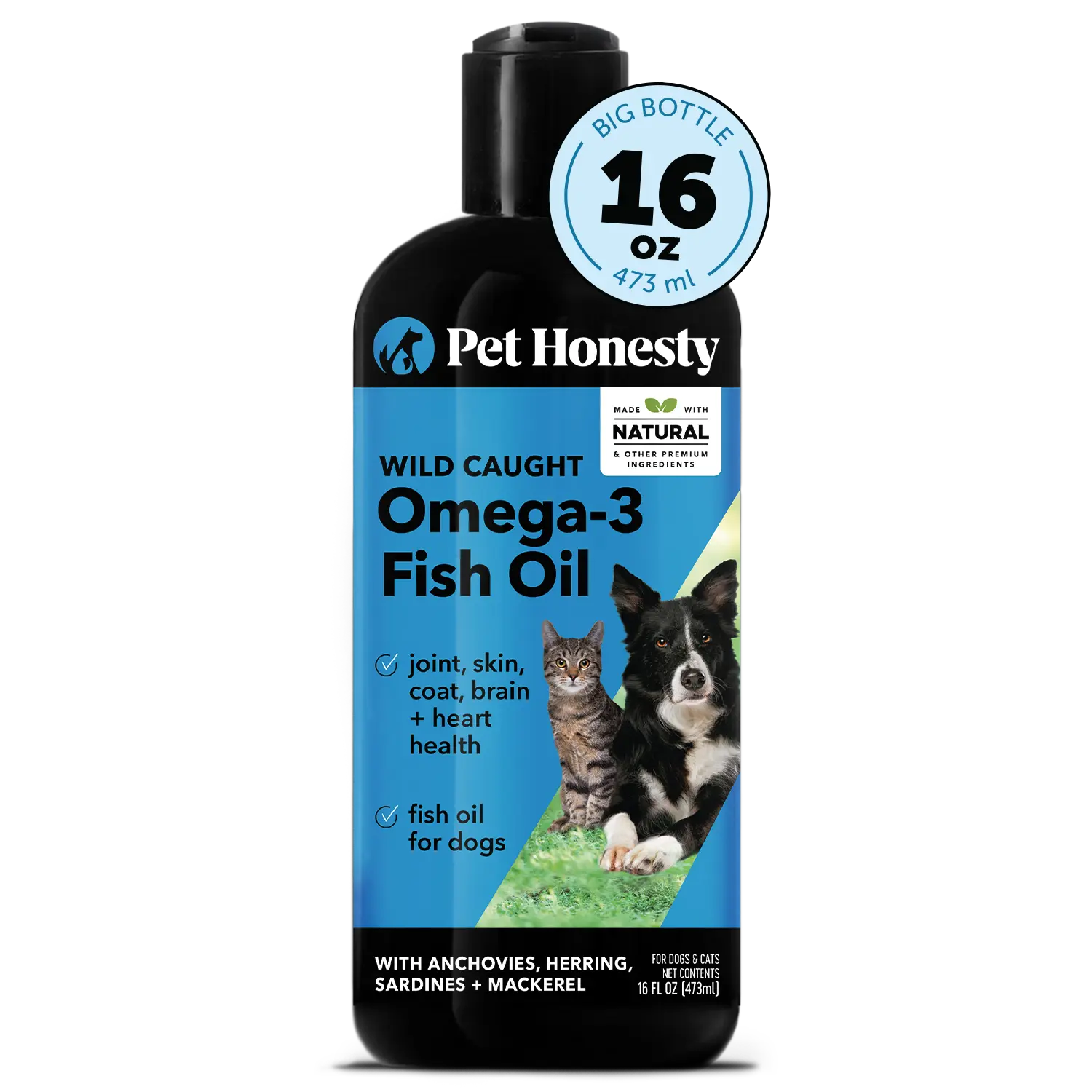 Pet Honesty’s Omega-3 Fish Oil for dogs & cats is made with sardines, mackerel, anchovies and herrings, caught in clean, cold waters off the coast of Iceland. These fish are high in Omega-3s but low in mercury and toxins - creating a supplement that best helps support your dog or cat's joint, heart, skin, coat, brain and overall health.