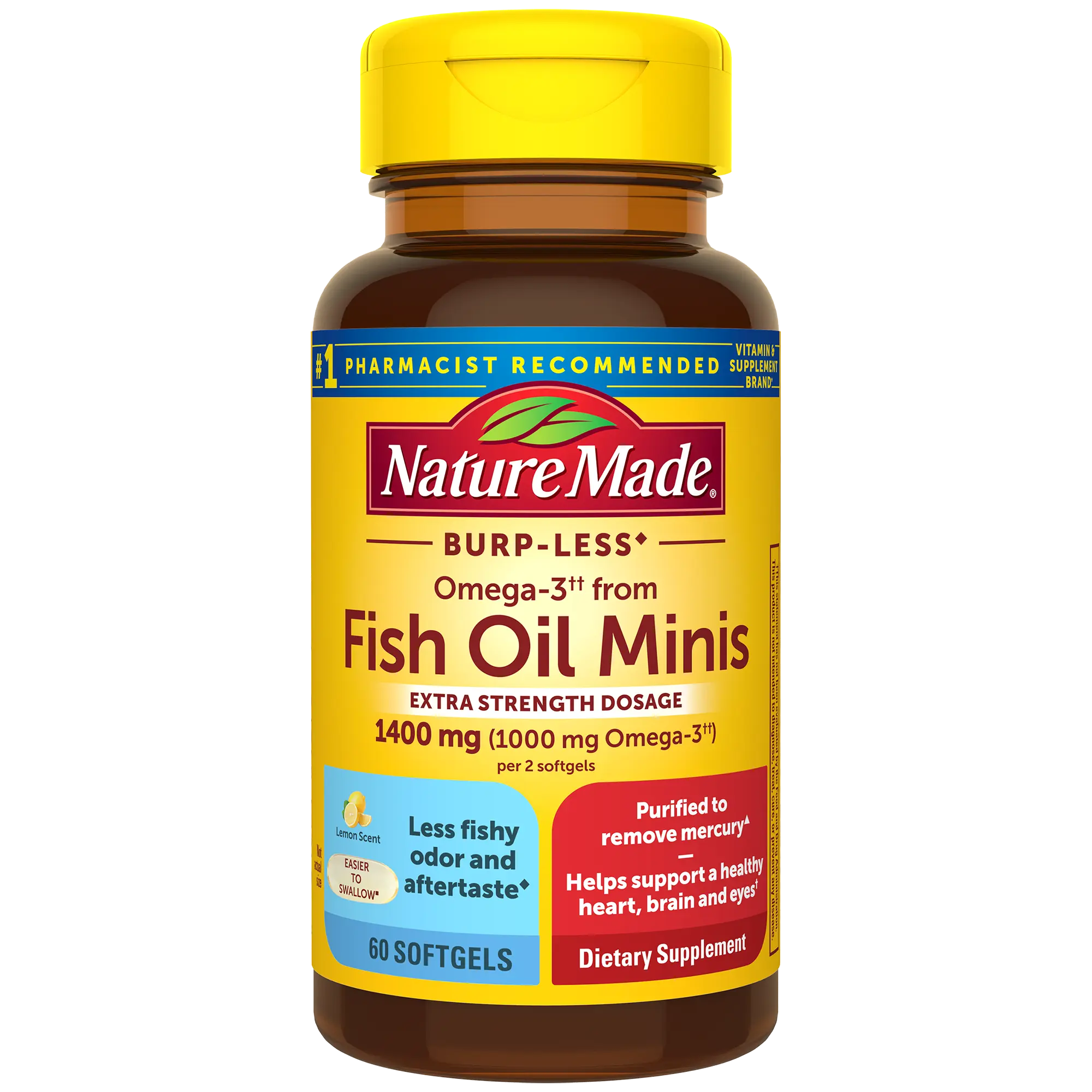 A less fishy way to support your heart!  Nature Made® Omega-3†† from Fish Oil Minis deliver 1000 mg of Omega-3†† in easier to swallow softgels with less fishy odor and aftertaste.⬥■ Supplementing with Omega-3 fish oil†† can help support a healthy heart, brain and eyes.†