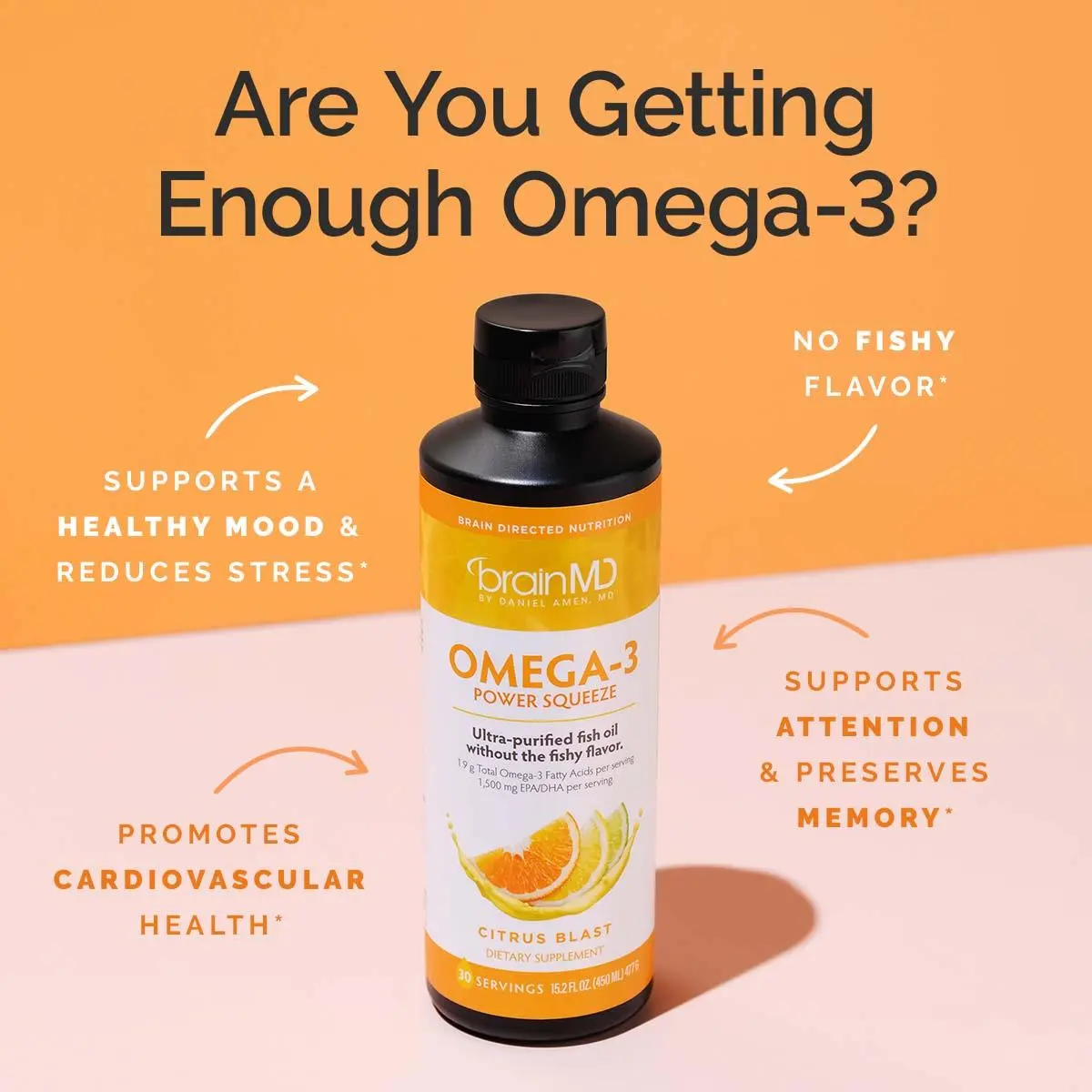 Omega-3 fatty acids are essential to our health, yet 90% of American adults don’t consume enough. That’s why it’s smart to take fish oil supplements. Unfortunately, fish oil capsules can be large and difficult to swallow. And some have a fishy flavor that many people can’t stomach. Omega-3 Power Squeeze is the perfect solution.