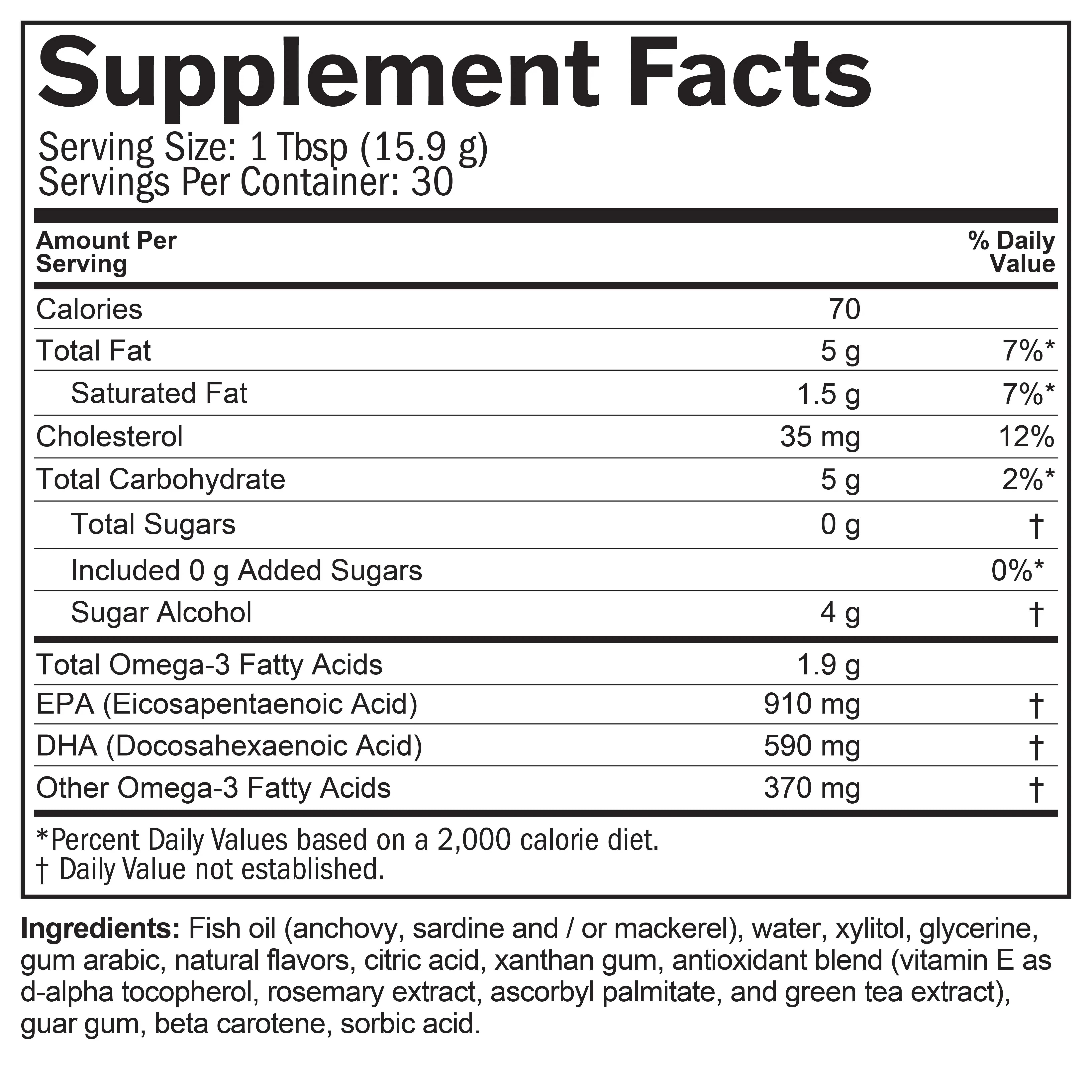 For health maintenance, we recommend adults take at least 1 tablespoon daily with food, which can be divided into two or three daily portions if desired. For additional benefit, adults may take 2 tablespoons daily, providing a total 3000 mg of EPA+DHA. This is the maximum recommended dose.
