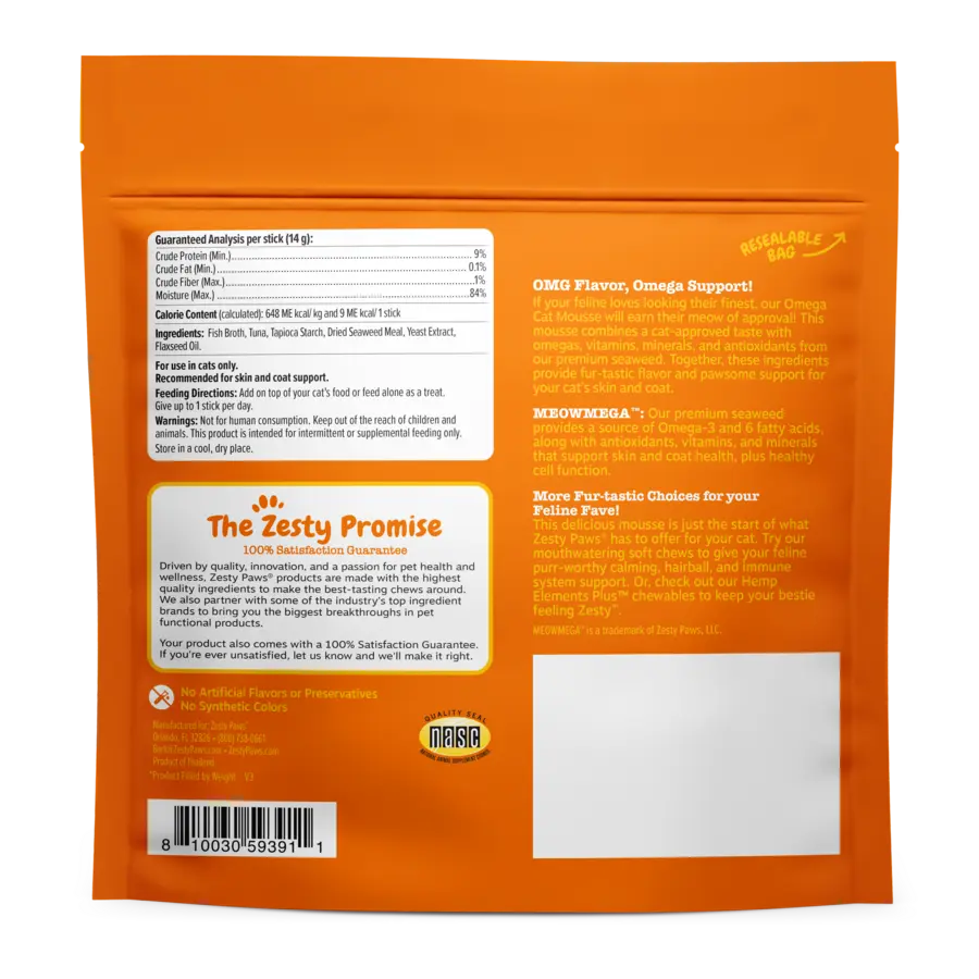 If your cat loves looking their best, our Omega Cat Mousse will earn their approval! This mousse combines a cat-approved taste with omegas 3 and 6, vitamins, minerals, and antioxidants from premium seaweed. These ingredients provide fur-tastic flavor and pawsome support for your cat’s skin and coat.