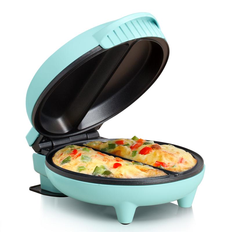 Each section prepares an individual omelet about 3.5 inches in size—customize each with your favorite mix-ins and toppings.