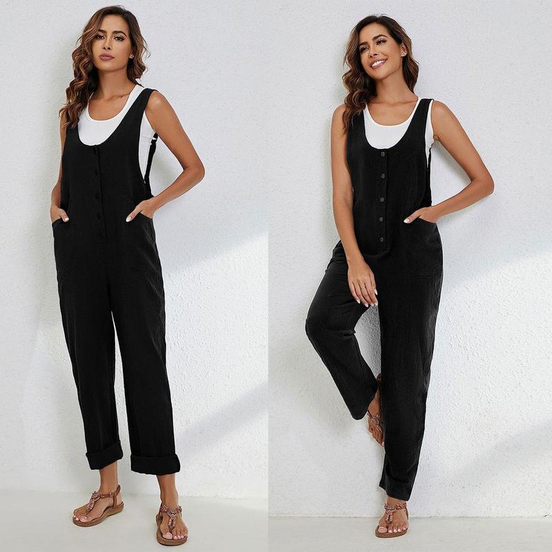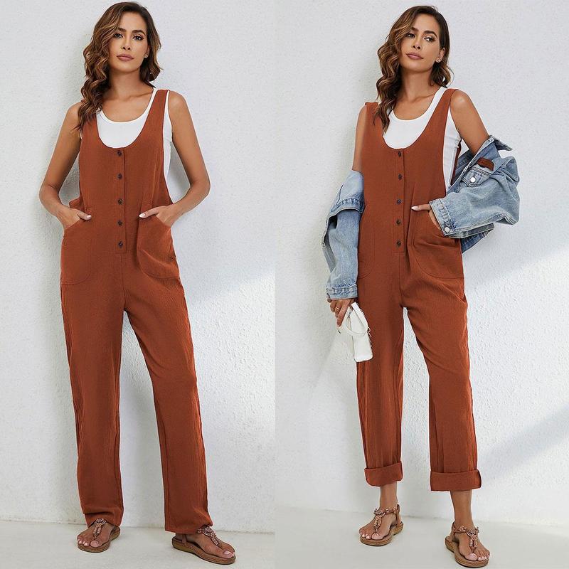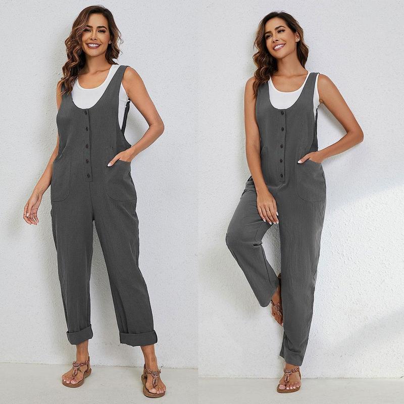 ·Loose fit sleeveless jumpsuit for women with scoop neck, slightly oversized silhouette, 2 pockets, button-down front closure and adjustable straps design