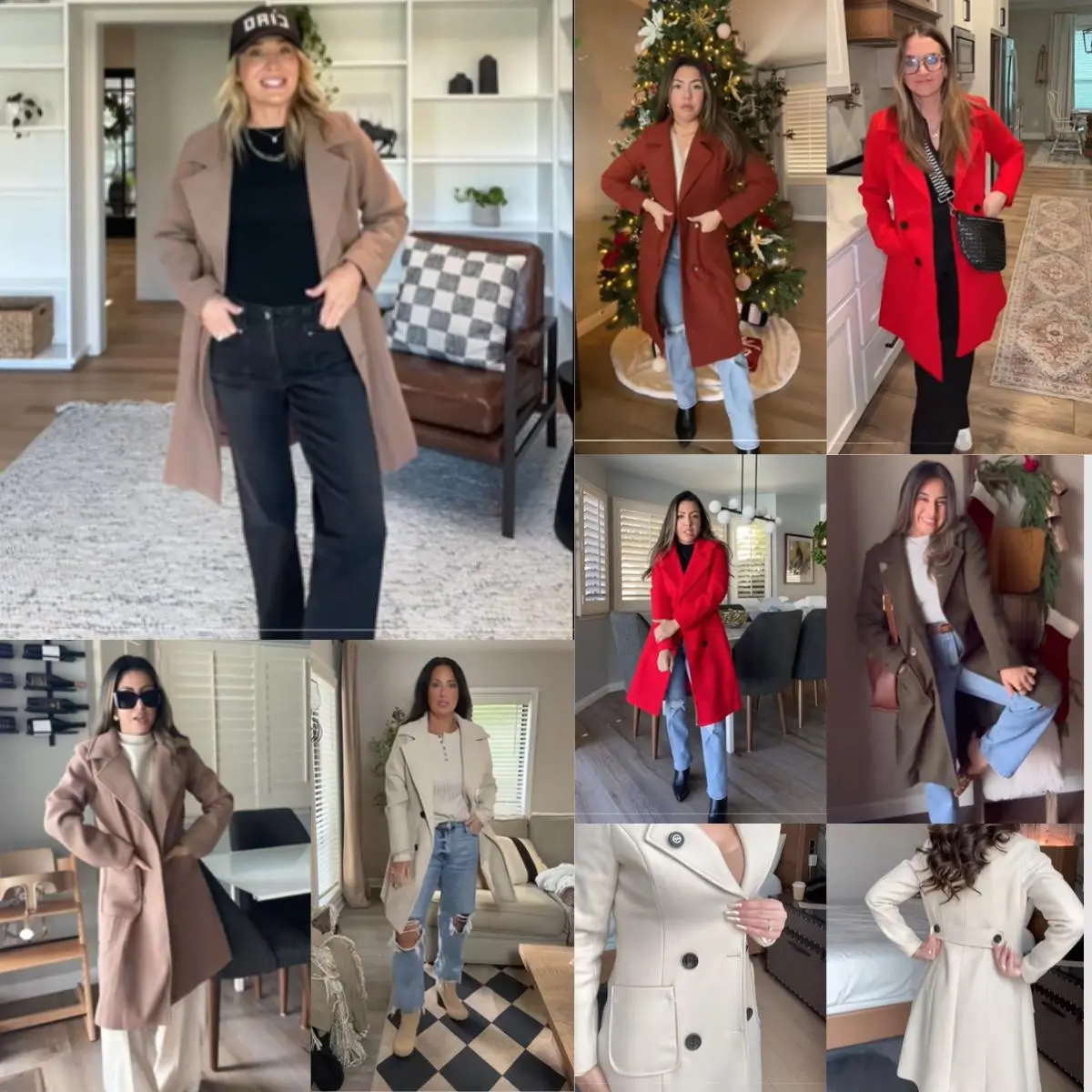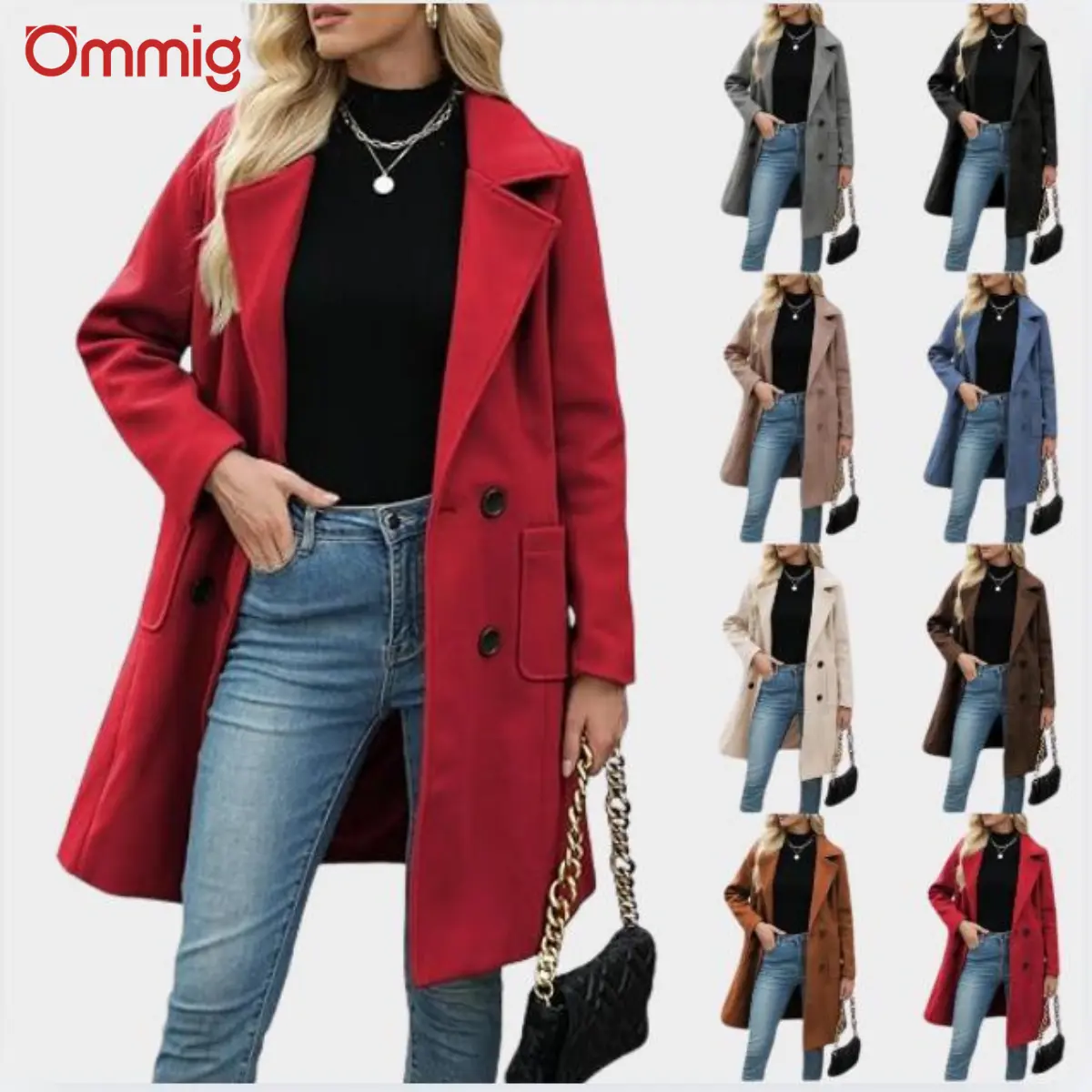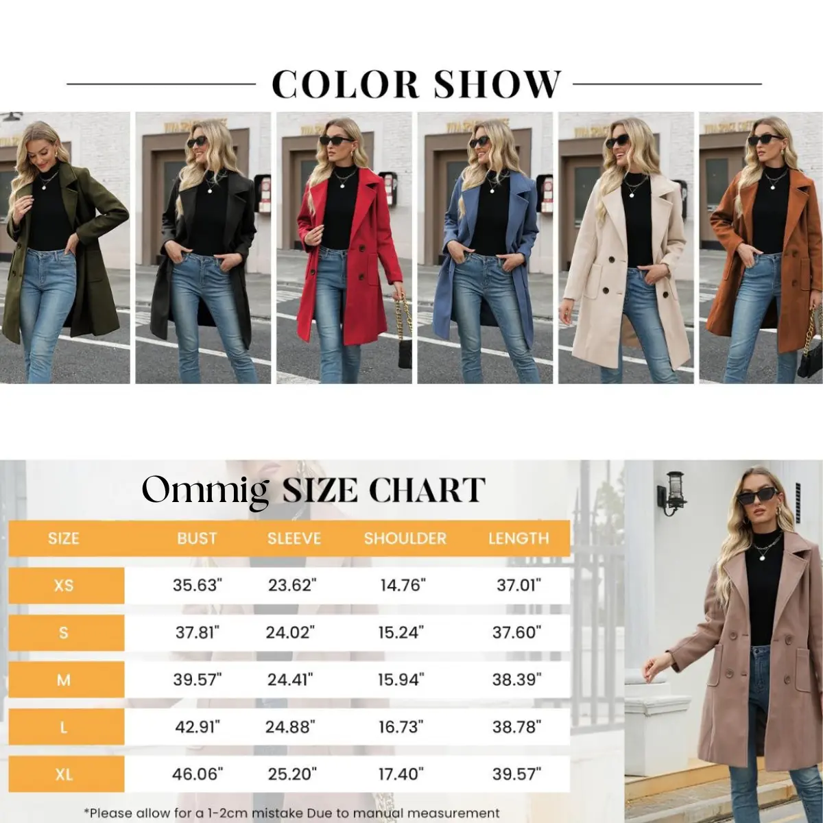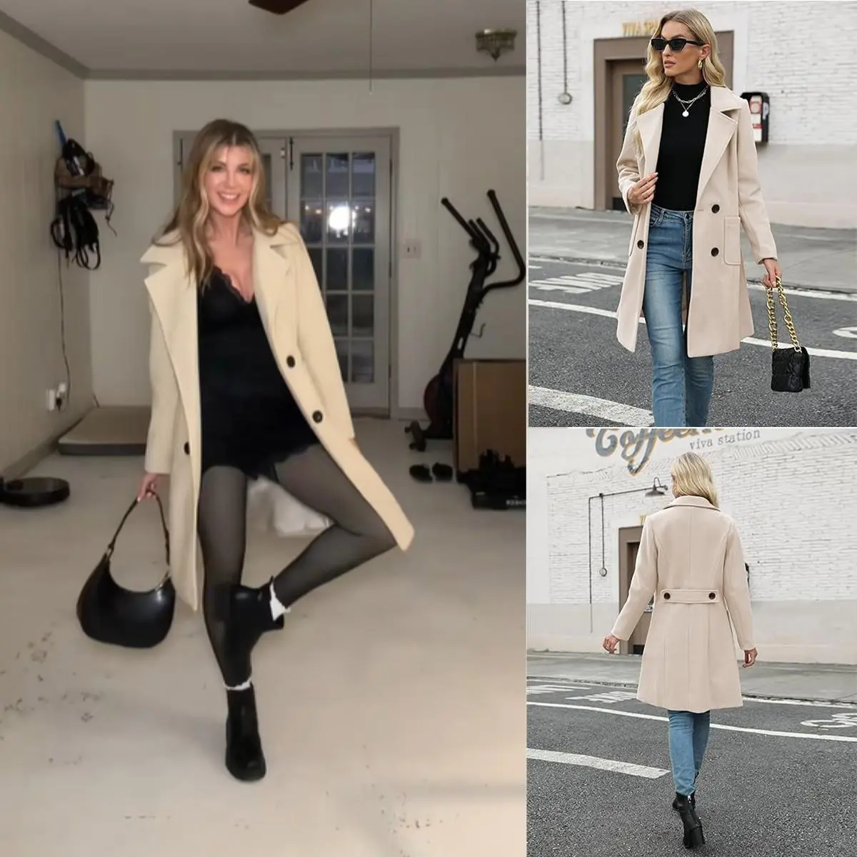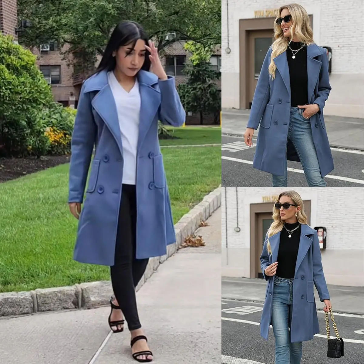 Design:Classic double-breasted notch lapel with button closure, functional side pockets, and decorative back buttons. Mid-length solid color silhouette with long sleeves creates a polished, sophisticated look.