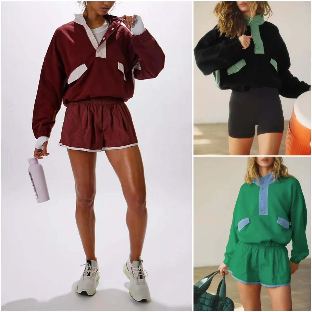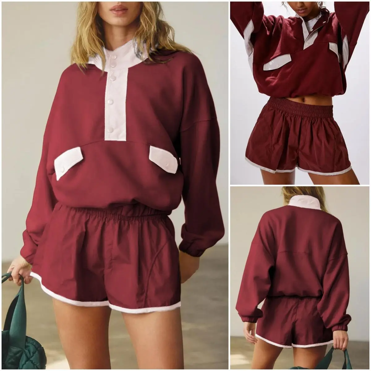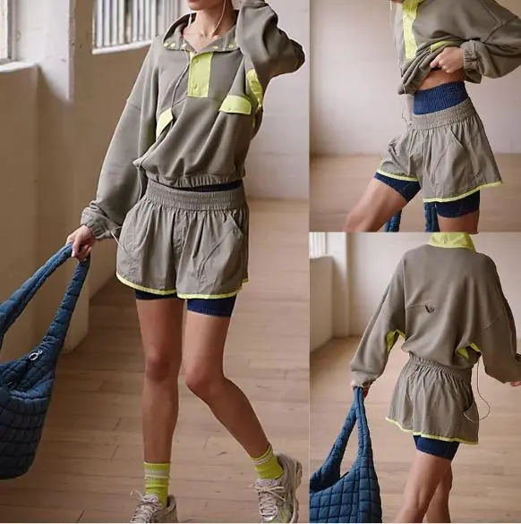 ·Features: 1/4 Button Closure Pullover / Long Sleeve Athletic Top / Stand Collar Sweatshirt Set / Color Block Stitching Set / Workout 2 Piece Shorts Set / Casual High Waist Shorts Set / Athletic Sports Workout/Two Piece Outfits for Women/Casual Tracksuit Sets