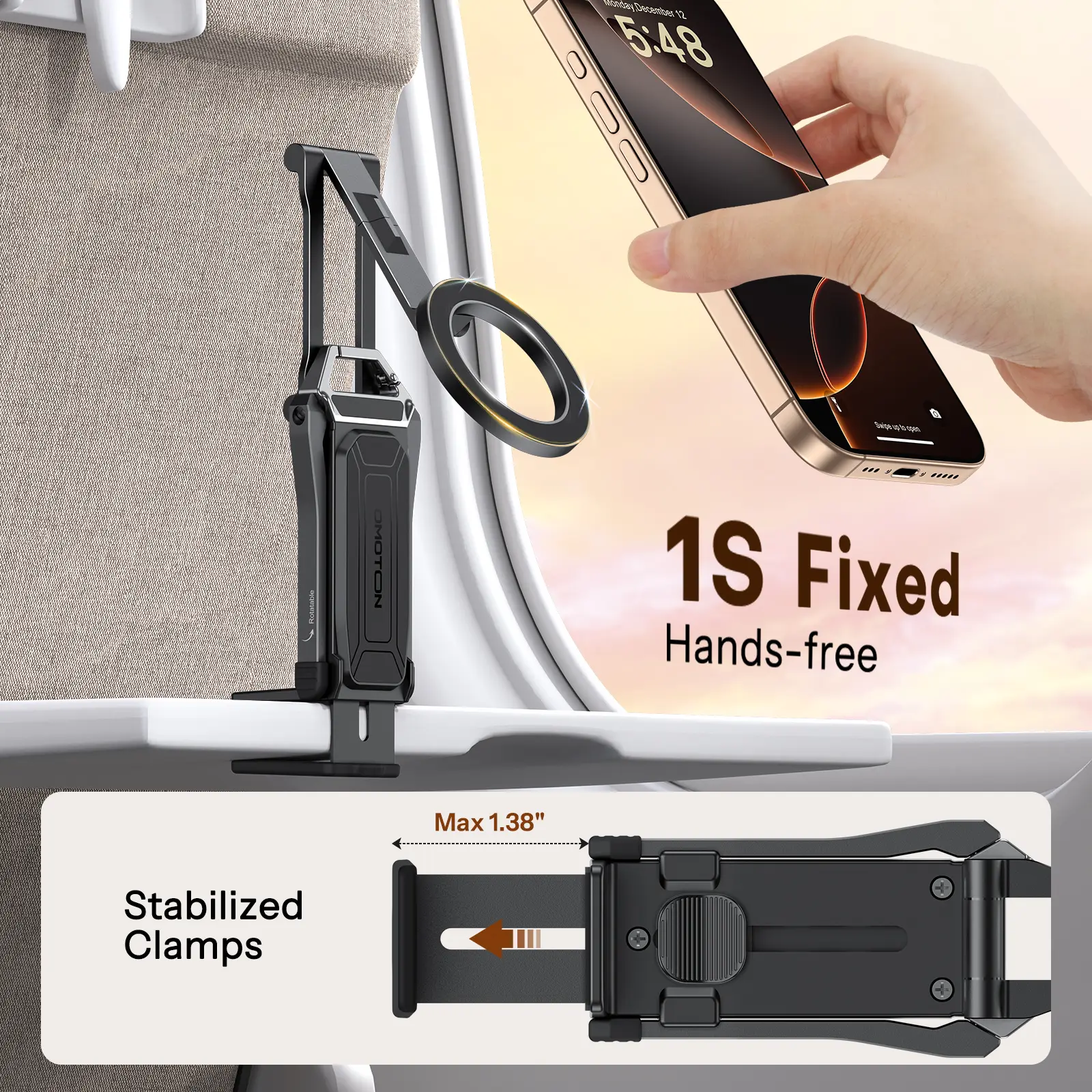 Builtin clamp grips airplane tray tables, desks, and luggage, while the hook lets you hang it on your travel bag for quick access.