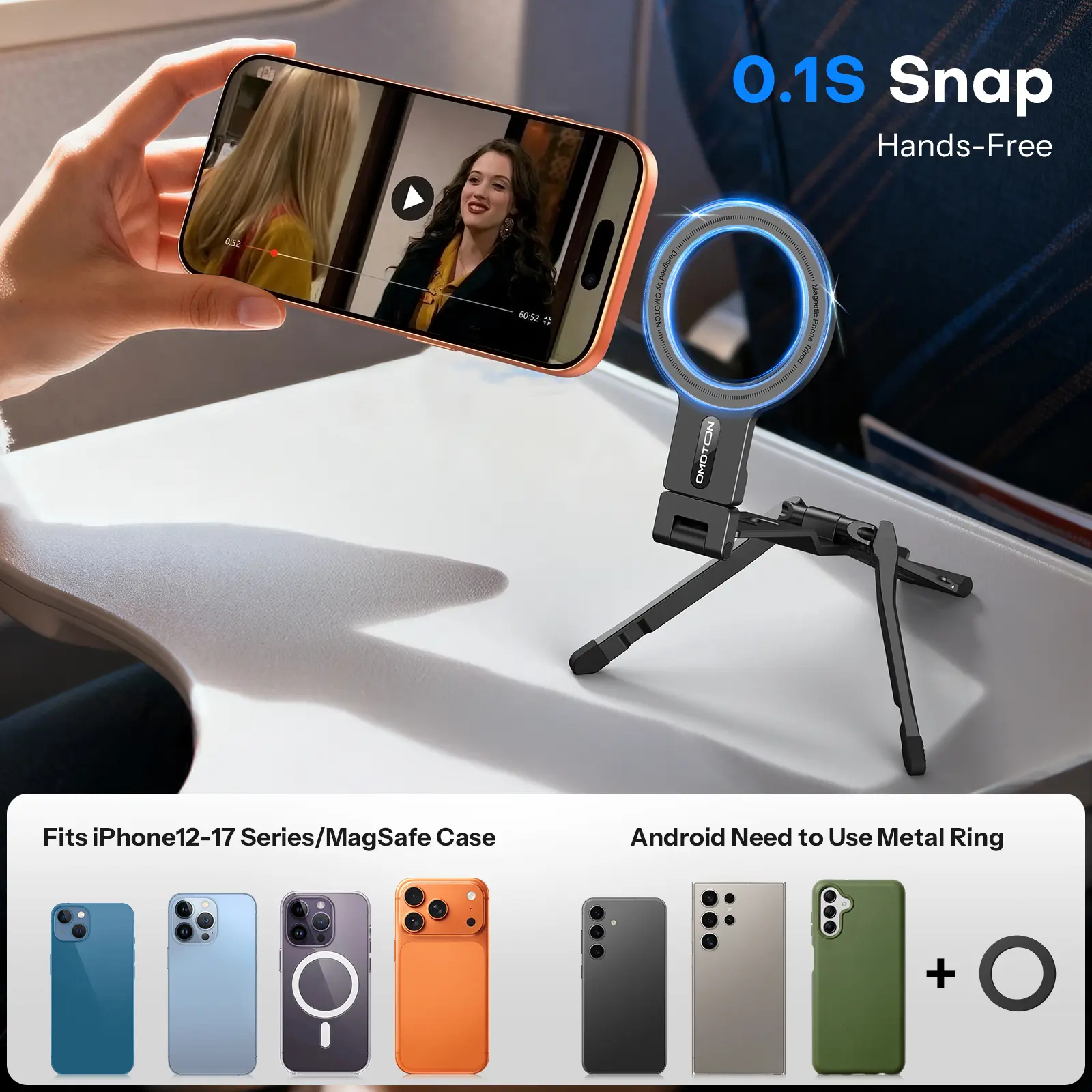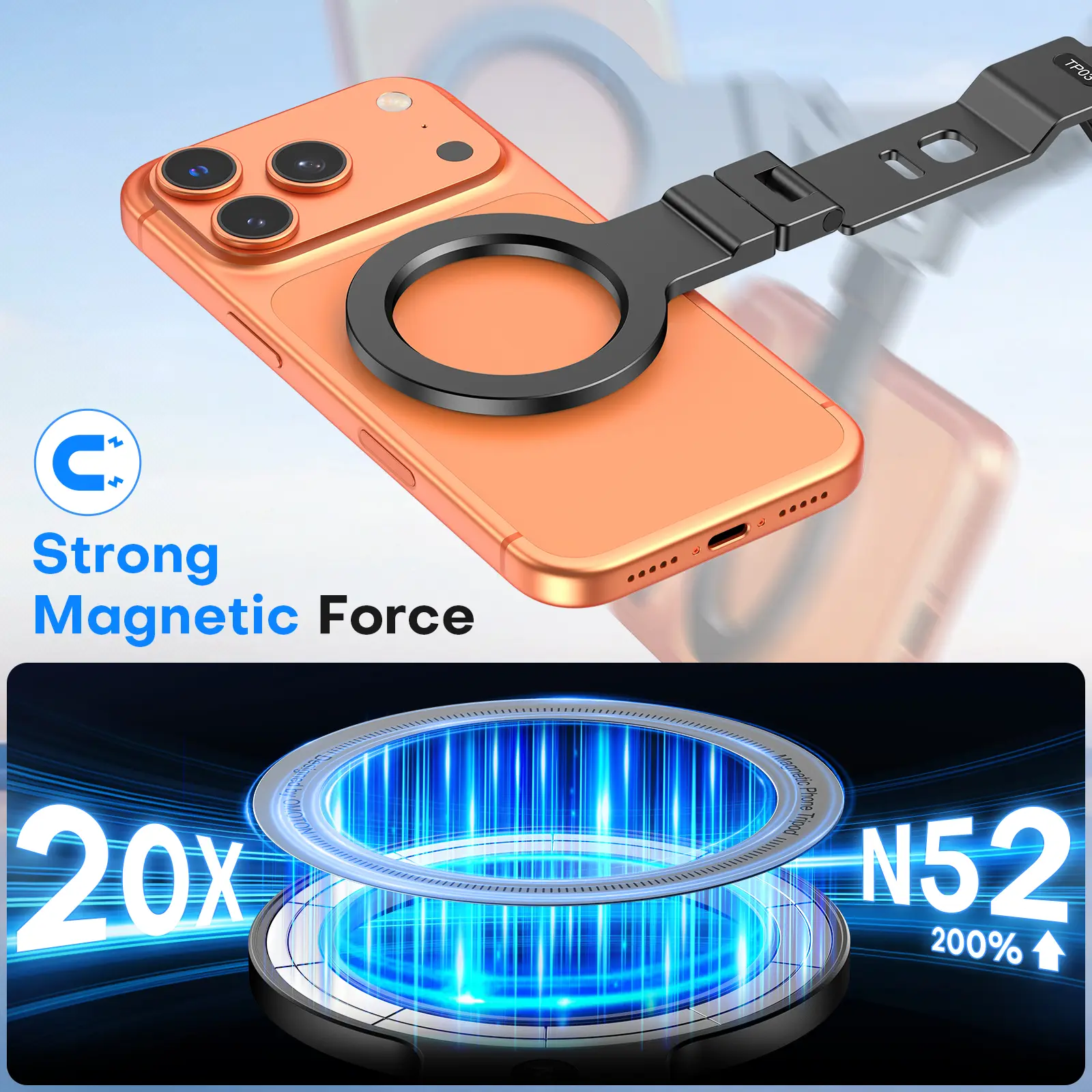 Experience MagSafe-powered magnetic attachment that snaps securely to phones and metal surfaces. The strong N52 magnet ensures stable hold during active use.