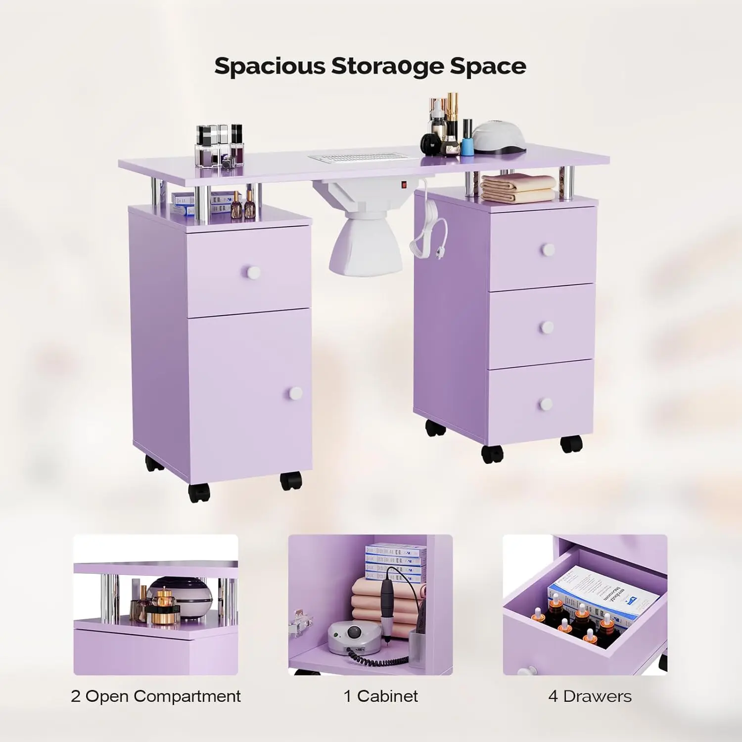 【LARGE STORAGE SPACE】-The professional manicure table is designed with 2 open spaces, 4 drawers and 1 large capacity side cabinet. It is spacious enough for professional manicurists to place various manicure tools.It can meet the storage requirements of various sizes without worrying about storage.