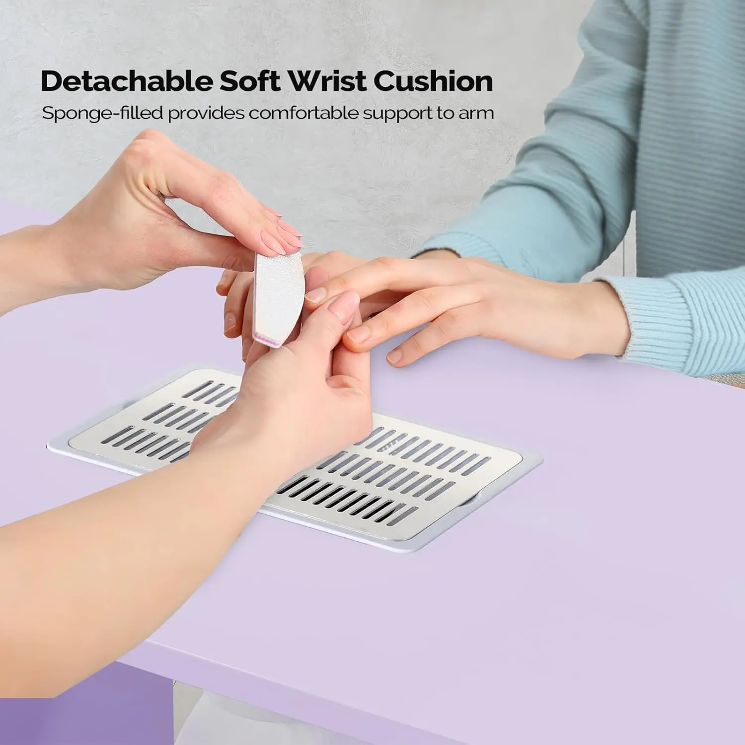 【ERGONOMIC & COMFORTABLE】-The spacious table top provides you with enough space for manicure.It also comes with a soft sponge wrist cushion to provide comfortable support for the client's arm, which provids you and your client with a more comfortable manicure journey