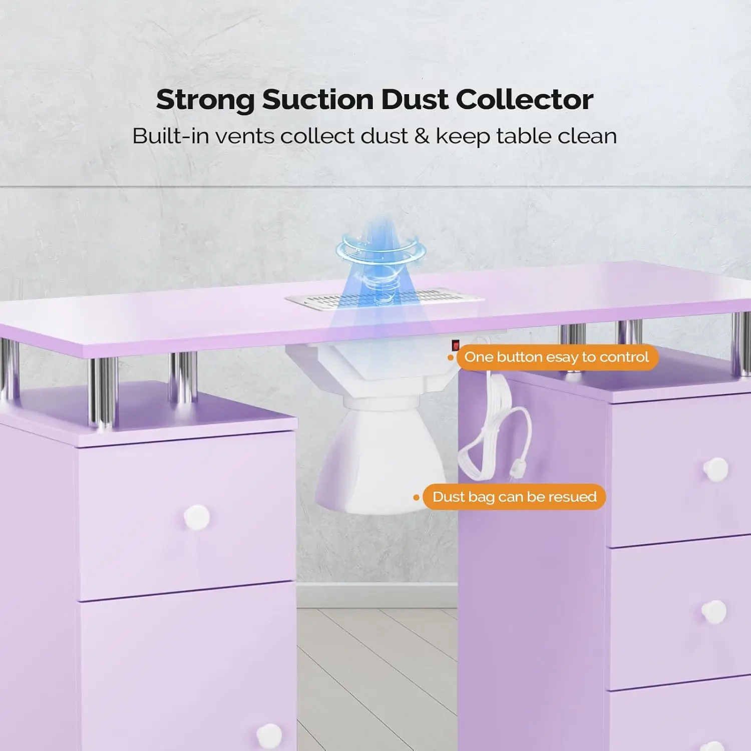 【STRONG ELECTRIC DUST COLLECTOR】-Built-in powerful and efficient electric dust collector. One-button start and detachable dust bag can easily remove and collect nail shavings and dust generated during the manicure. To keep your desktop clean and provide a hygienic environment for you and your customers.