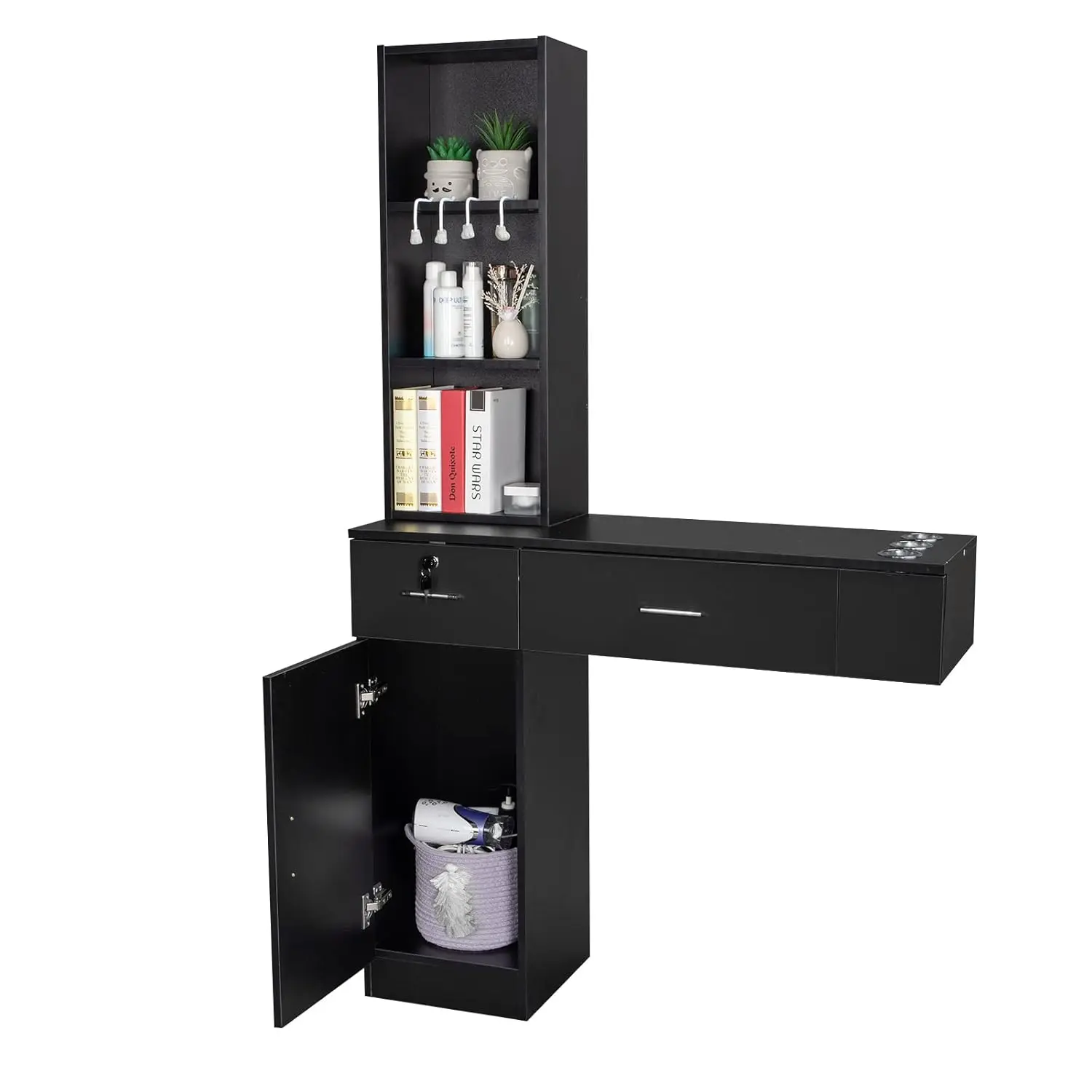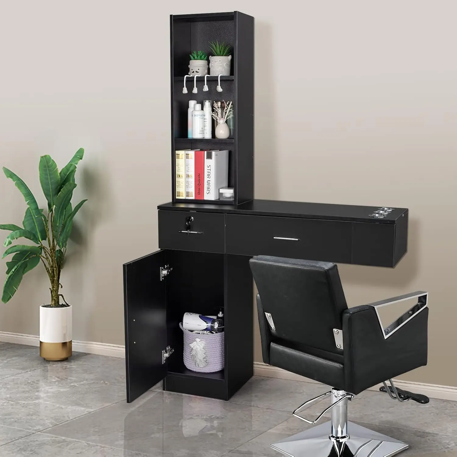 Large Storage Capacity: The wall mount salon station set has a three-tier shelf, two drawers, the lower part is a large-capacity cabinet, the desktop has three additional hair dryer holder to put such as hair dryer tools, can meet a variety of sizes of storage, storage worry-free