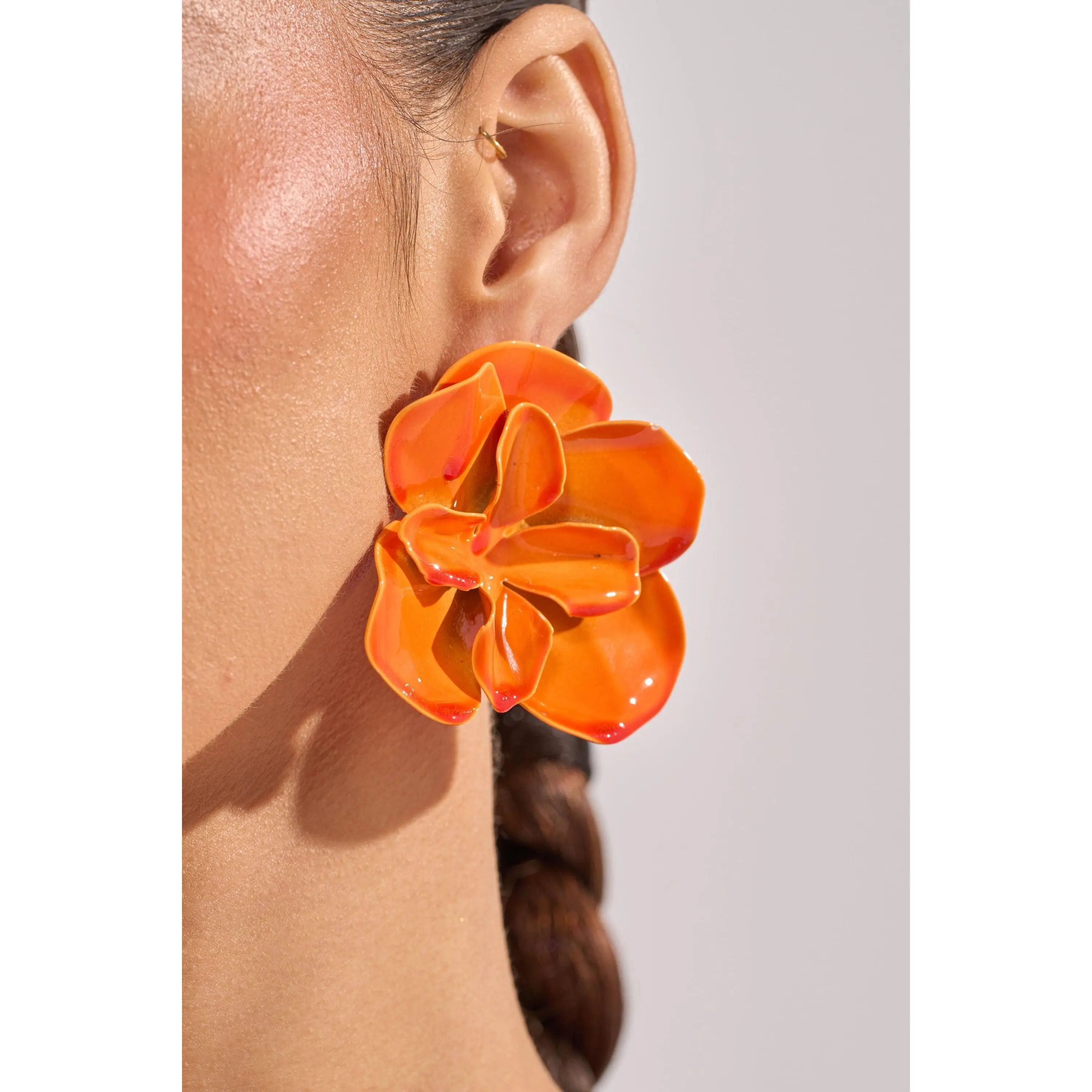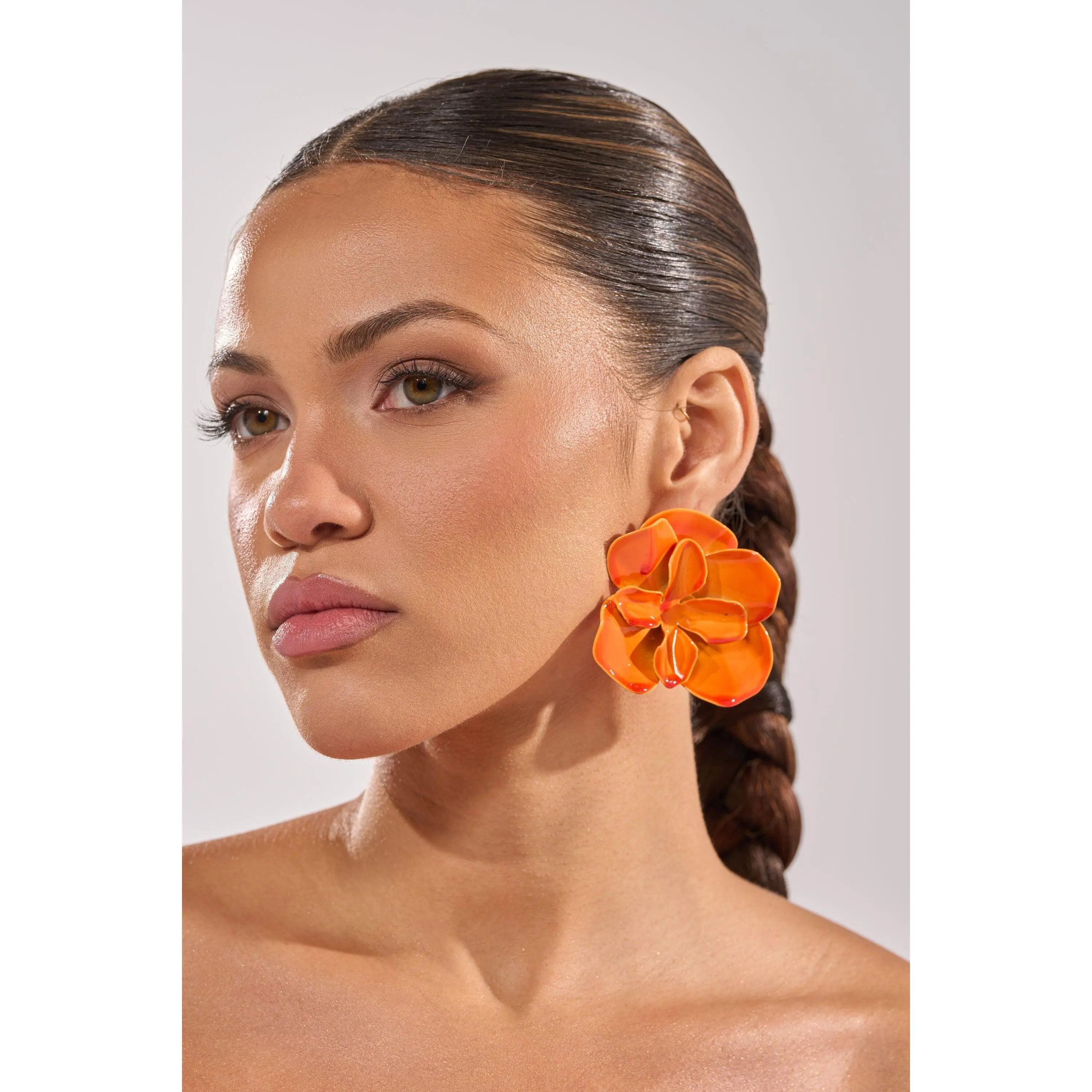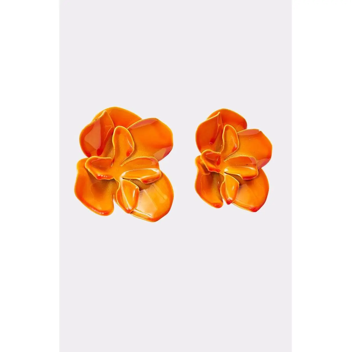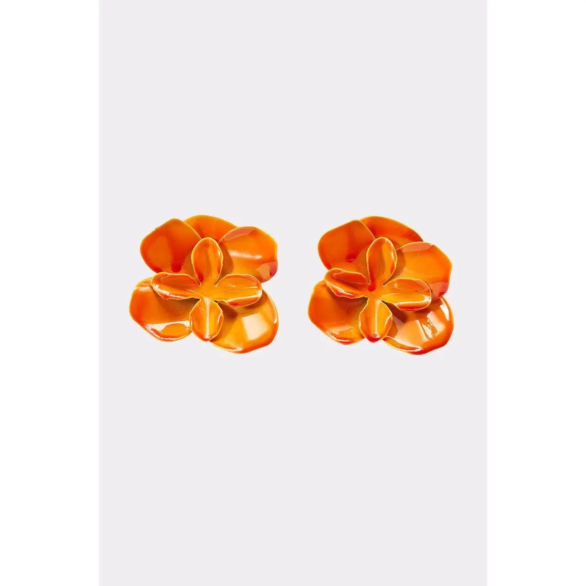 High-gloss orange floral stud earrings designed to make a bold, cheerful statement, perfect for summer parties, vacations, or daytime events. Crafted with sculpted petal detailing and a smooth enamel finish, these earrings feature a classic post-back closure for secure, comfortable wear. A vibrant accessory that instantly brightens casual outfits, resort looks, or warm-weather dresses while adding playful, modern charm.- 100% Man-Made Materials- Imported (all measurements are approximate from size O/S)- 2.5” Drop LengthProduct ID: 1083649