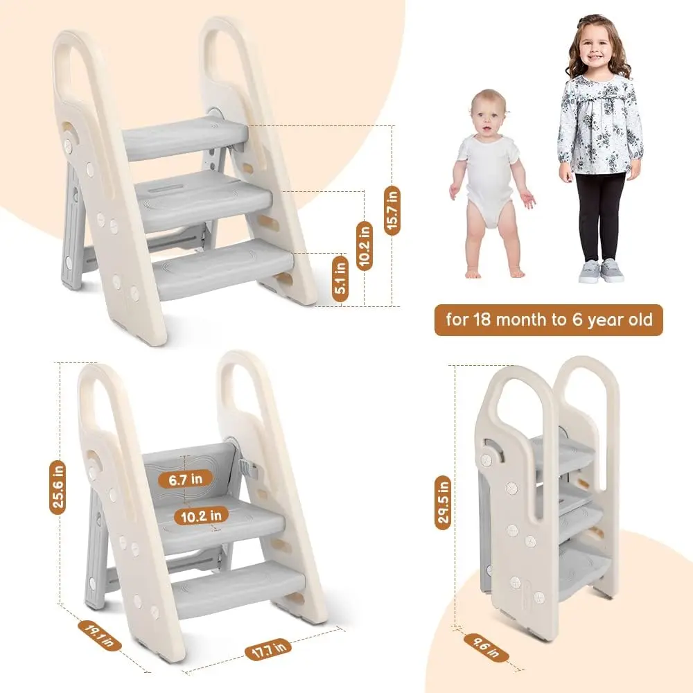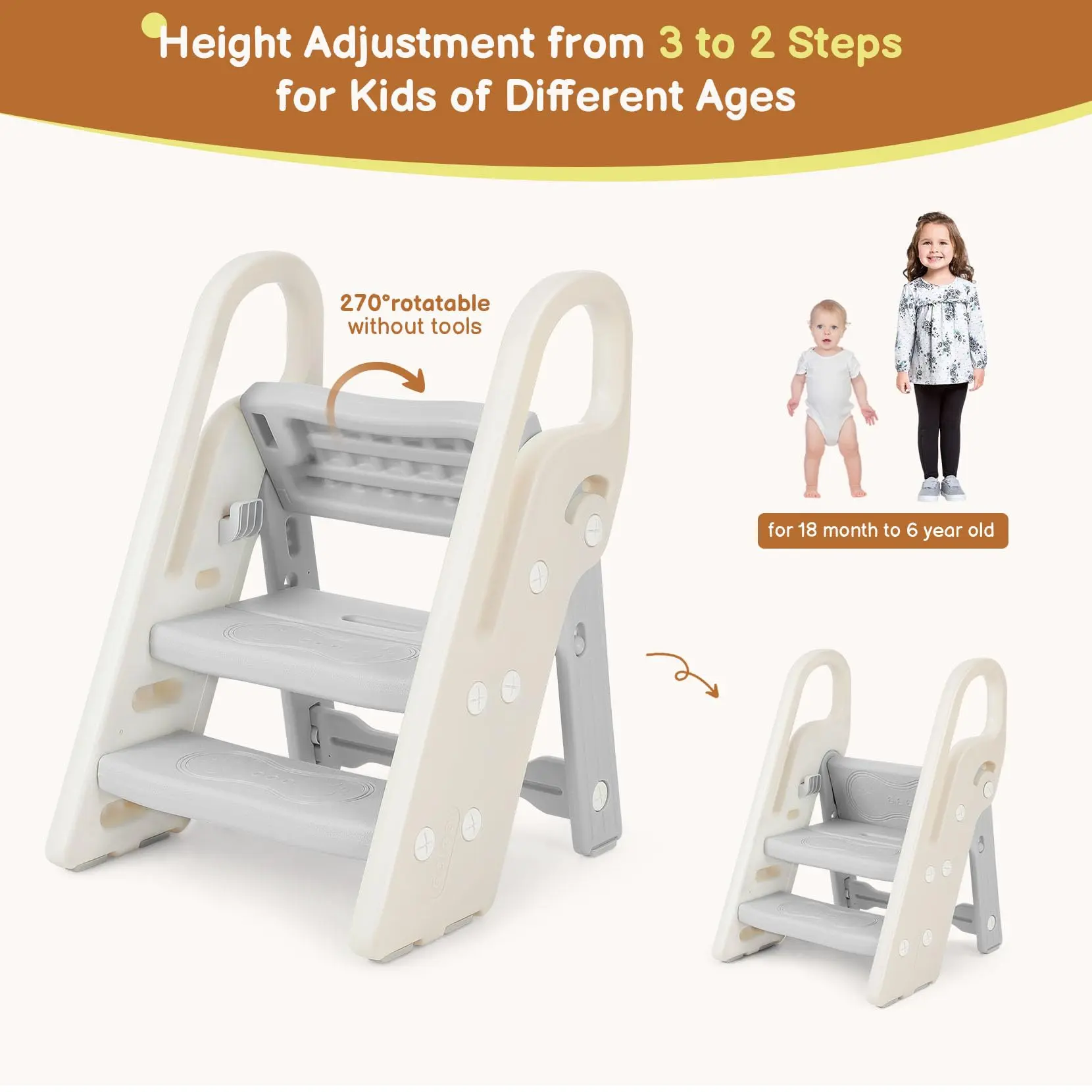 ·Height Adjustable: The top panel can be easily turned 270 degrees, converting the 3-step stool into a 2-step stool for kids or a toddler chair.