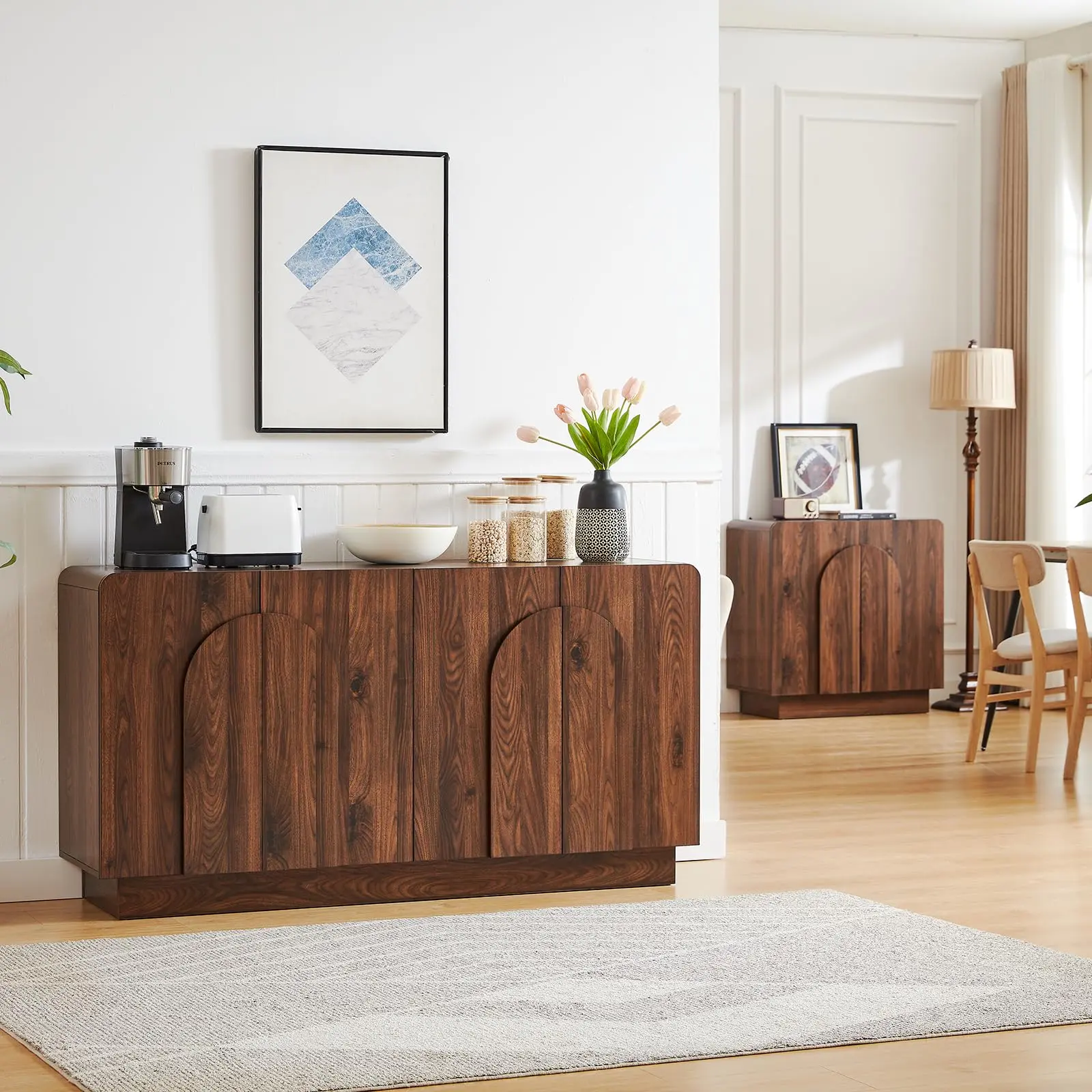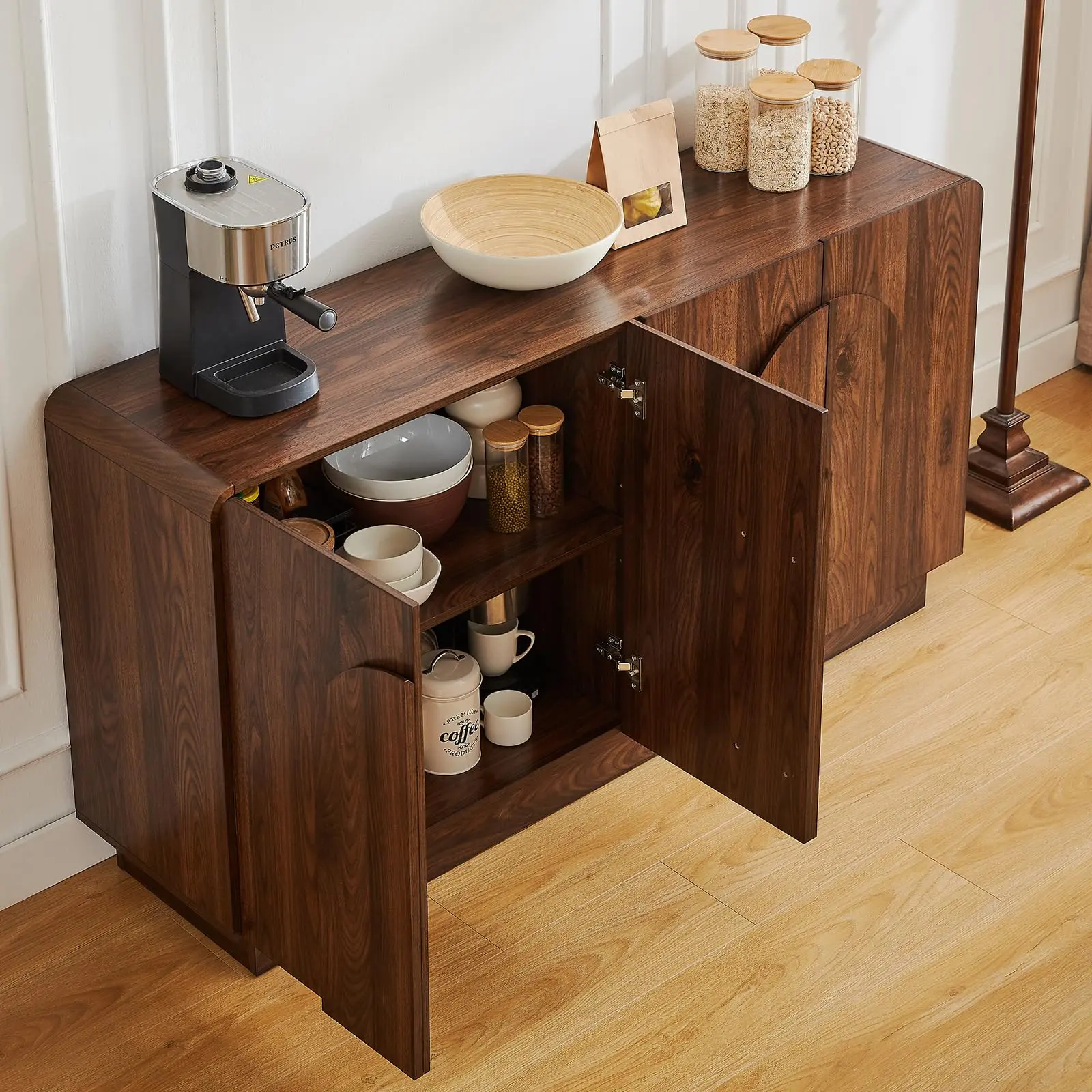 Elevate your space with this classic sideboard, featuring a signature curved frame and handle that seamlessly bridges modern and farmhouse aesthetics. Designed for versatility, it is available in two widths (31.5-inch and 60-inch) to fit perfectly in your dining room, living room, or hallway. The surprisingly spacious interior offers ample storage for all your essentials, complemented by adjustable shelves that let you customize the layout to accommodate items of any size. Built with a reinforced frame and scratch-resistant finish, this cabinet combines timeless elegance with everyday durability.