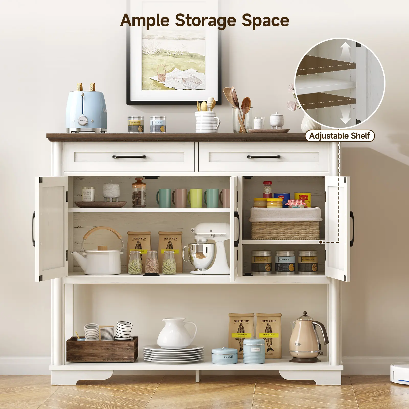 Introducing our Classic Style Sideboard, a perfect blend of functionality and sophistication. This elegant piece features two spacious storage cabinets and two large drawers, providing ample space for all your dining essentials. The adjustable shelves allow for customizable storage options, making it versatile for various items. Designed with grace and charm, this sideboard is not only ideal for your dining room but also serves as a stylish addition to your entryway or living room. The sturdy base ensures lasting durability, offering stability and support. Elevate your home decor with this classic sideboard that seamlessly fits into multiple occasions and settings, enhancing both style and organization. Discover the perfect storage solution that combines timeless elegance with practical use.
