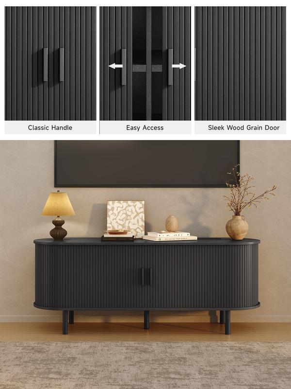 The ComfyCorner TV stand blends mid-century modern design with practical functionality. Featuring fluted details and a built-in power outlet, this 70.8-inch media console accommodates up to 80-inch TVs while providing organized storage through 8 versatile spaces including drawers and hidden compartments. With adjustable leveling feet and anti-tip hardware, it ensures stability on uneven floors while serving equally well as an entertainment center or entryway cabinet.
