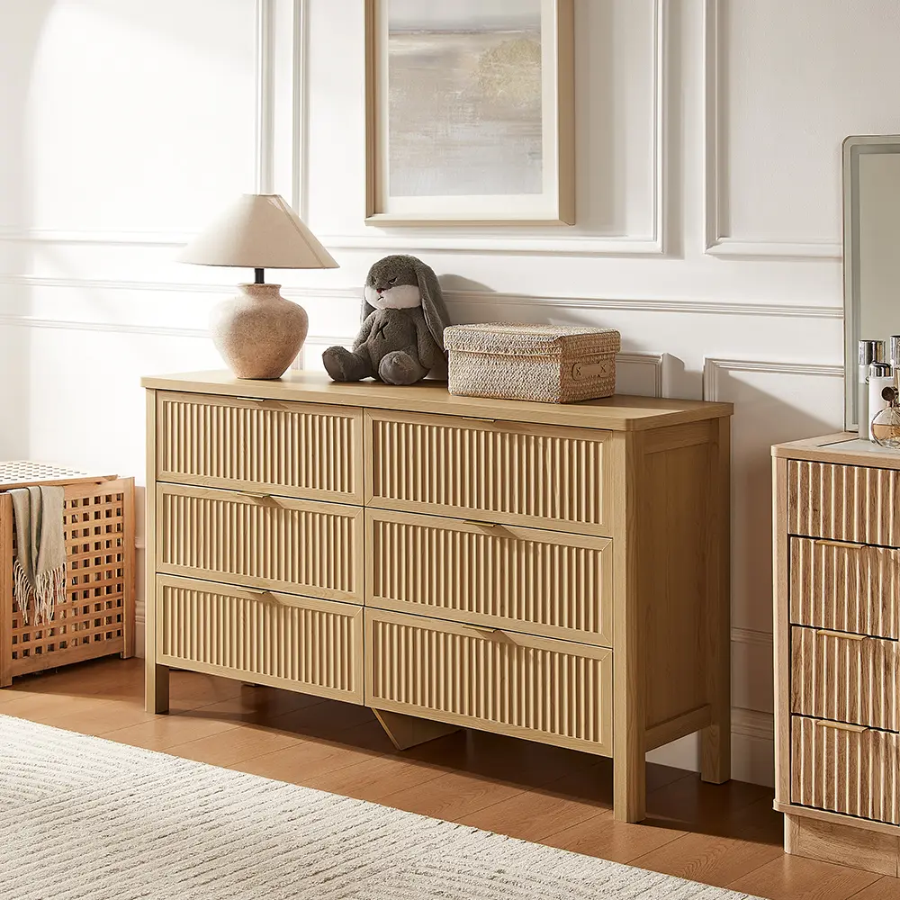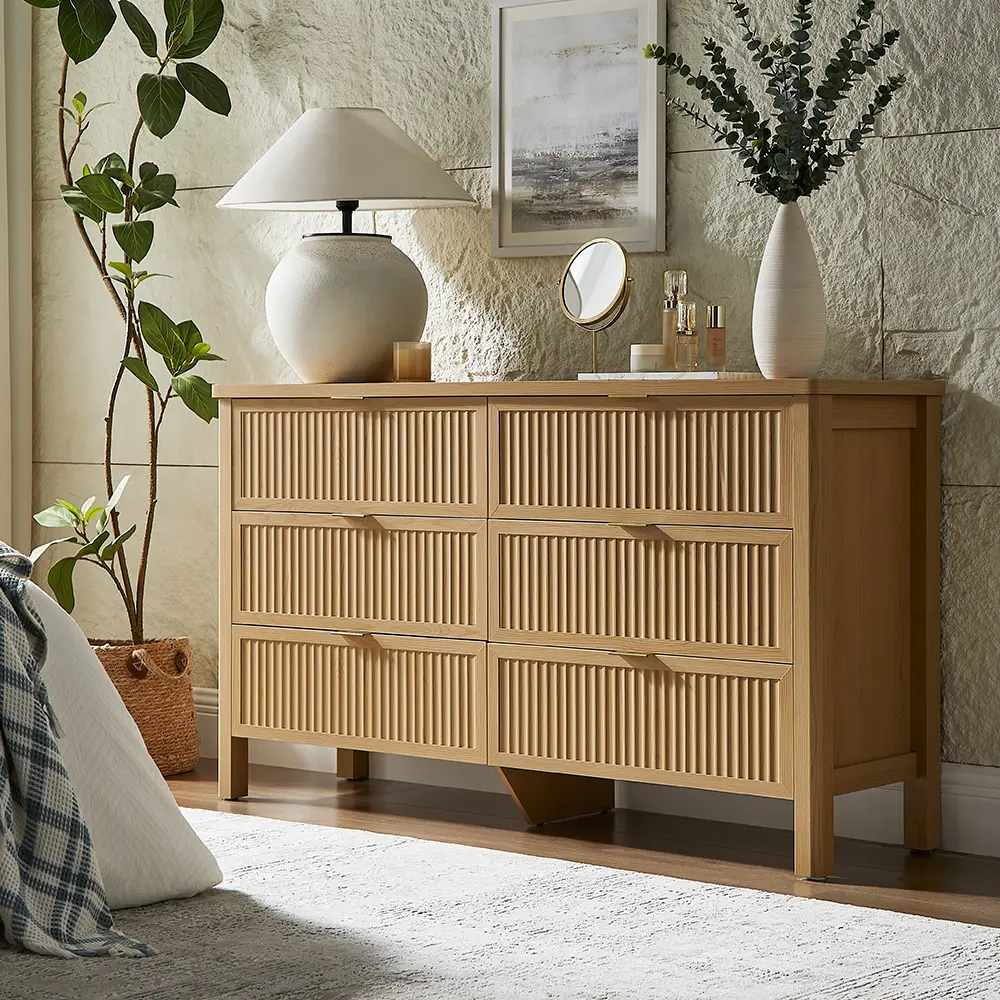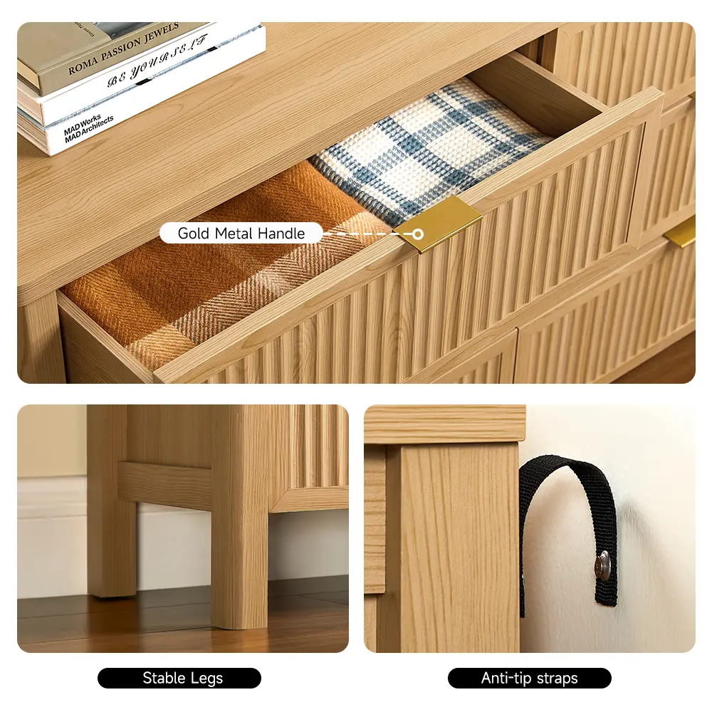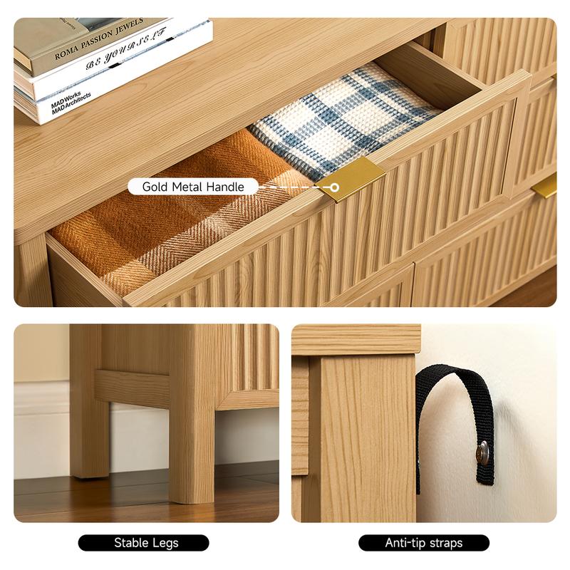 ·Elegance Fluted Bedroom Dresser: The distinctive wave-like fluted panel enhances the texture and spatial presence of this bedroom dresser. The wood top adorned with natural oak veins, while the smooth curved edge exudes an aura of elegance, provide a great decor for your home. The gold metal handle and wood legs add to its contemporary vibe, creating a personalized and distinctive aesthetic