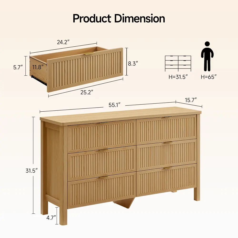 ·Ample Storage Space: The wood dresser offers 6 smooth-gliding drawers, size is 25.2"x 11.2" x 8.3" , ideal for storing clothes, accessories, and cosmetics. The spacious 55" x 16" top thicking surface allows for displaying personal items like photos or artwork, enhancing the living space's aesthetic and functionality. Each drawer is supported by metal glides, ensuring smooth and noise-free operation.This dresser offers an array of possibilities for your home organization