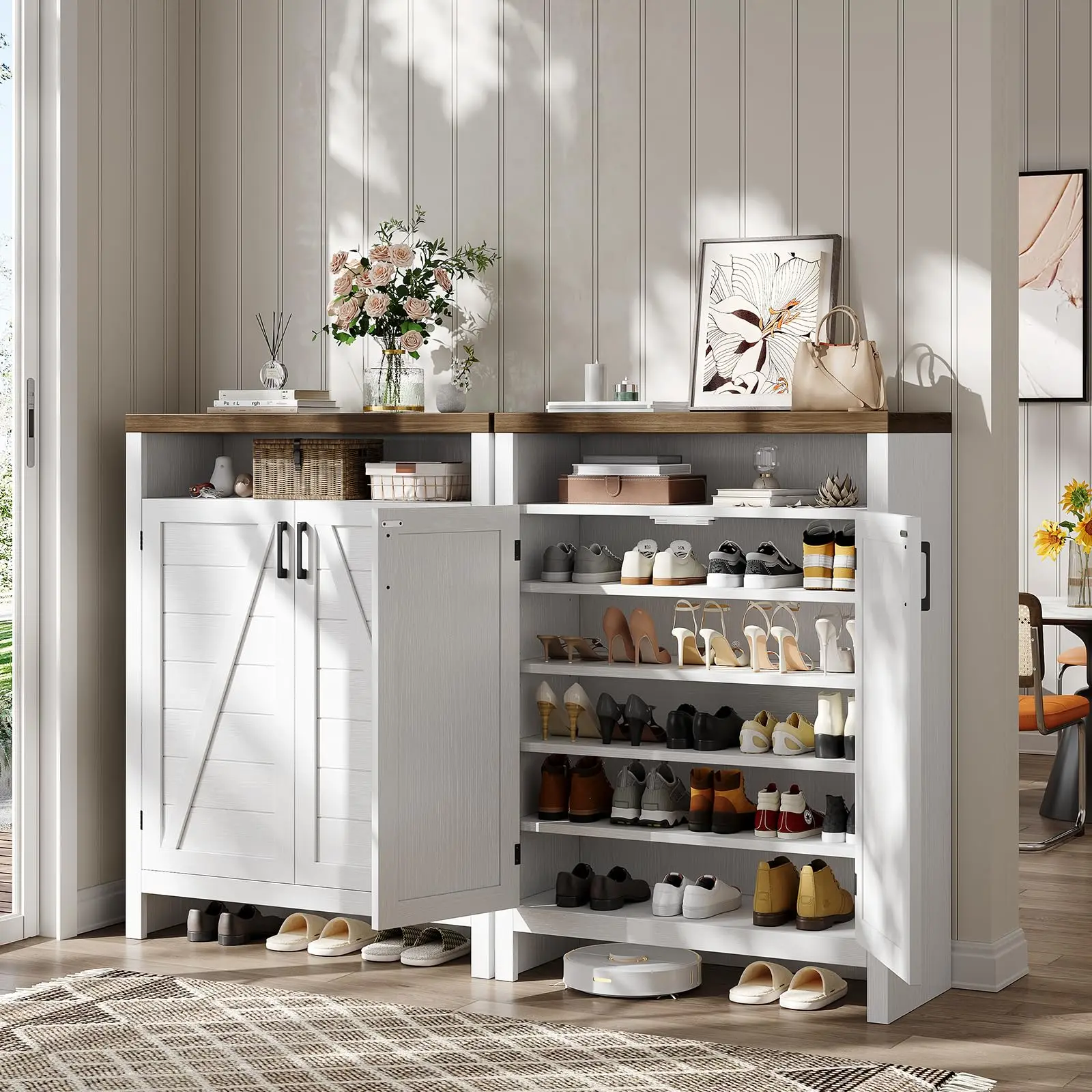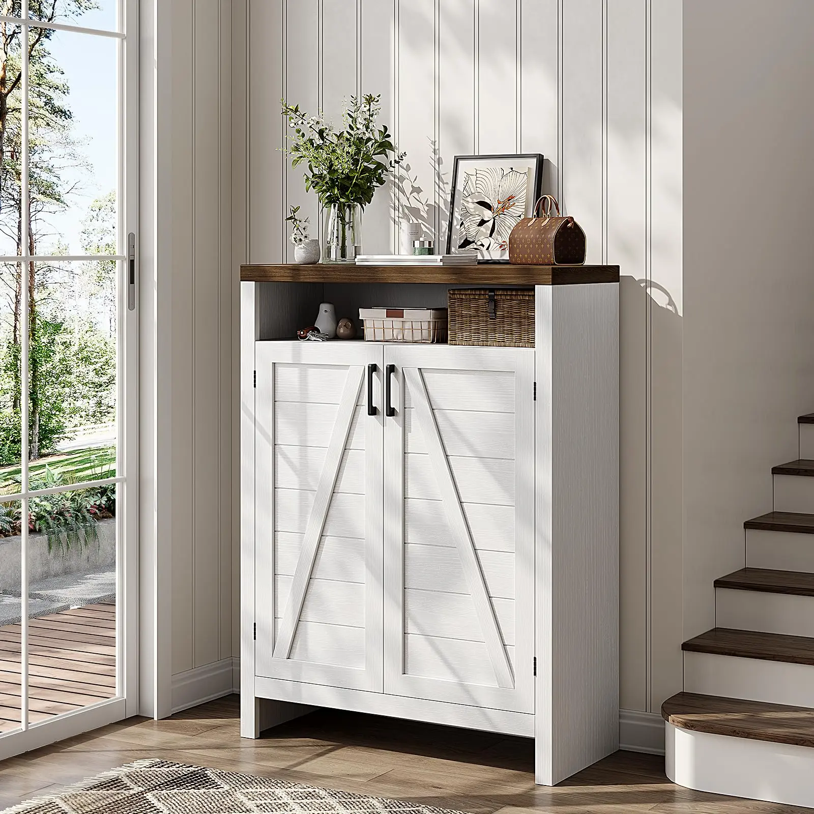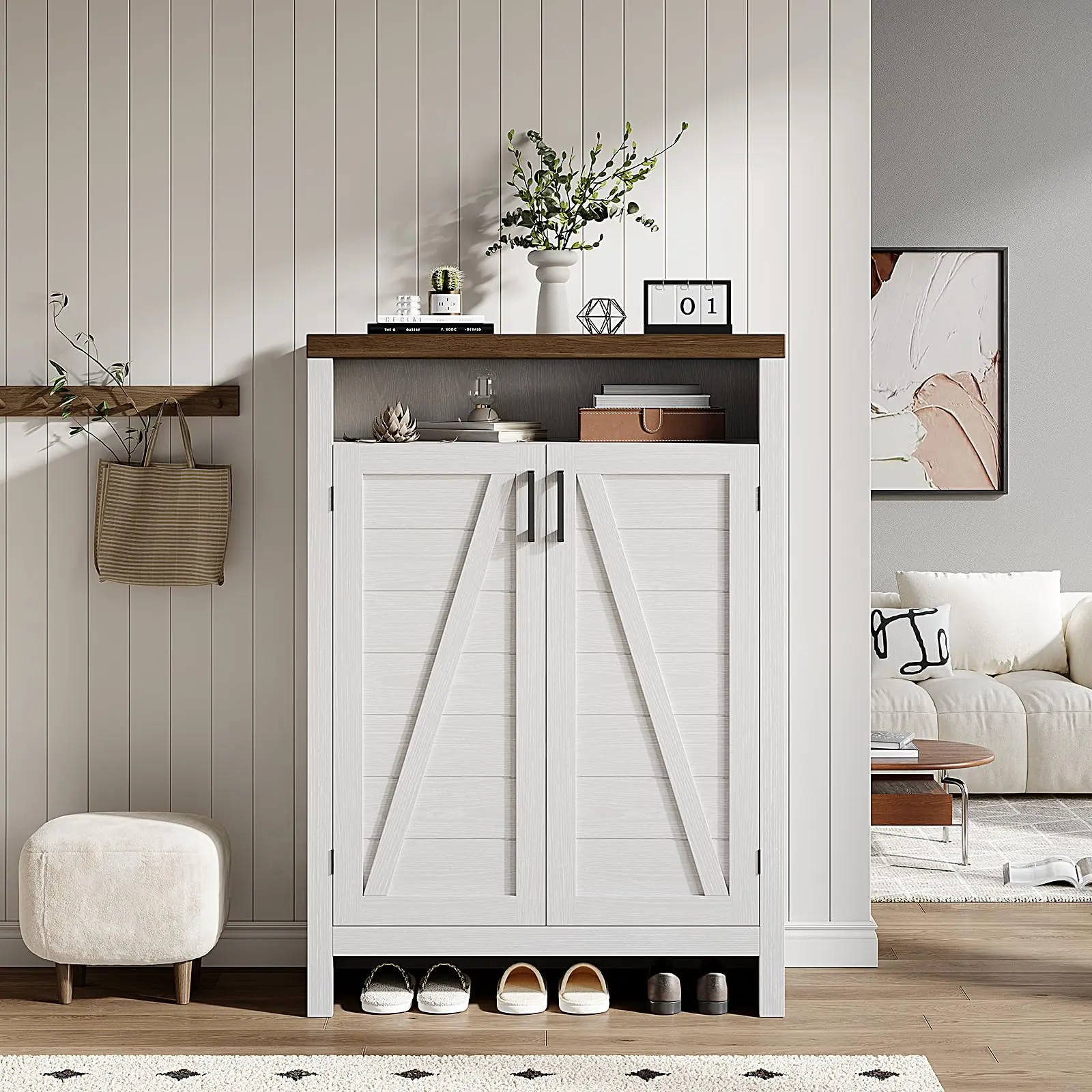·Farmhouse Shoes Cabinet: Classic white and natural brown tones with vintage handles complement a variety of interior motifs, and a strong farmhouse style design adds a natural rustic beauty to your home, perfect for entrances, hallways, foyers bedrooms or living rooms