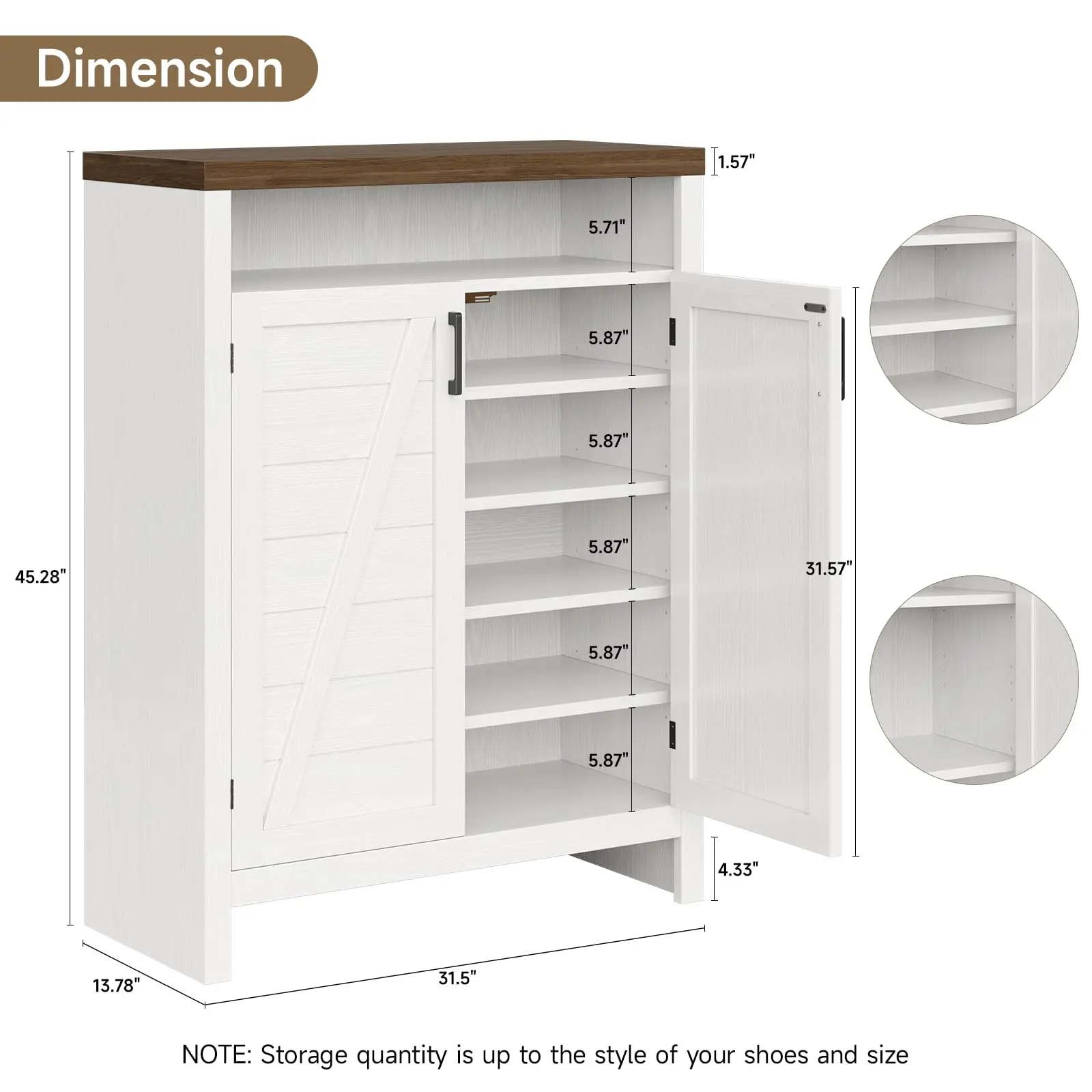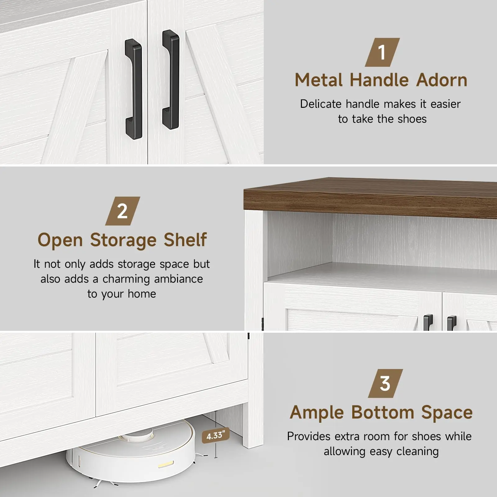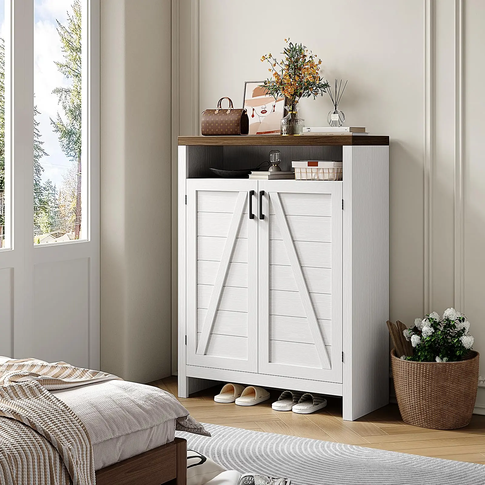 ·Farmhouse Shoes Cabinet: Classic white and natural brown tones with vintage handles complement a variety of interior motifs, and a strong farmhouse style design adds a natural rustic beauty to your home, perfect for entrances, hallways, foyers bedrooms or living rooms