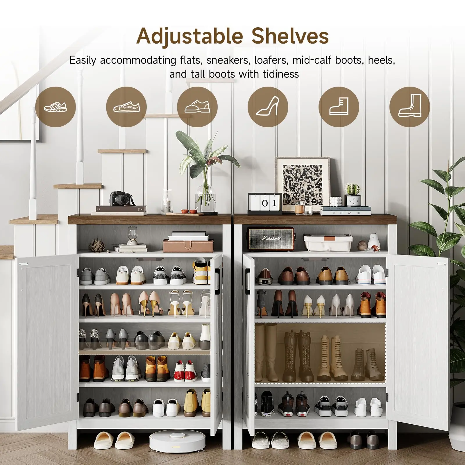 ·Practical Design: The ingenious design of the cabinet bottom can meet easy cleaning by the robot, and the shoe closet is equipped with a top panel and open storage that can not only display photo albums and decorations, but also store bags, glasses and other small items, which is practical and beautiful