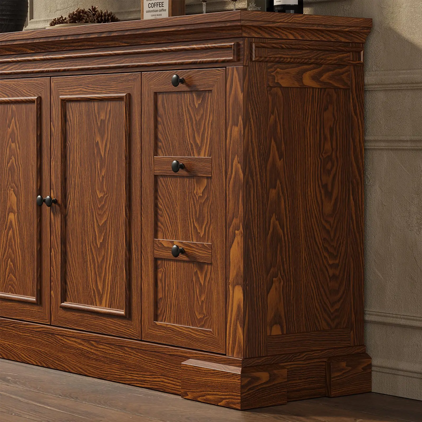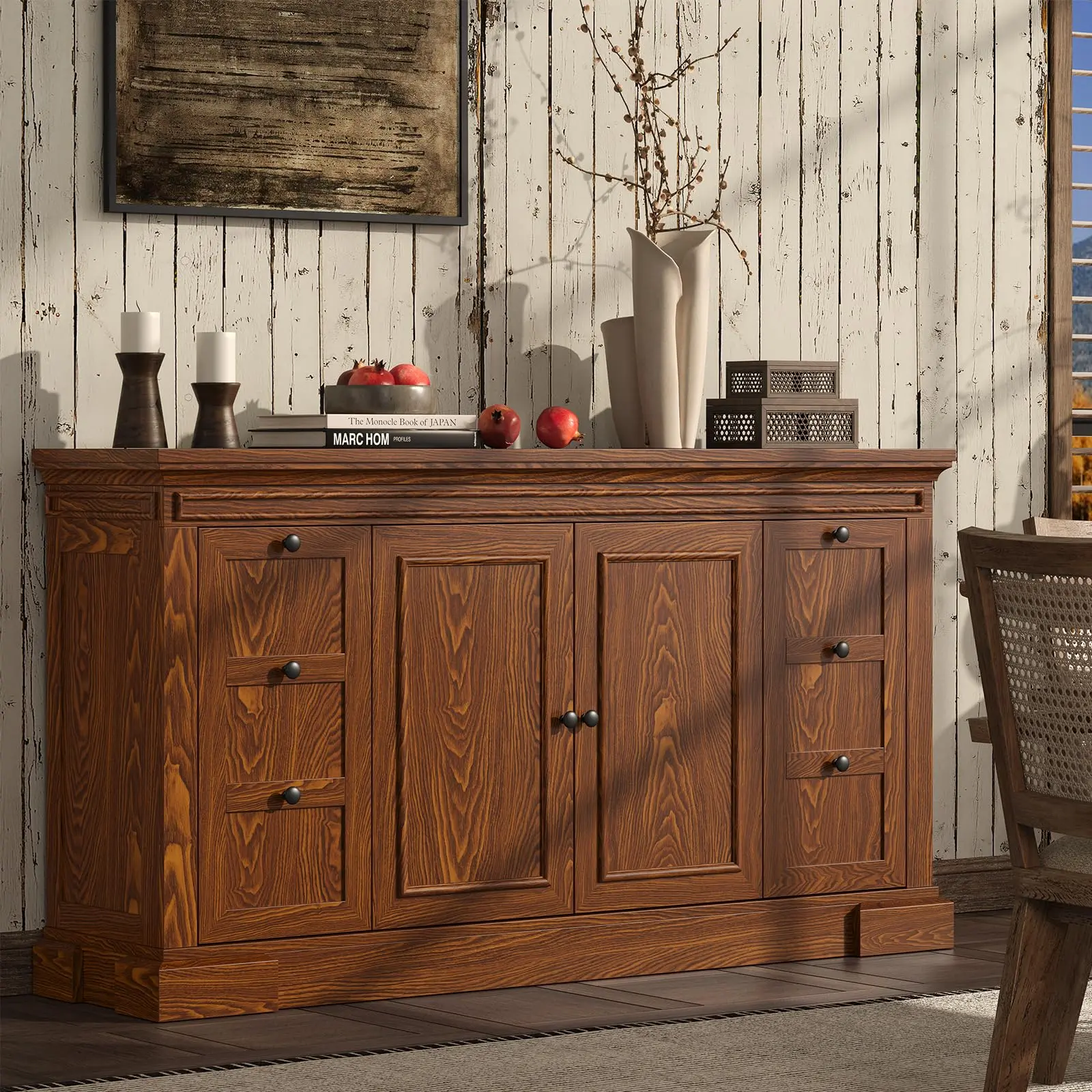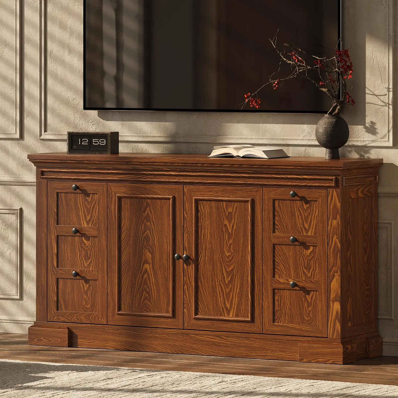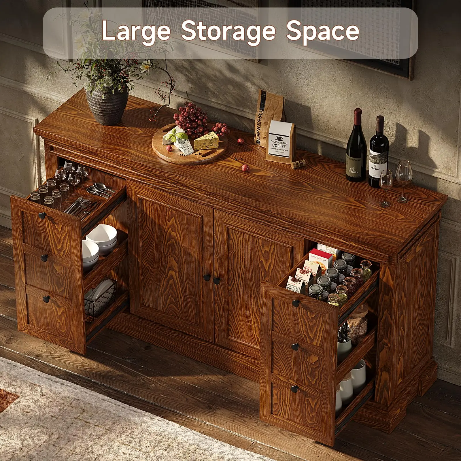Designed for both rustic charm and modern utility, this 63-inch American retro buffet cabinet brings elegance and exceptional storage to your home. Featuring a rich wood finish, classic black metal handles, and detailed beveled panels, it adds vintage-inspired character to any space. With a sturdy tabletop supporting up to 250 pounds and ample interior space—including six linked drawers and two soft-close doors—it keeps dishes, appliances, and linens beautifully organized. Versatile enough to serve as a coffee bar, living room accent, or entryway console, this cabinet combines timeless style with everyday durability, all backed by clear, video-assisted assembly.