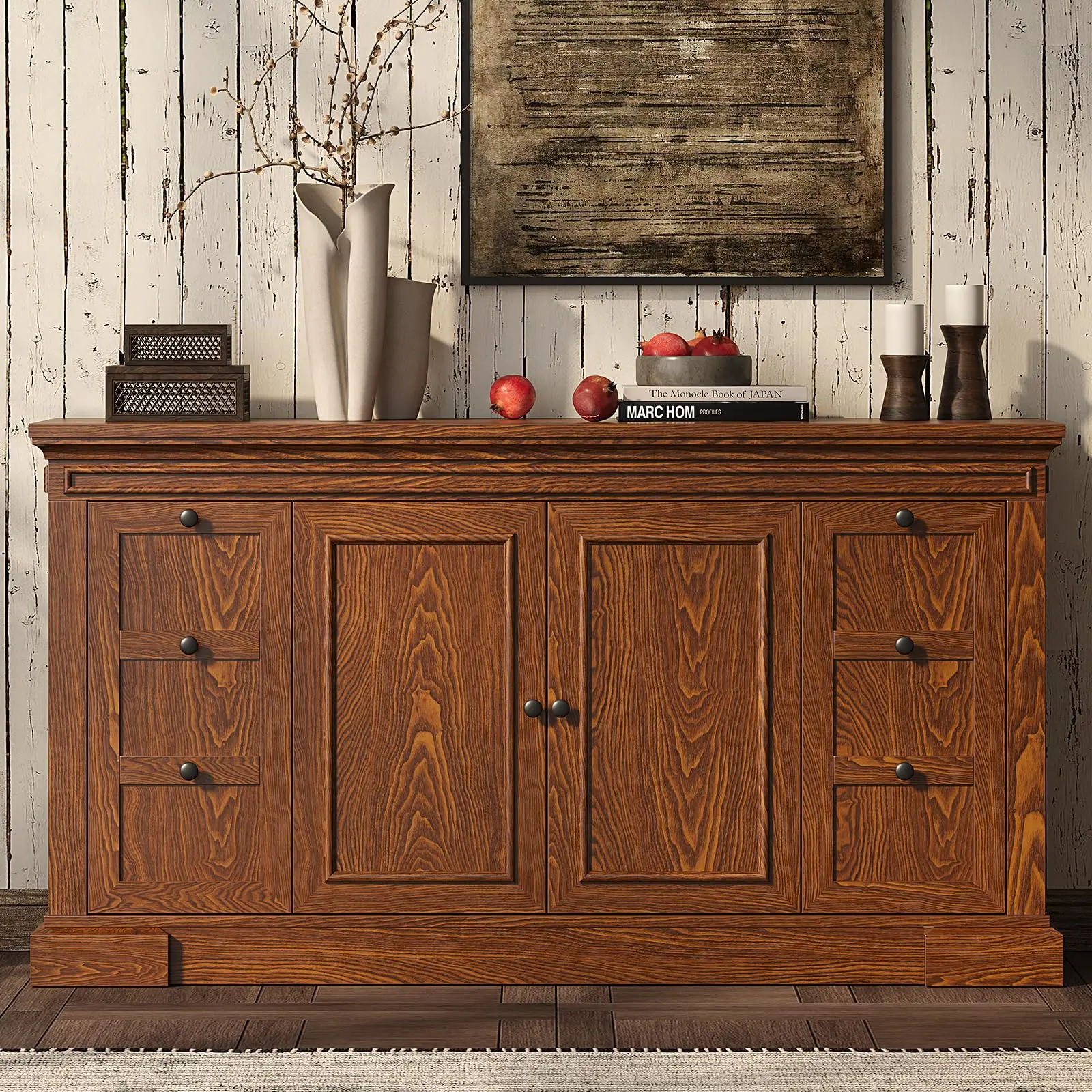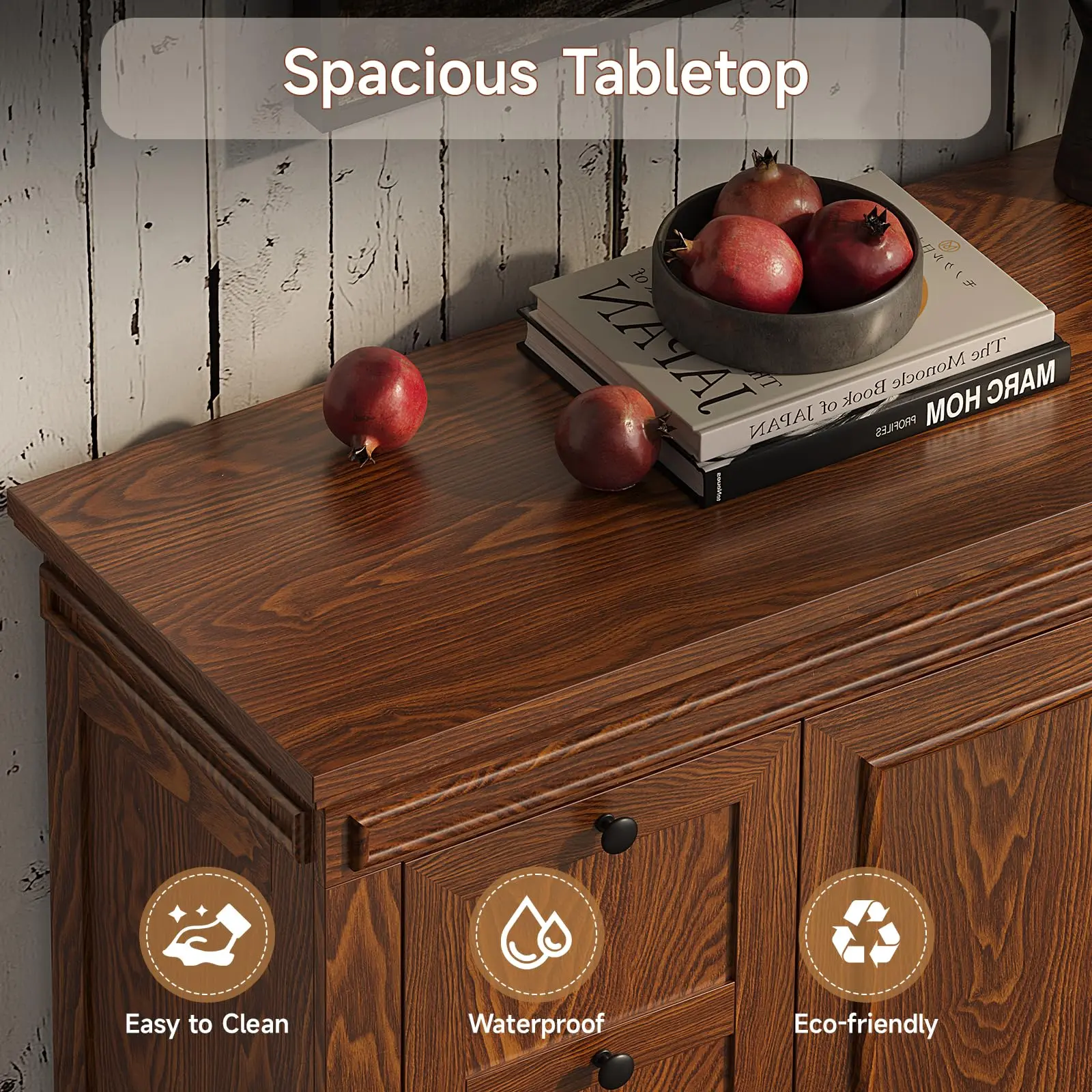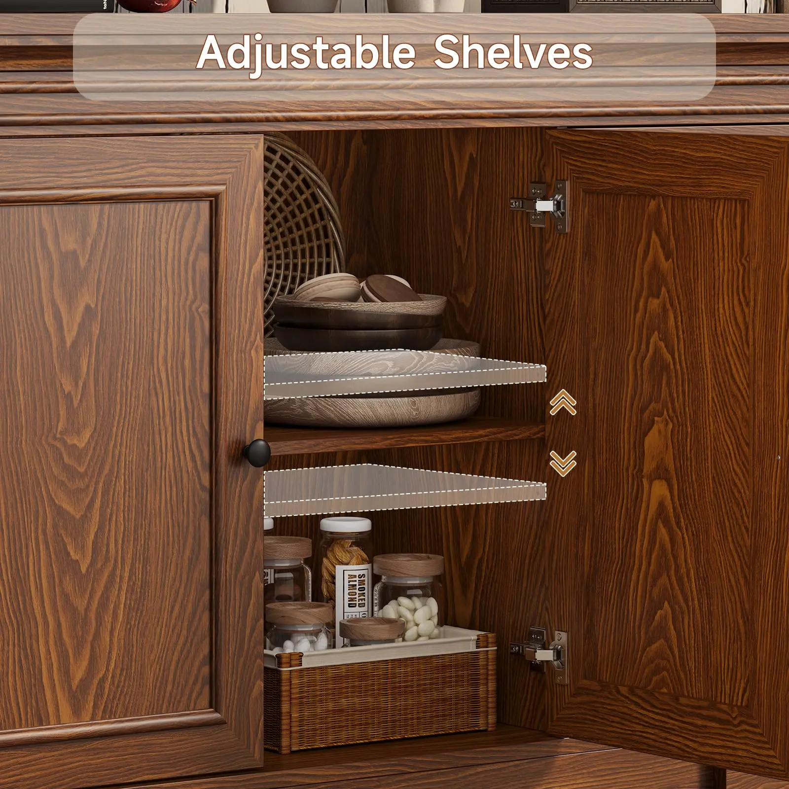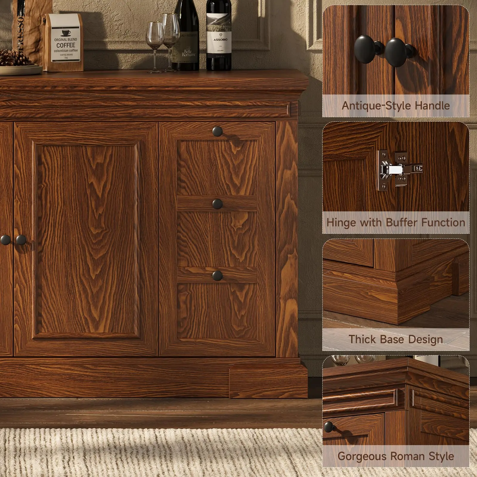 Designed for both rustic charm and modern utility, this 63-inch American retro buffet cabinet brings elegance and exceptional storage to your home. Featuring a rich wood finish, classic black metal handles, and detailed beveled panels, it adds vintage-inspired character to any space. With a sturdy tabletop supporting up to 250 pounds and ample interior space—including six linked drawers and two soft-close doors—it keeps dishes, appliances, and linens beautifully organized. Versatile enough to serve as a coffee bar, living room accent, or entryway console, this cabinet combines timeless style with everyday durability, all backed by clear, video-assisted assembly.