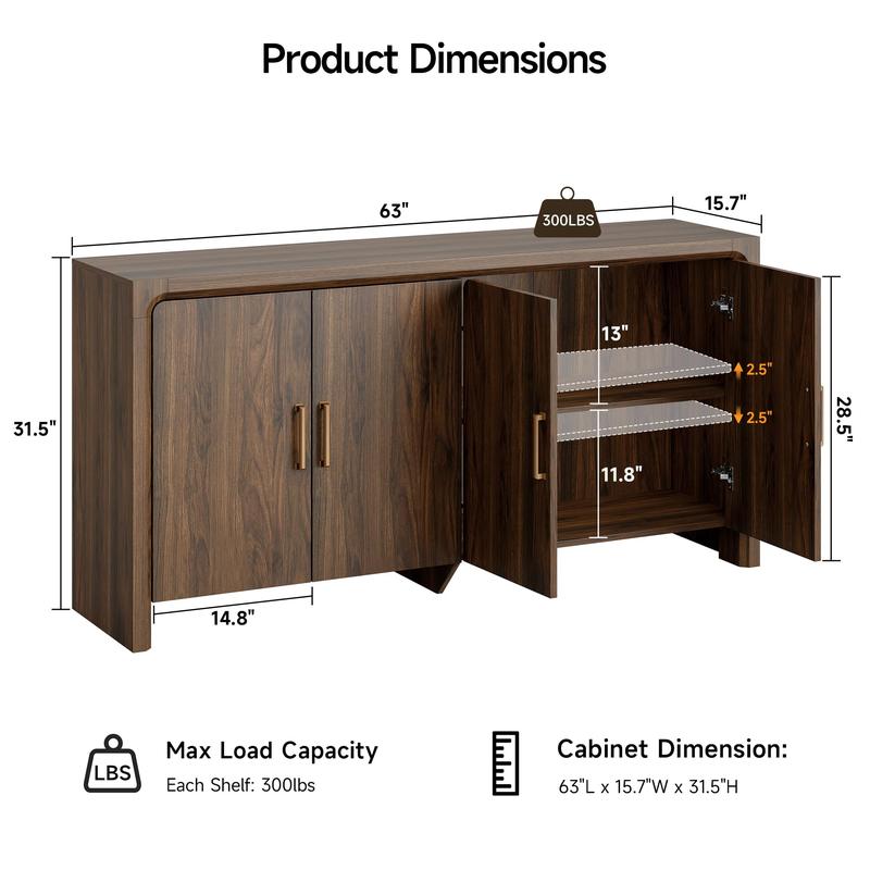 ·LARGE STORAGE CABINET: The Large sideboard buffet size: 63"W x 15.7"D x 31.5"H. The storage cabinet with 4 shelves and 4 doors offers ample storage space. The 2 adjustable shelves in the middle can accommodate items of various sizes flexibly