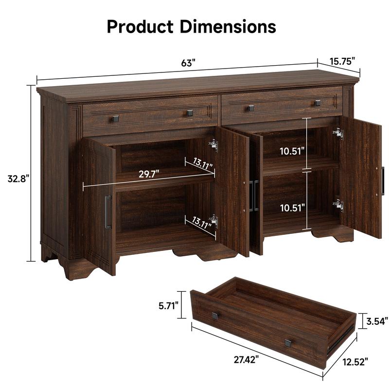 Store, style, and serve with this XL farmhouse buffet cabinet—crafted for real life and built to last. Measuring a generous 63” wide, its spacious interior and FSC-certified engineered wood frame offer twice the storage of standard cabinets, easily organizing everything from holiday china to everyday essentials. Designed for effortless versatility, it transforms seamlessly into a coffee bar, TV console, or entryway organizer, all while resisting scratches, spills, and daily wear. Assembly is a breeze with numbered parts and visual instructions, and our dedicated support team ensures a smooth, worry-free experience from start to finish.
