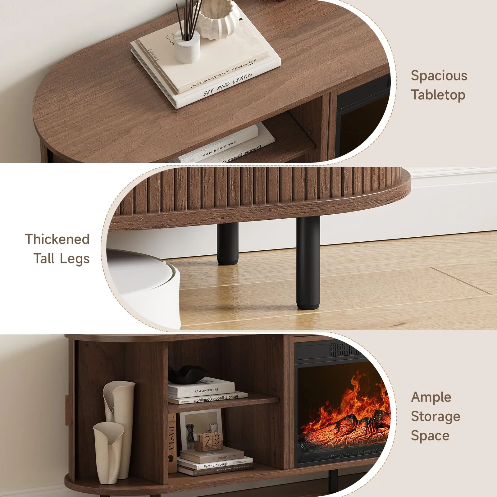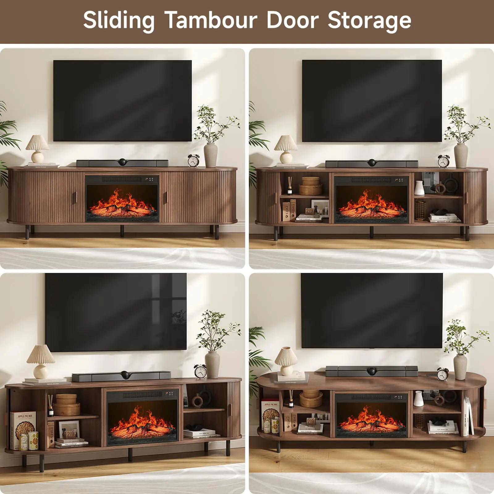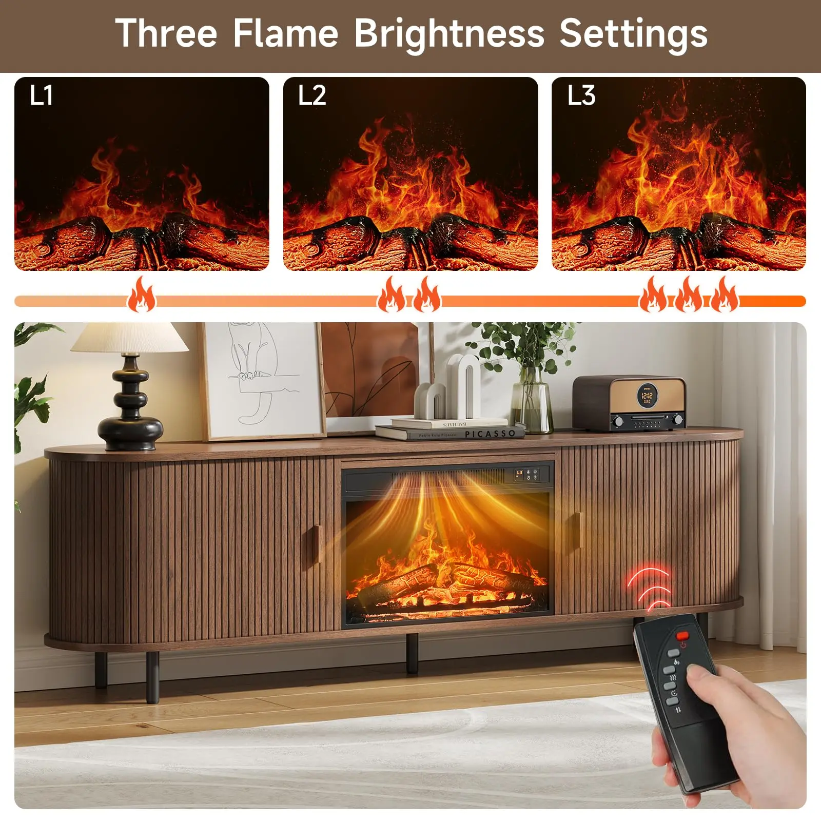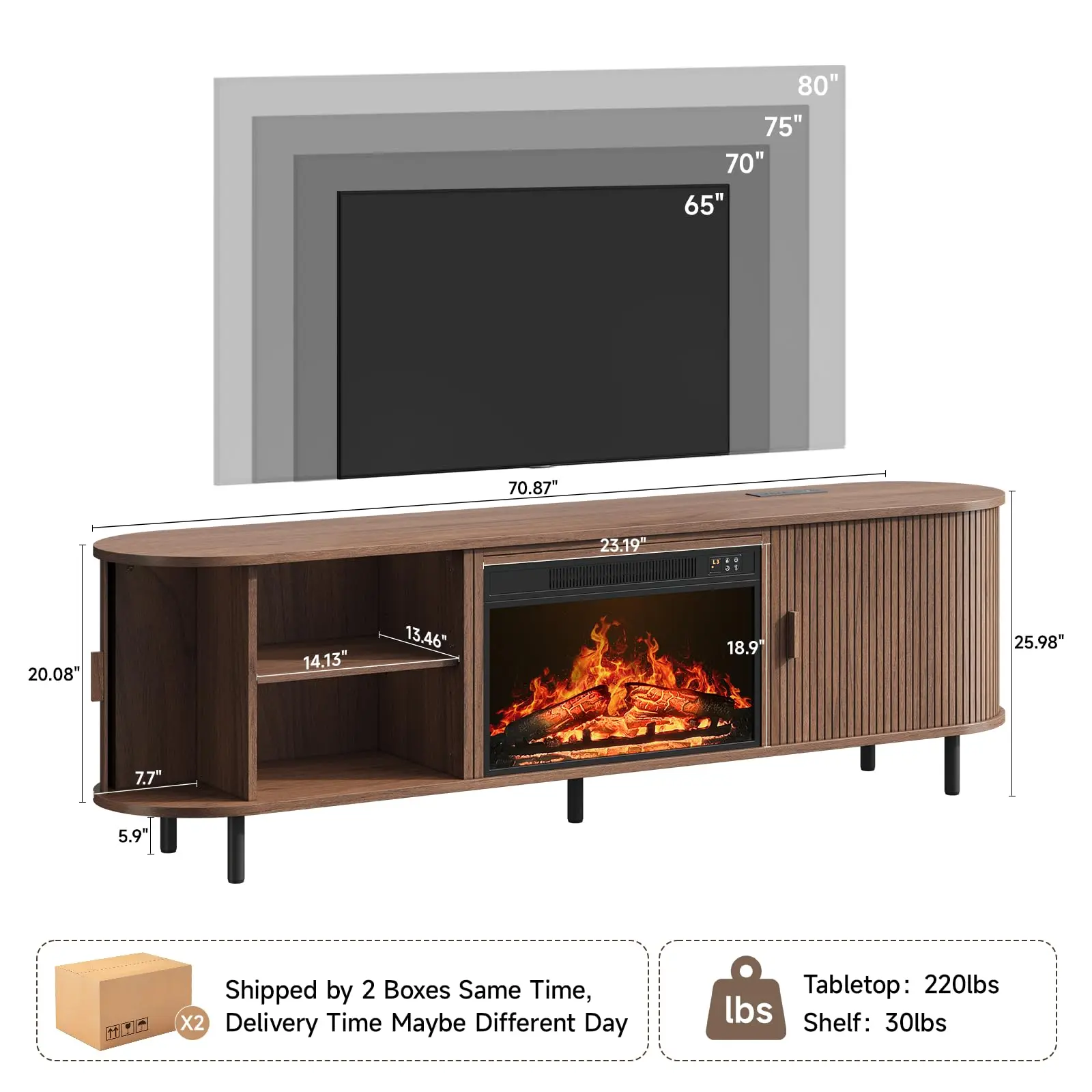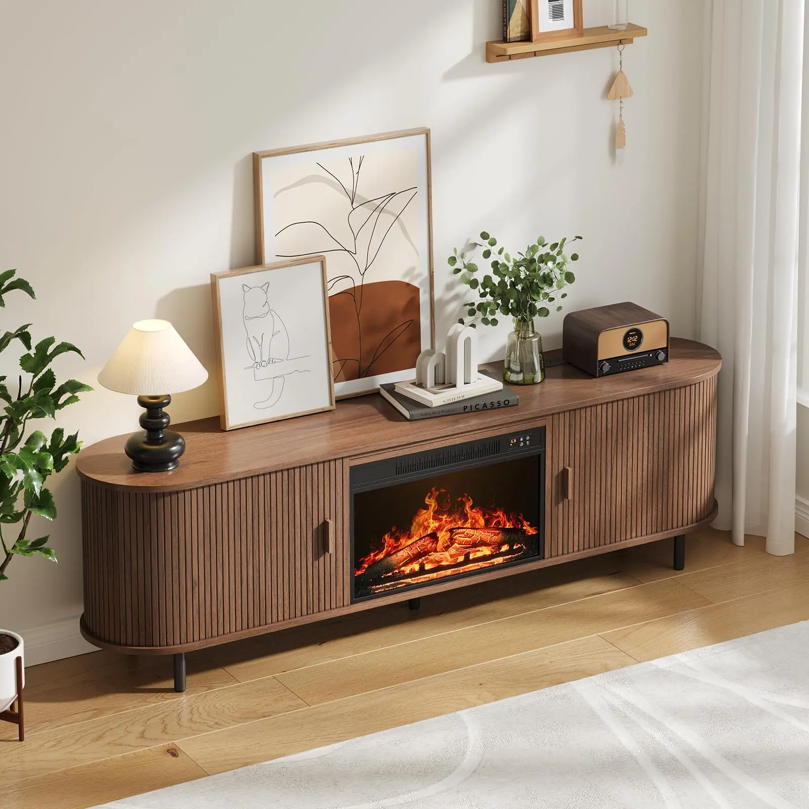 This 70.8" fireplace TV stand combines elegant mid-century design with modern functionality. Featuring a 23" electric fireplace with realistic 3D flames and adjustable heating (62°F-82°F), it accommodates 80" TVs while offering convenient charging with built-in outlets. The fluted sliding doors conceal 6 storage spaces with adjustable shelves, creating an organized entertainment center that blends style and practicality.