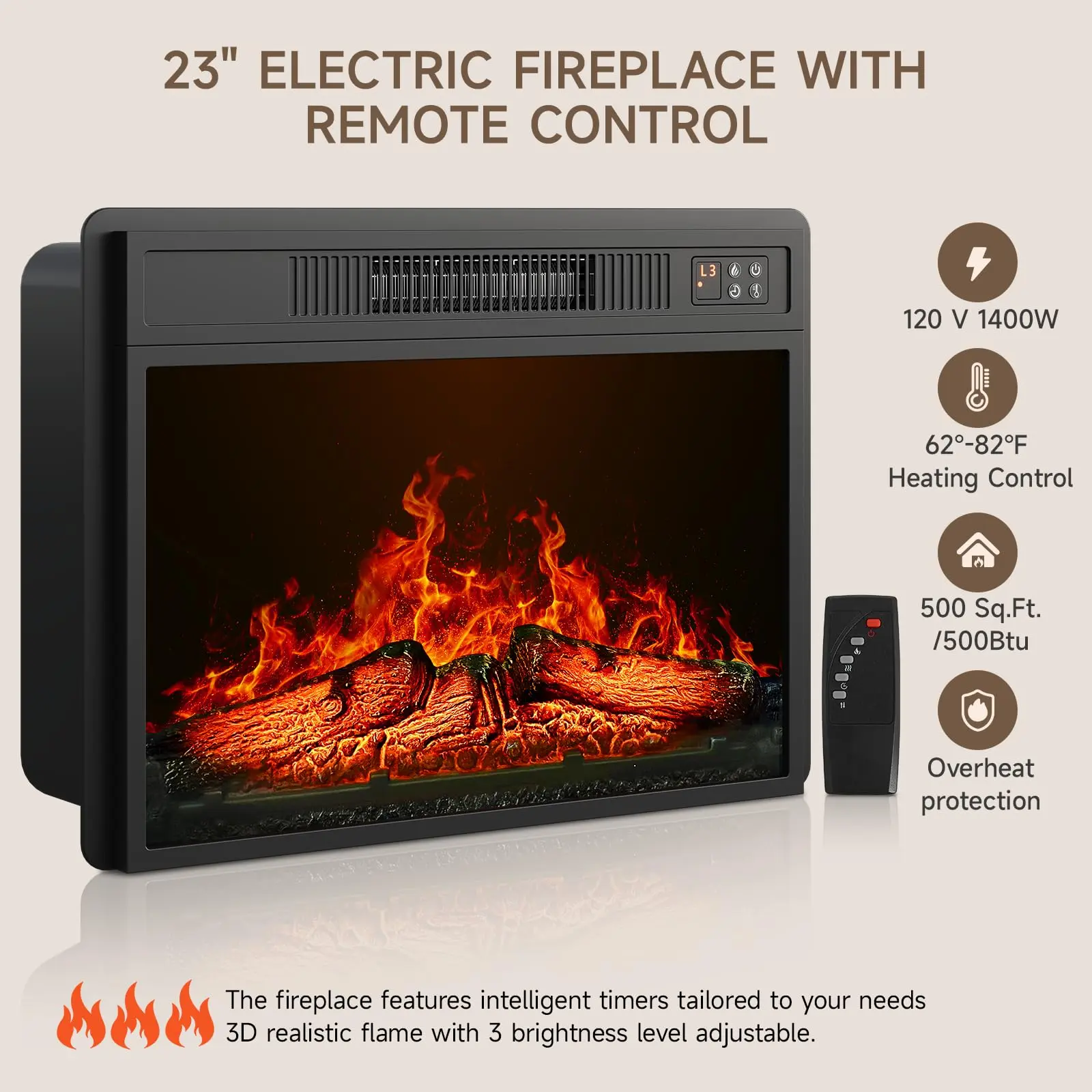 ·23" Electric Fireplace: 3D flames with 4 brightness levels and remote control