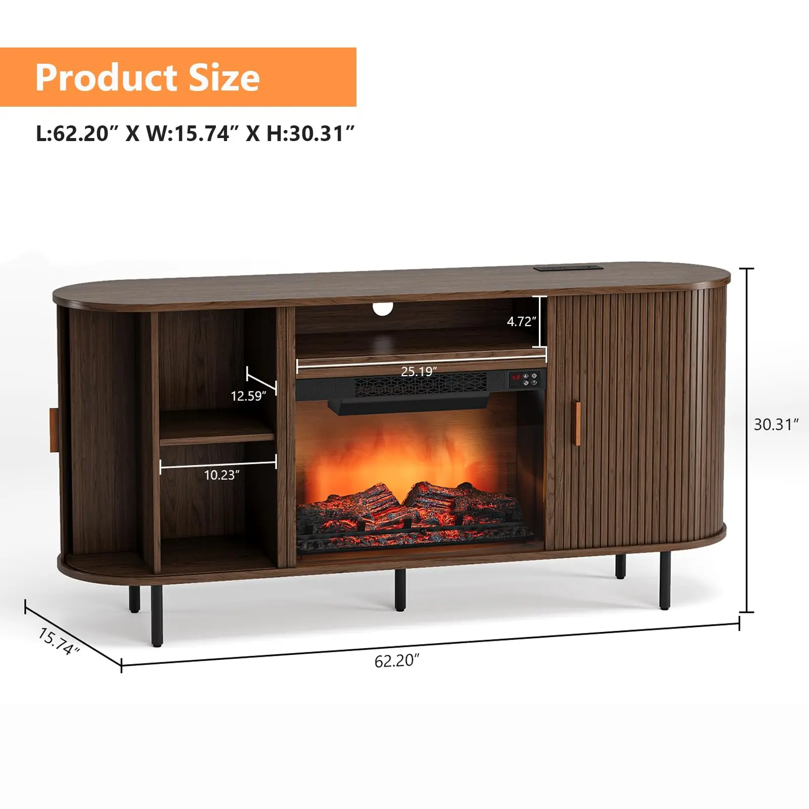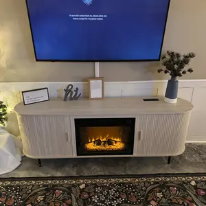 This 63" fireplace TV stand combines modern design with practical function. Featuring a 23" electric fireplace with realistic flames and remote control, it accommodates 70" TVs while providing ample storage. The mid-century style with grooved panels and sliding doors complements any decor.