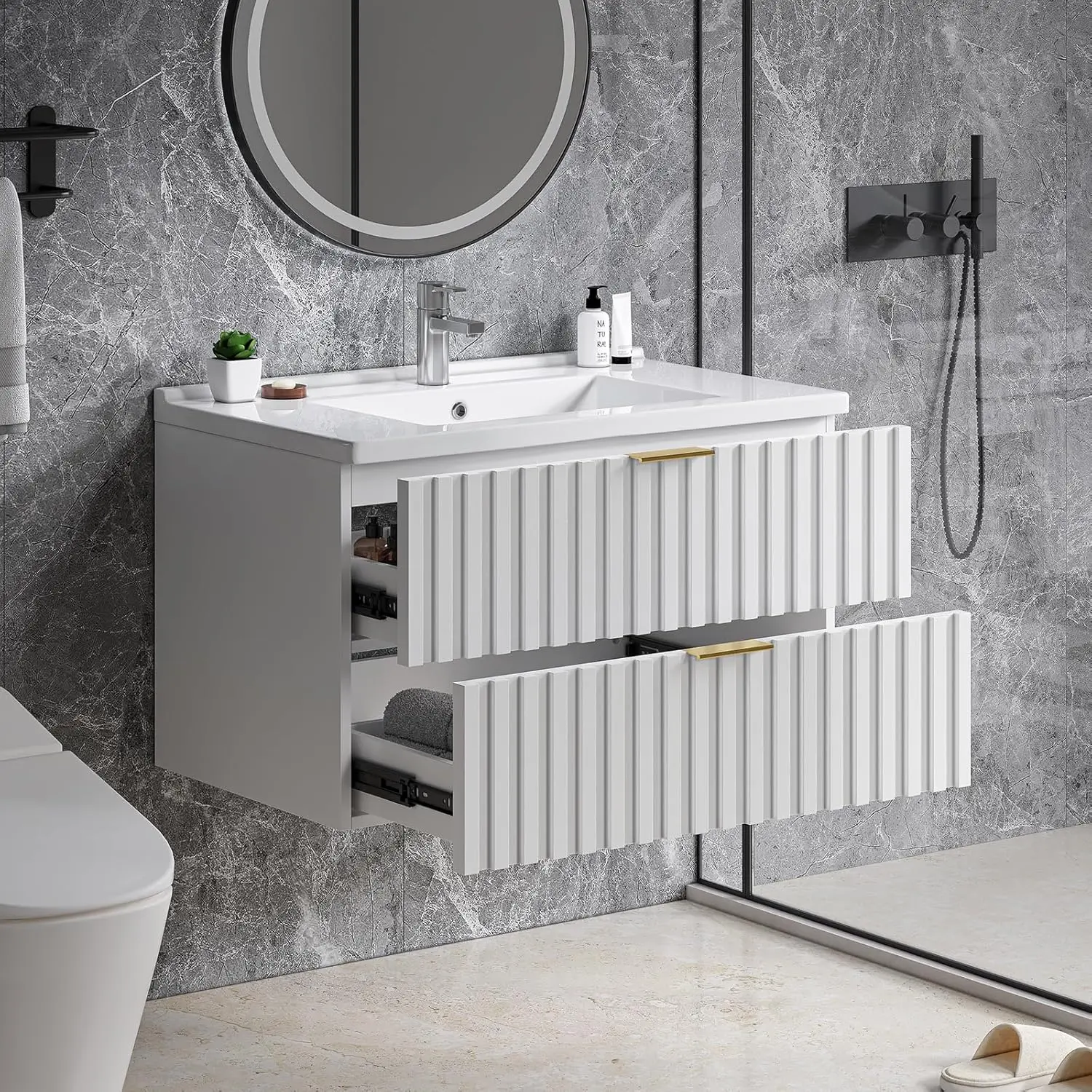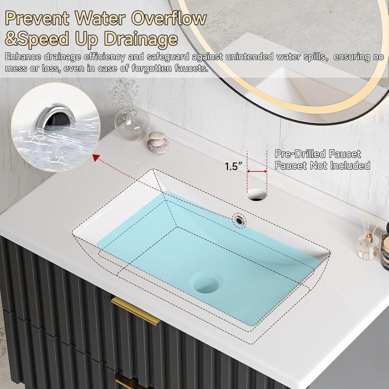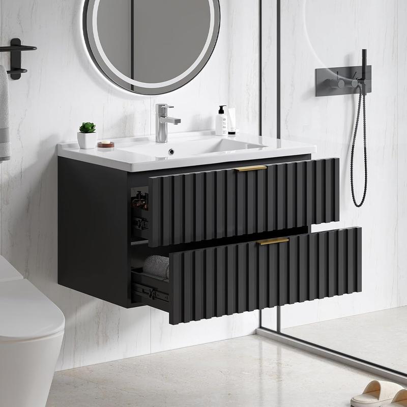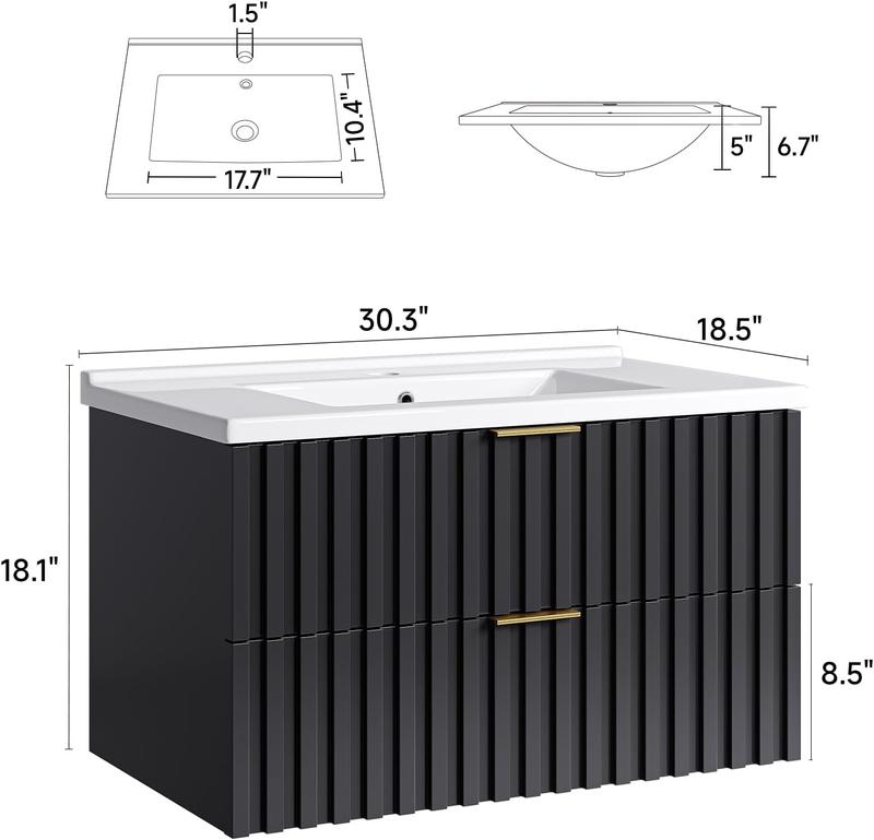 ·【30" Bathroom Vanity with Storage Drawer】Floating bathroom vanity offers ample storage space for all your bathroom essentials. Saving skincare products, toiletries, etc, it has two fluted drawer to keep them all organized. The elegant design, coupled with a sleek finish and golden metal handle, adds a touch of class to any bathroom decor