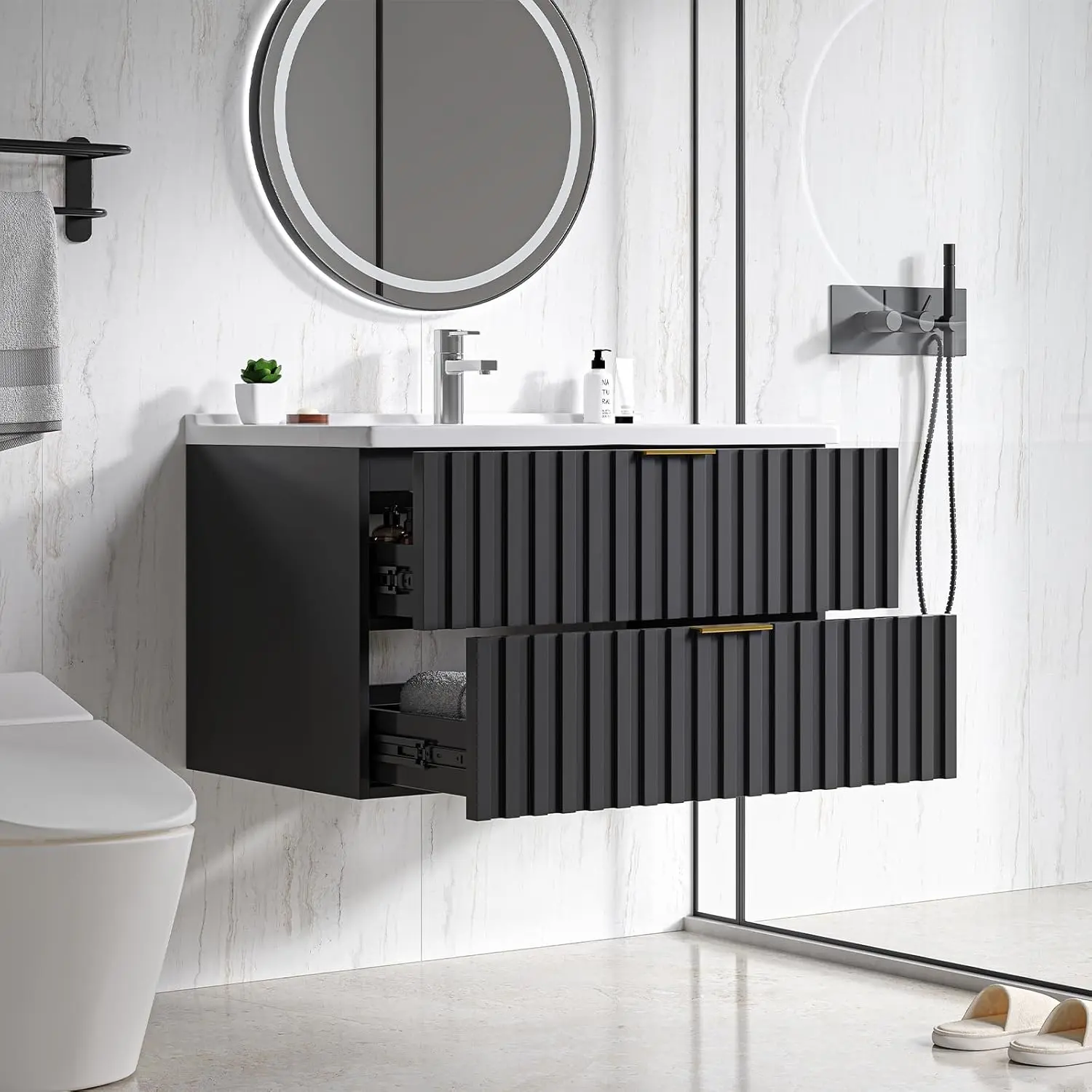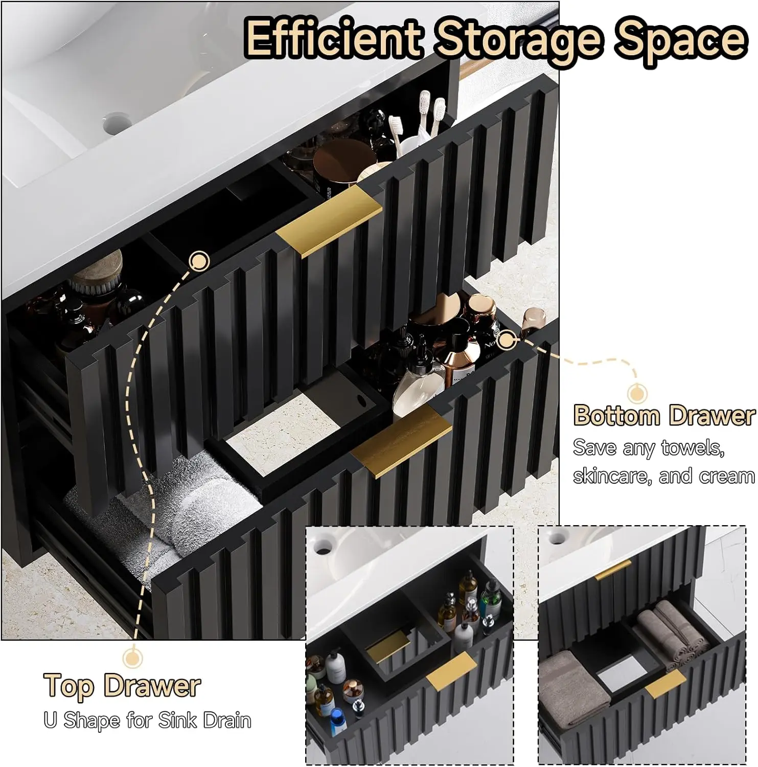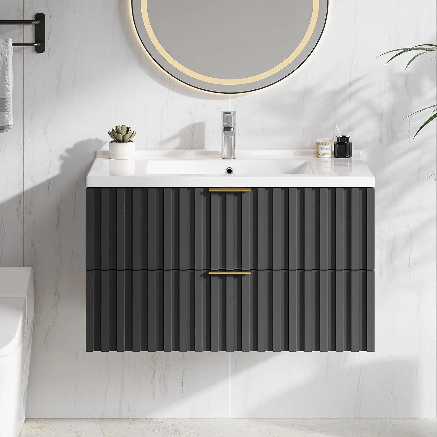 ·【30" Bathroom Vanity with Storage Drawer】Floating bathroom vanity offers ample storage space for all your bathroom essentials. Saving skincare products, toiletries, etc, it has two fluted drawer to keep them all organized. The elegant design, coupled with a sleek finish and golden metal handle, adds a touch of class to any bathroom decor