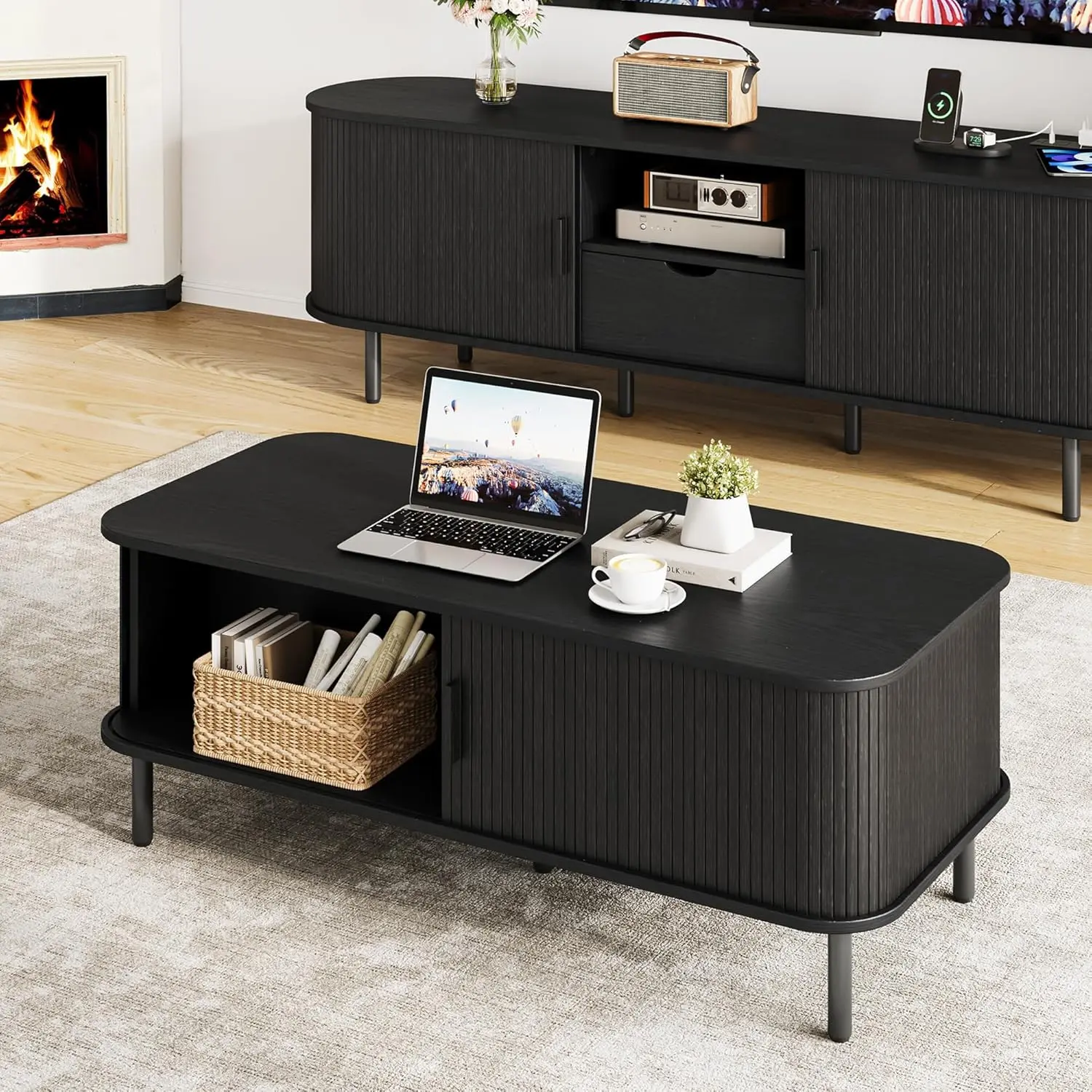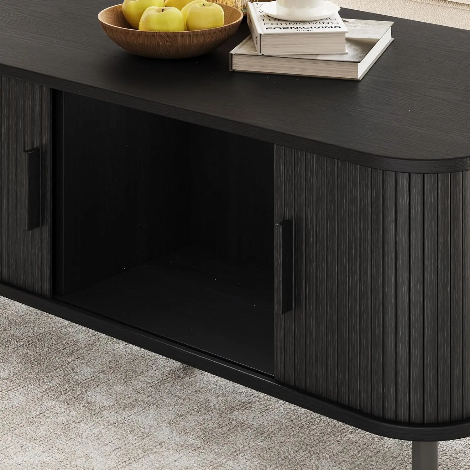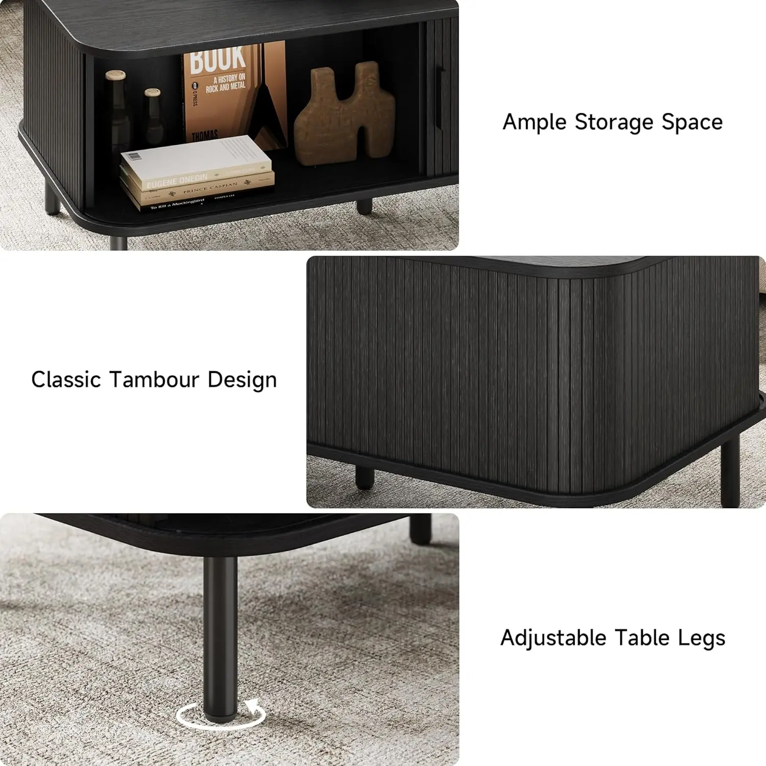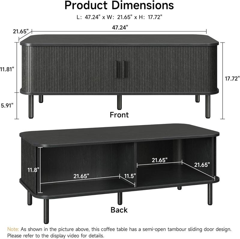 ·Semi-open Tambour Sliding Door Design: The mid century modern coffee table adopts a semi-open tambour sliding door design, which increases practicality while also enhance the beauty of the living room.