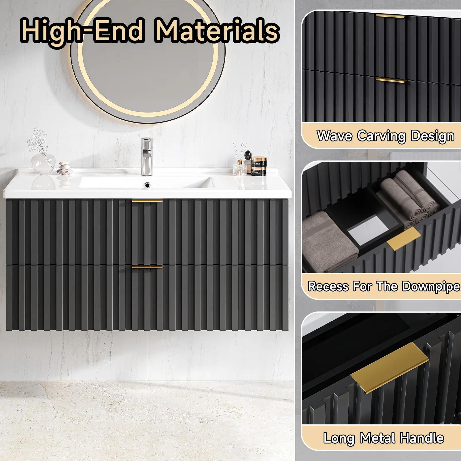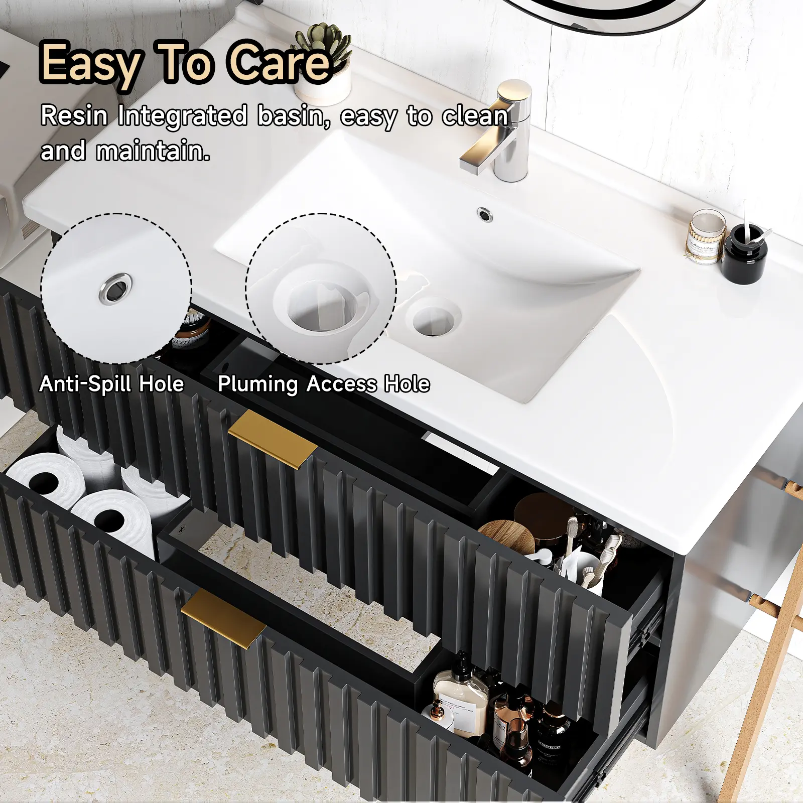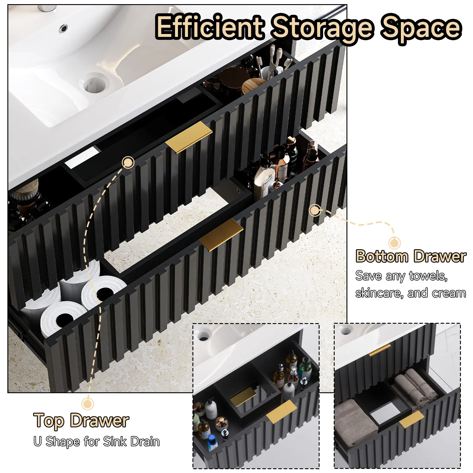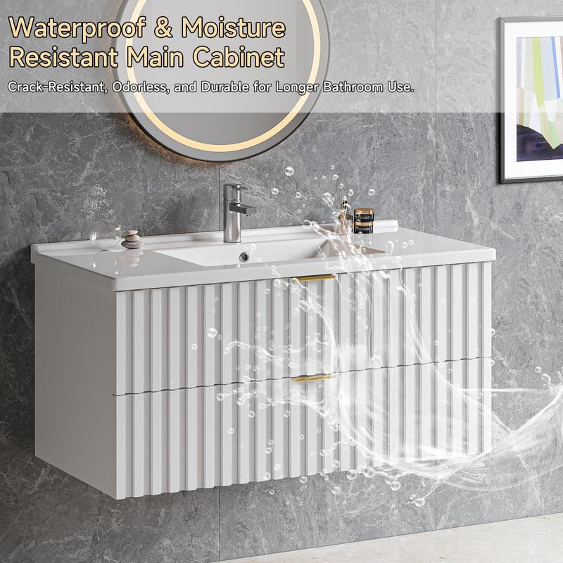 【Bathroom Vanity with Storage Drawers】Floating bathroom vanity offers ample storage space for all your bathroom essentials. Saving skincare products, toiletries, etc, it has two fluted drawer to keep them all organized. The elegant design, coupled with a sleek finish and golden metal handle, adds a touch of class to any bathroom decor
