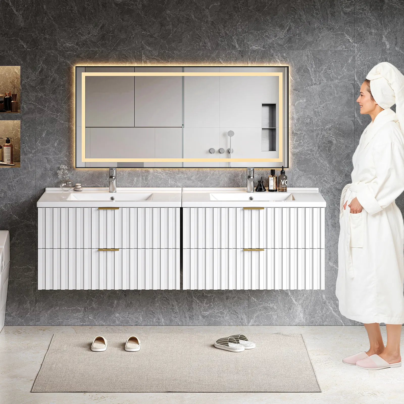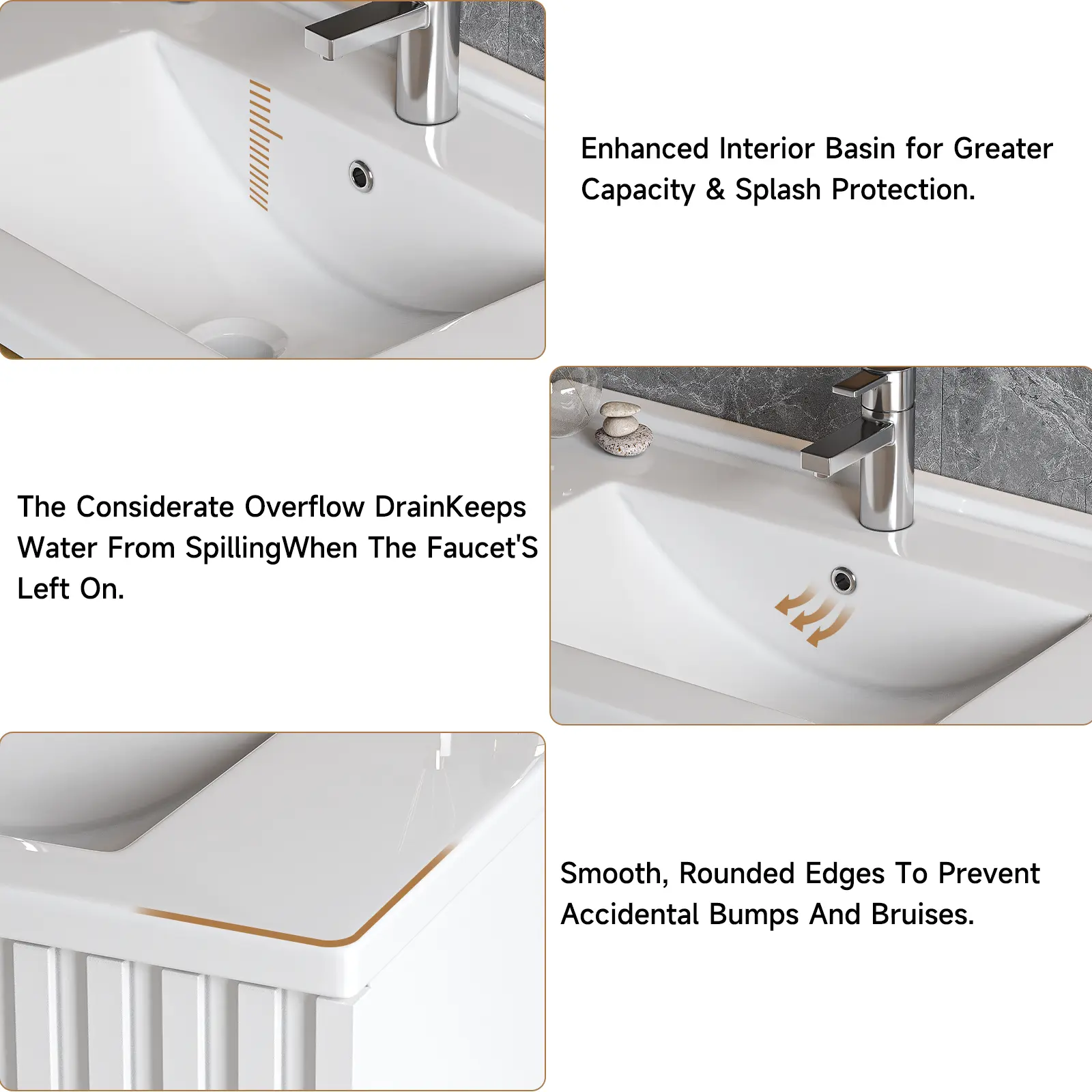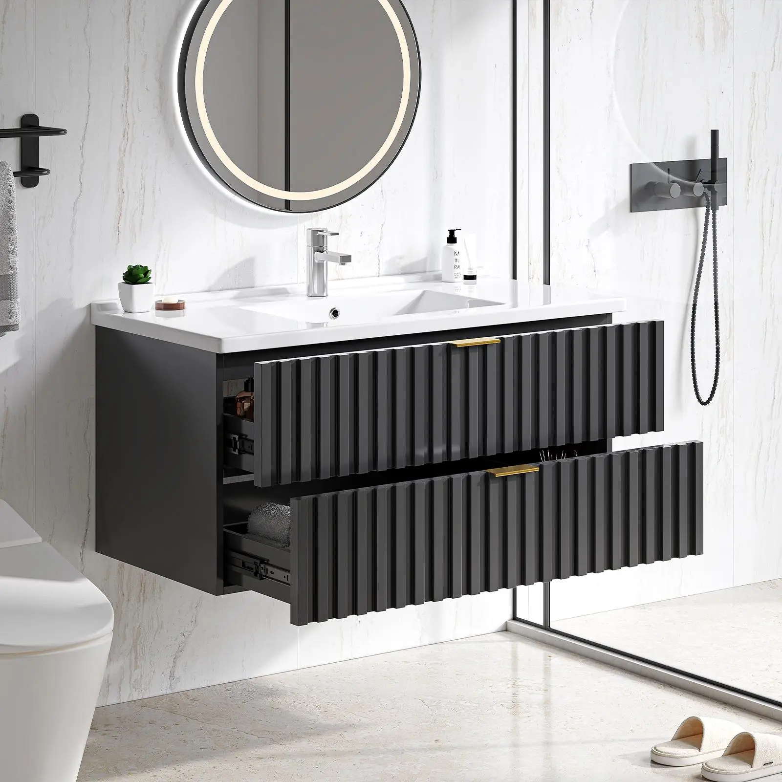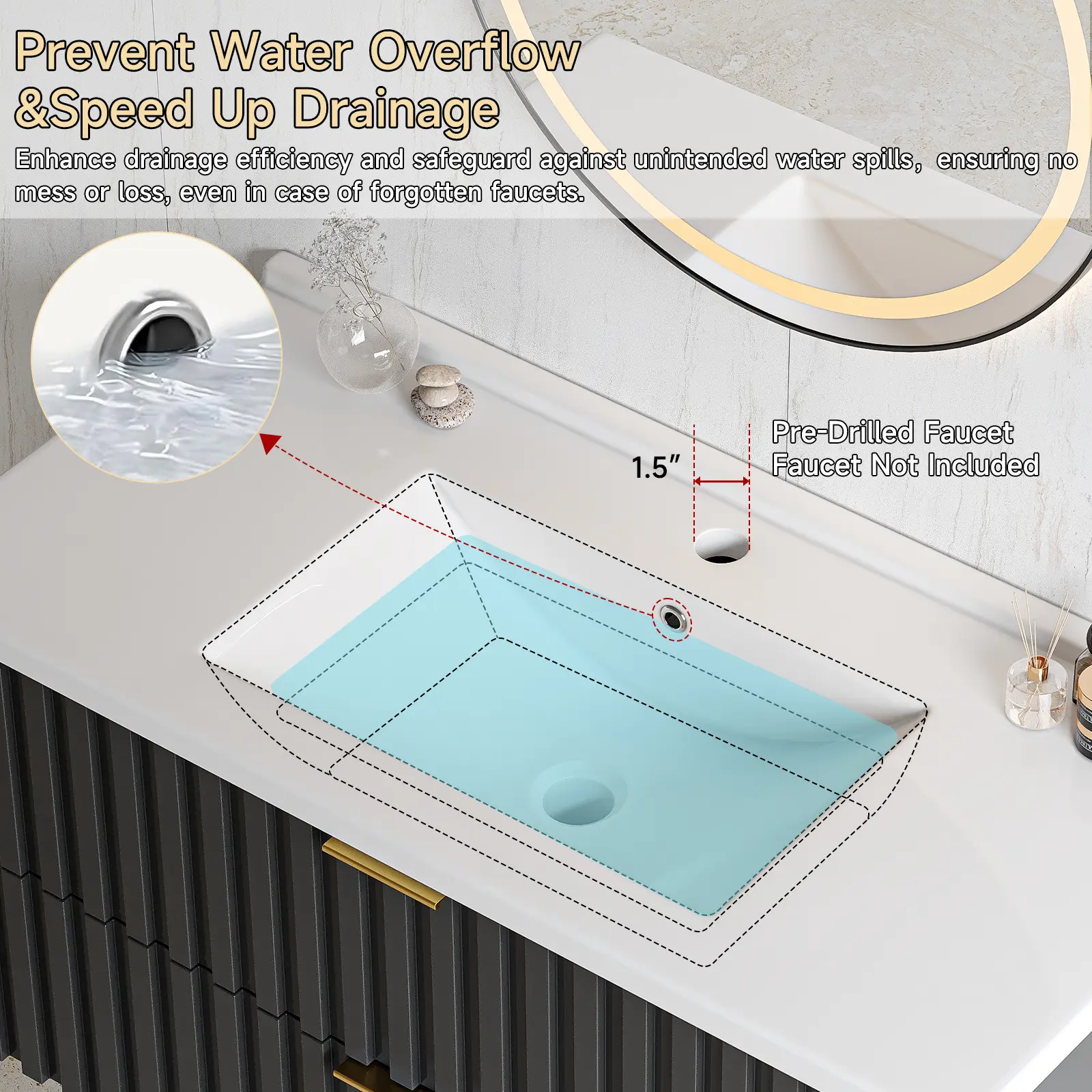 【Bathroom Vanity with Storage Drawers】Floating bathroom vanity offers ample storage space for all your bathroom essentials. Saving skincare products, toiletries, etc, it has two fluted drawer to keep them all organized. The elegant design, coupled with a sleek finish and golden metal handle, adds a touch of class to any bathroom decor