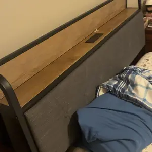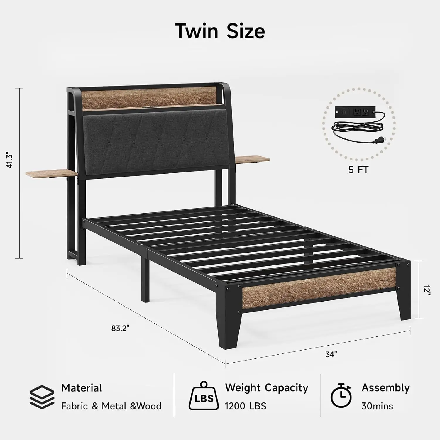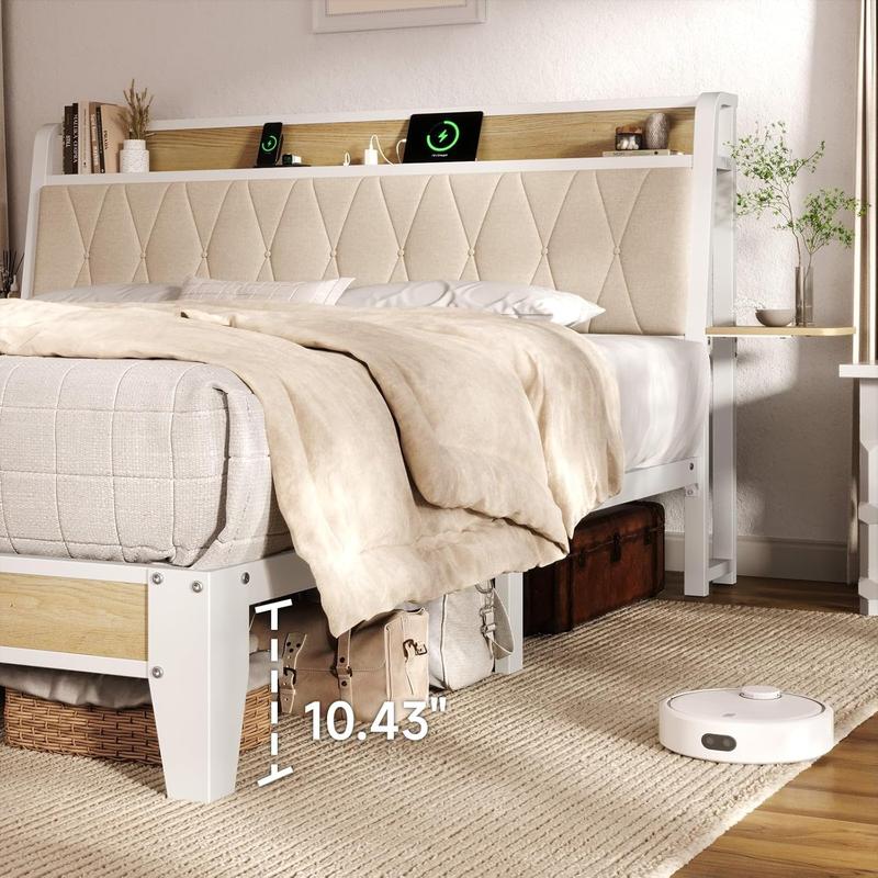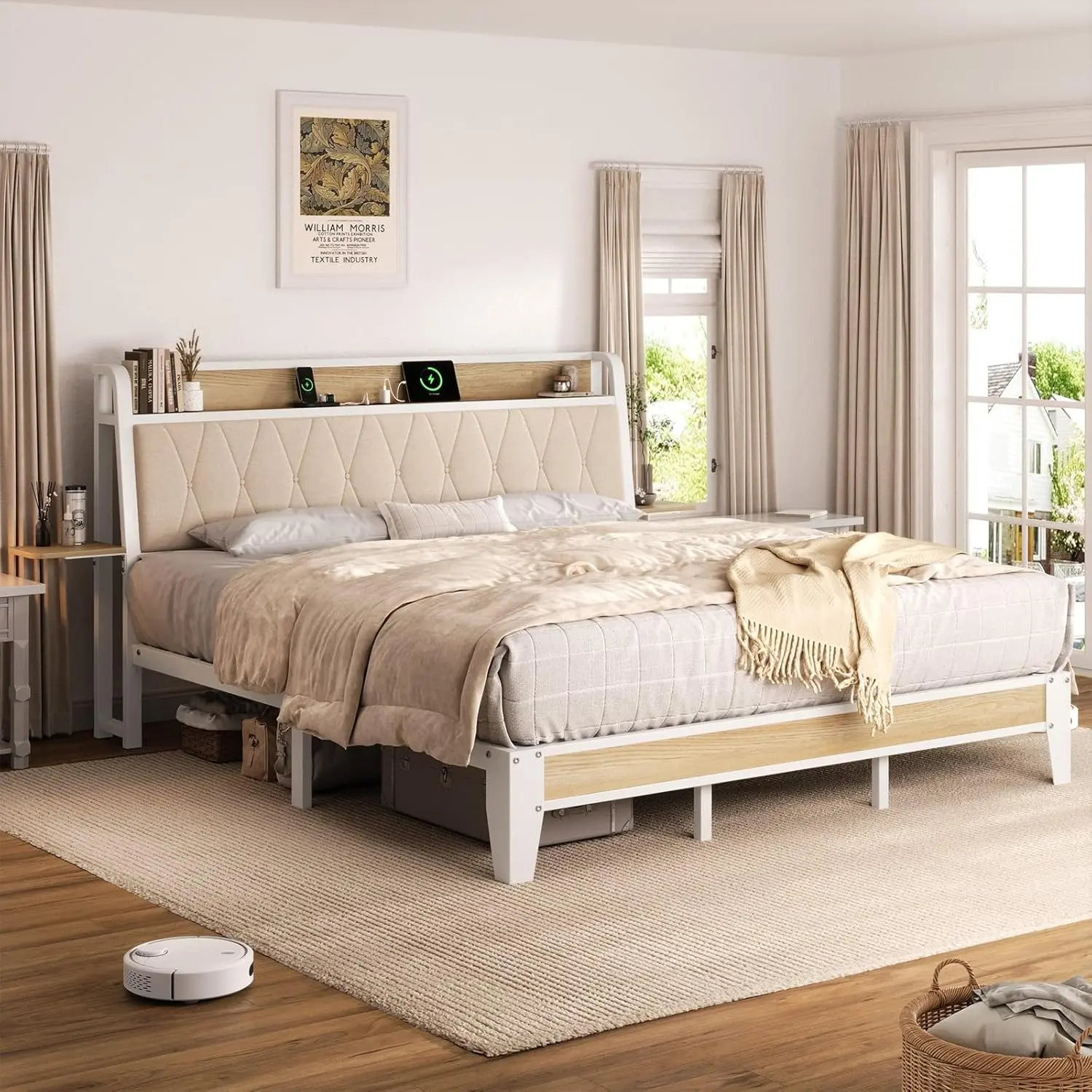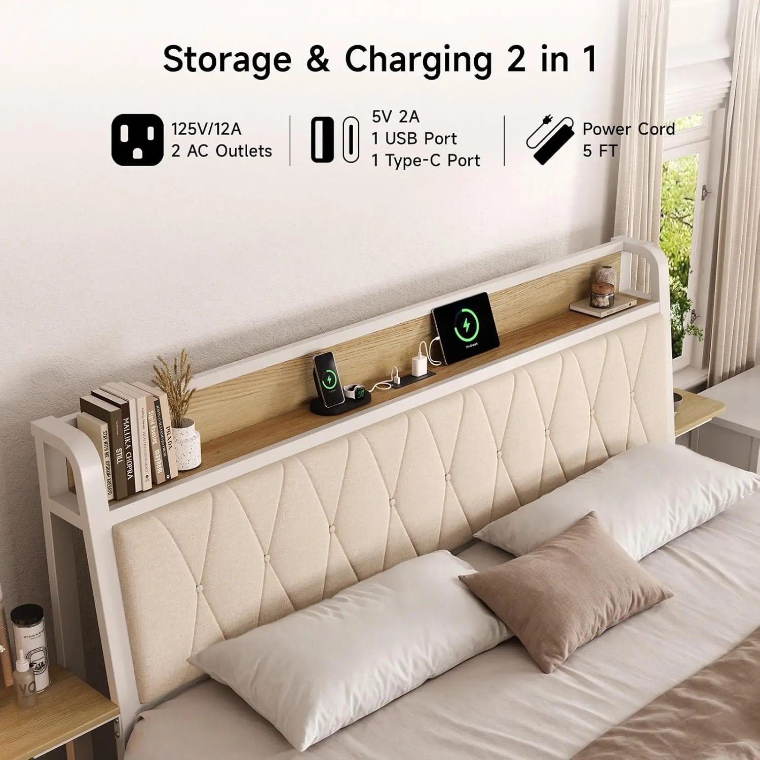 ·STORAGE HEADBOARD WITH CHARGING STATION: The upholstered headboard is equipped with 2 standard plug outlets & 2 ports. Make charging and common small items such as phones, glasses, and books within easy reach