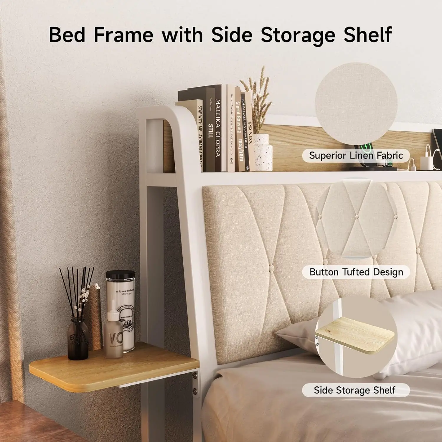 ·SIDE STORAGE SHELF DESIGN: The twin/queen/king bed frame has a storage shelf on both sides of the upholstered headboard, which can be used as a bedside table. It can be used to store books, table lamps, clocks, etc., which is convenient and practical. You can install it as needed