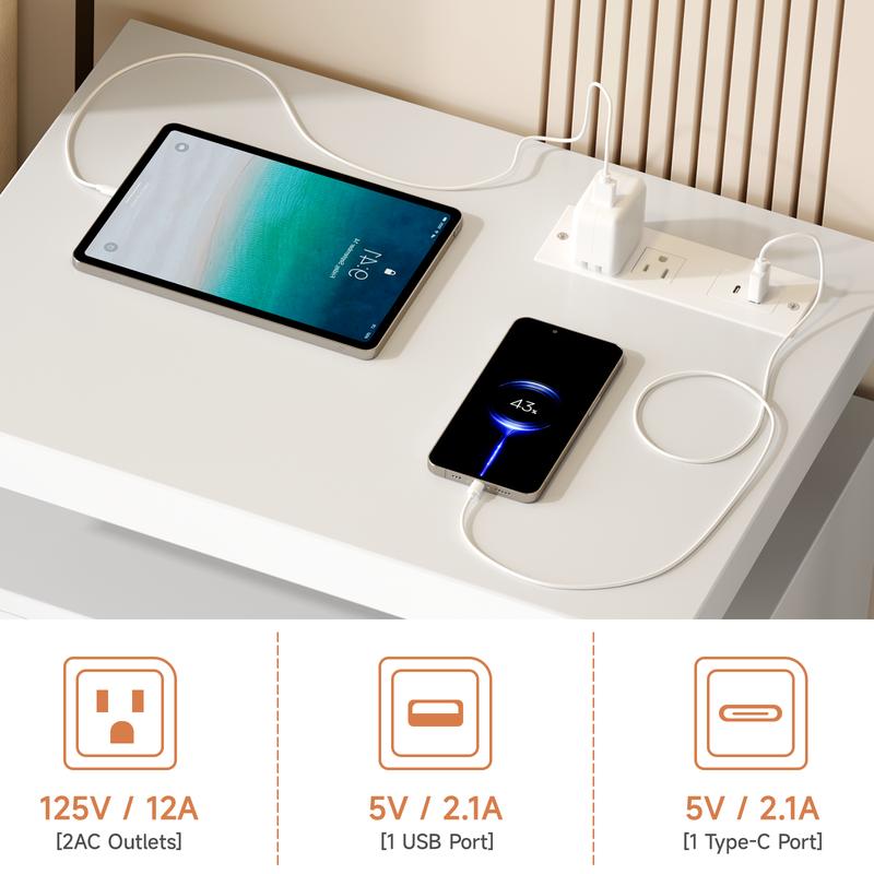 ·【Night Stand with Charging Station】: Featuring 2 power outlets, 1 Type-C port, and 1 USB ports, it can easily charge multiple devices such as phones, tablets, and earphones, meeting your multi-device charging needs before going to bed or when you wake up