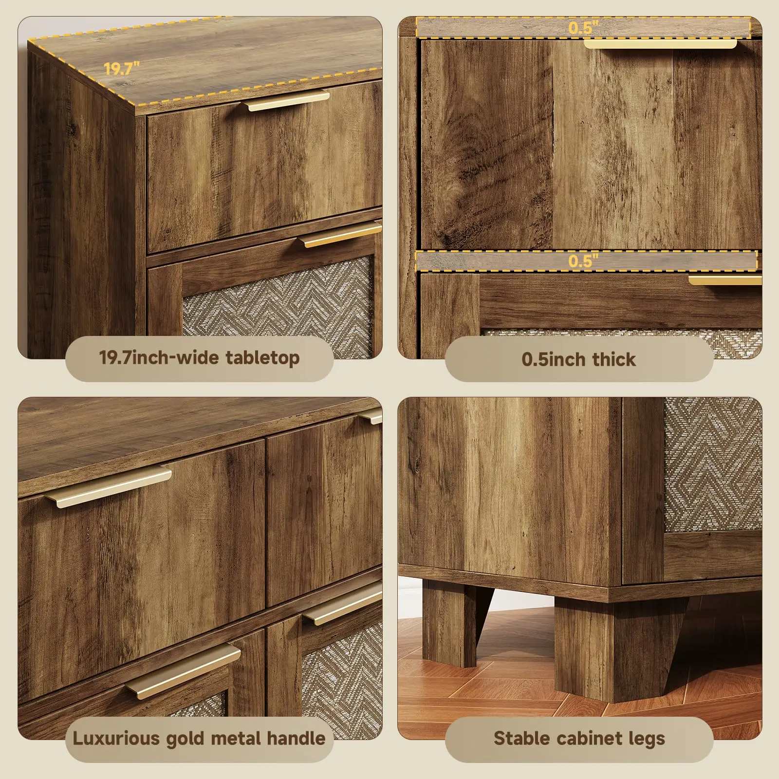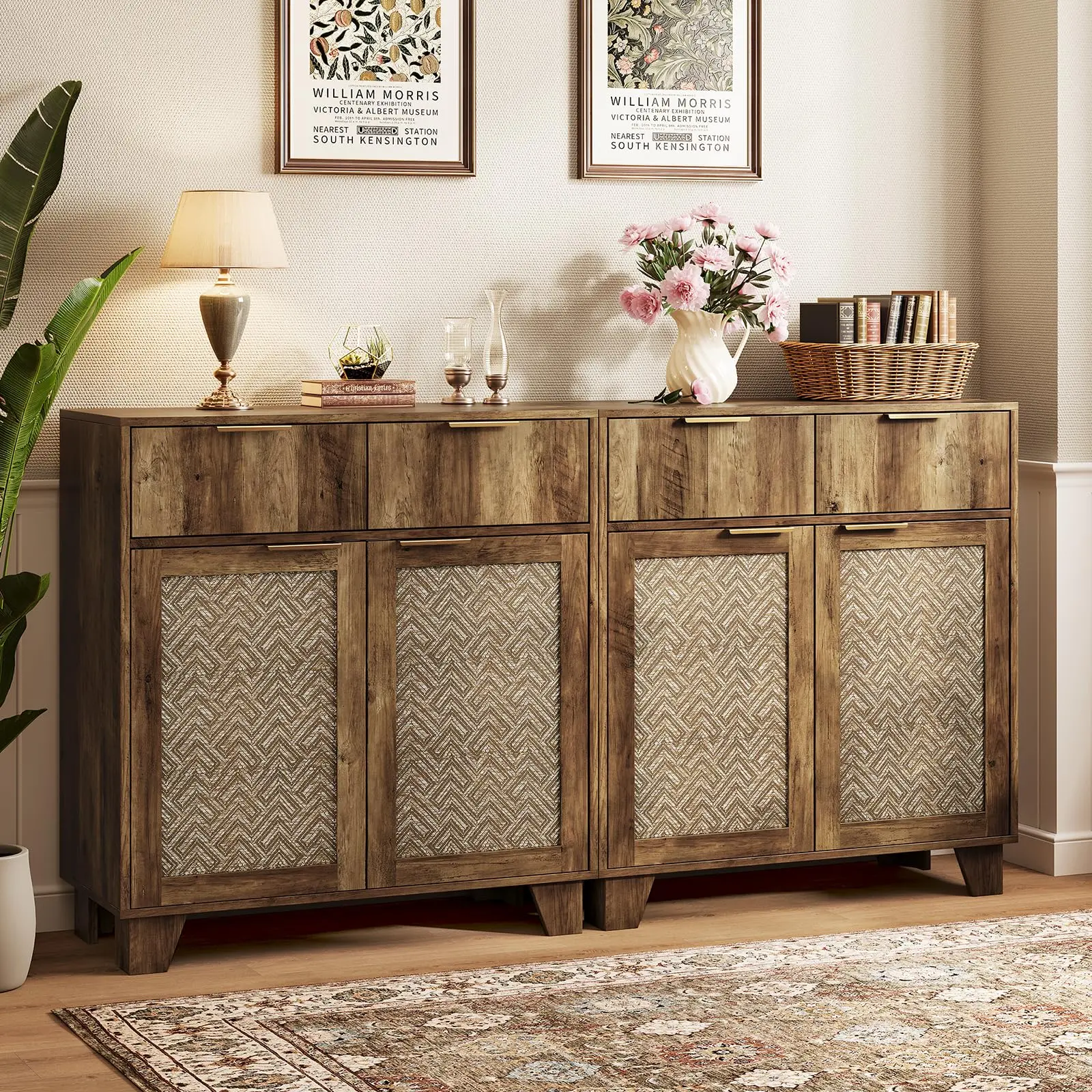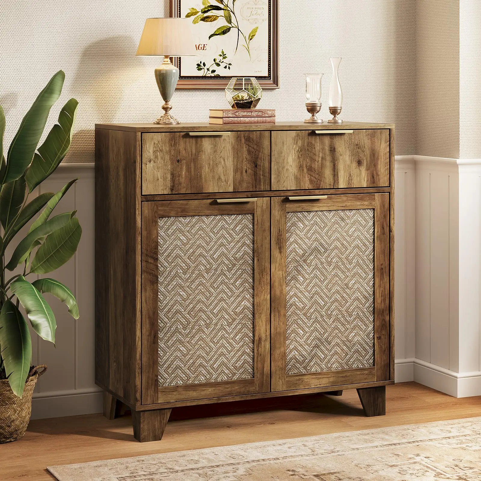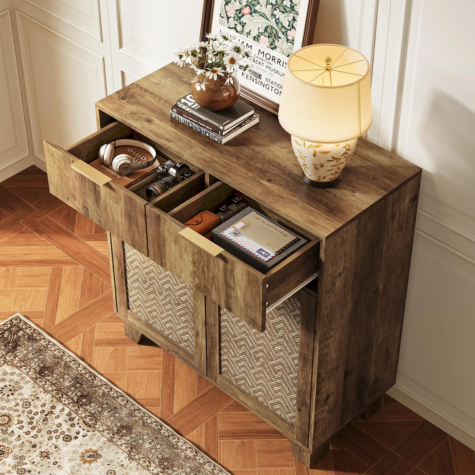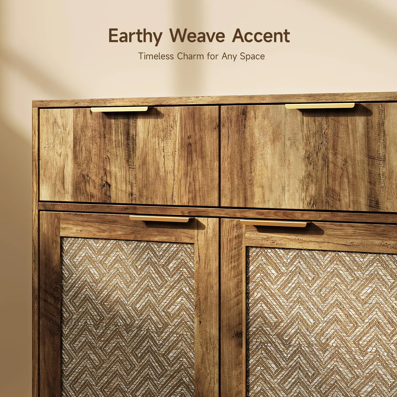 ·Stylish Appearance: The door panels of this sideboard are woven from virgin wood pulp paper fibers, giving it a natural texture. The stylish metal handles complement the overall design, adding a touch of vintage elegance to your home decor