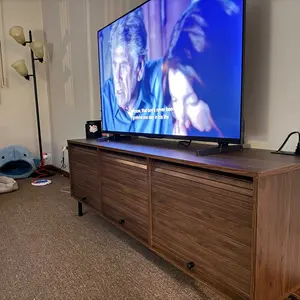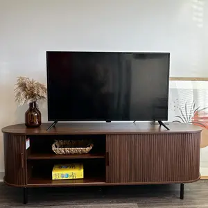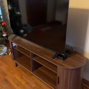 This mid-century modern TV stand combines sliding doors in walnut/black/oak finishes with 6 storage spaces and built-in power outlets. Featuring adjustable shelves and 3 cable holes, it organizes media equipment while serving as a TV stand or entryway console. Easy 50-minute assembly.