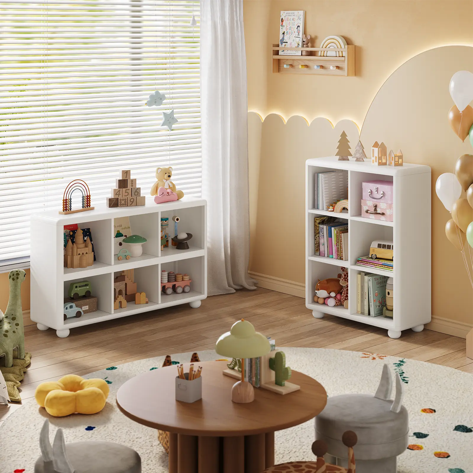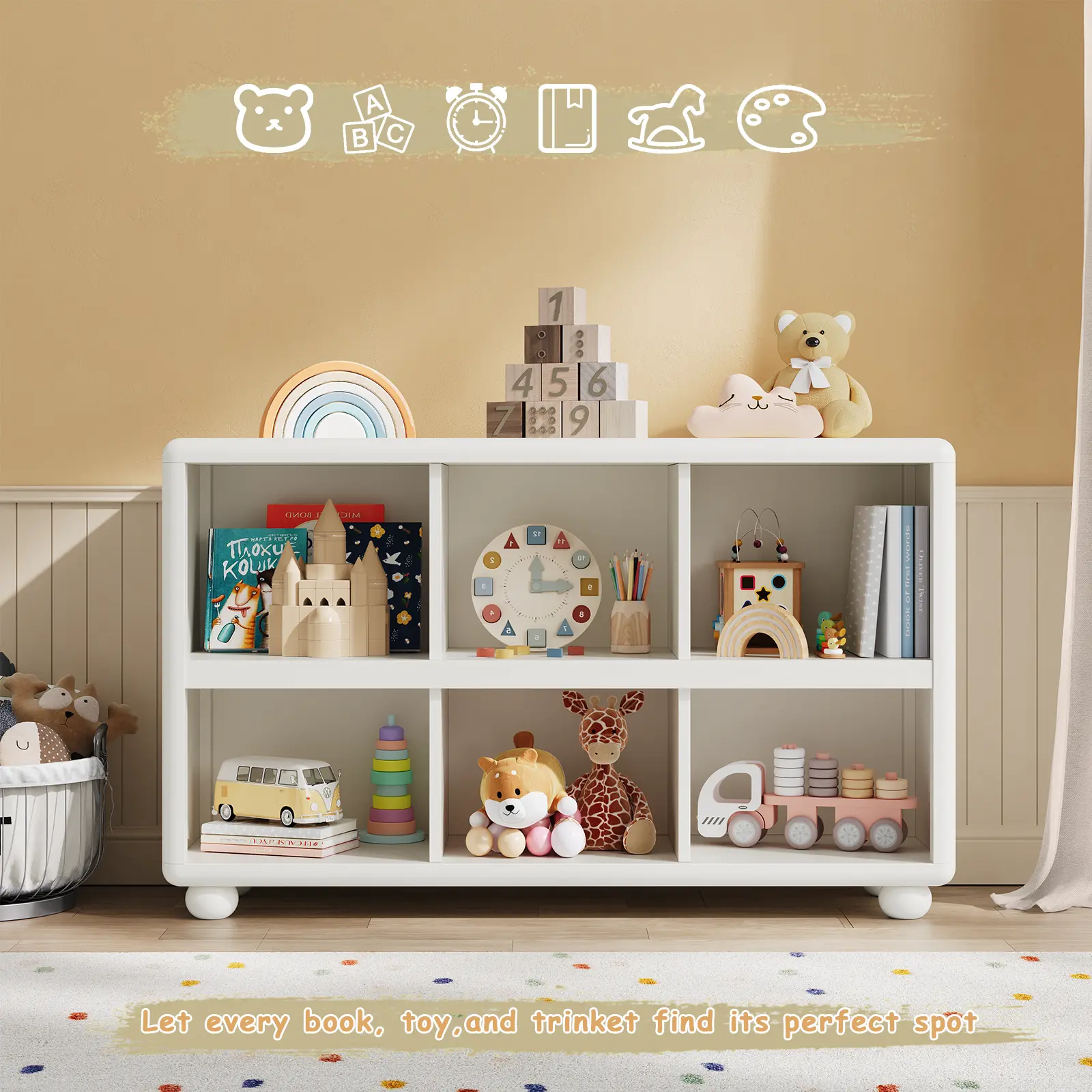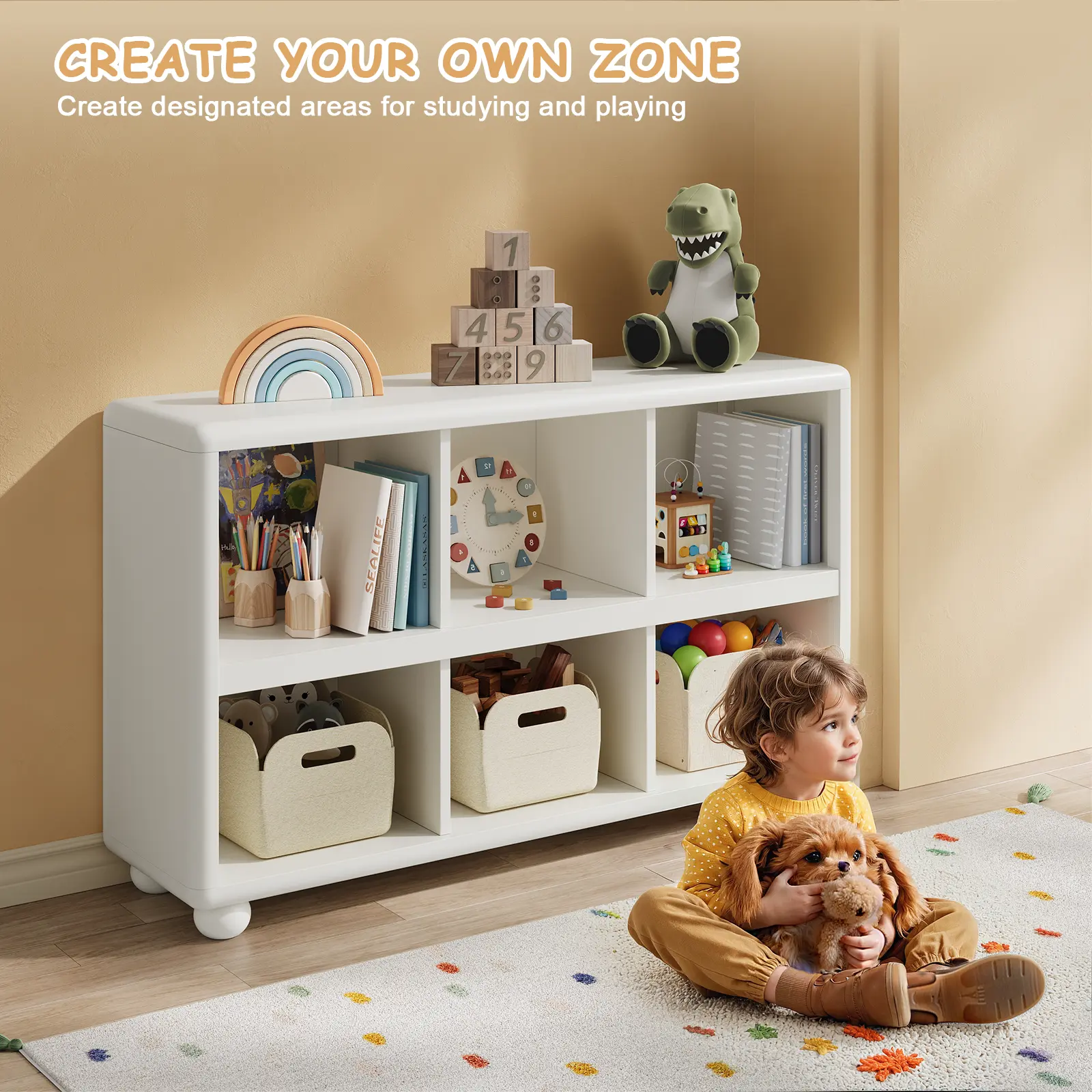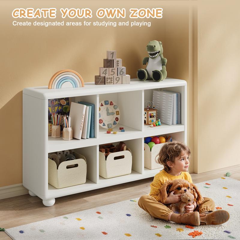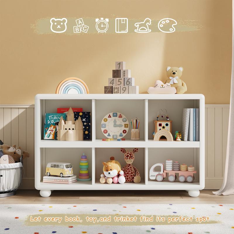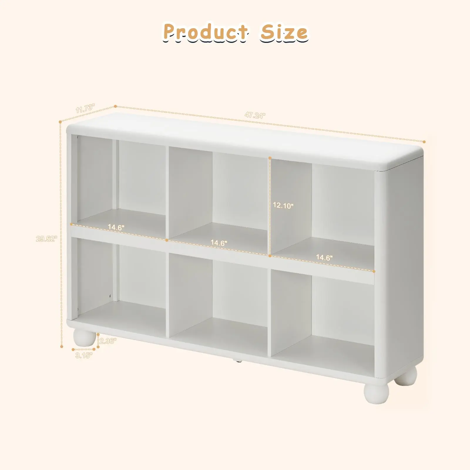 Designed specifically for children, this 6-cube wooden bookcase (47.24"L x 11.81"D x 29.53"H) combines safety, functionality, and whimsical charm. The open-shelf design allows kids to easily see and access their books and toys, fostering reading interest and organizational skills. Featuring smooth rounded corners, certified child-safe paint, and extra-large cubbies (14.65"L x 11.73"D x 12.1"H), it provides a secure and spacious storage solution. Supported by solid wood sphere feet for enhanced stability, this versatile organizer is perfect for bedrooms, playrooms, or classrooms—helping transform clutter into an engaging, orderly space for your child to learn and grow.