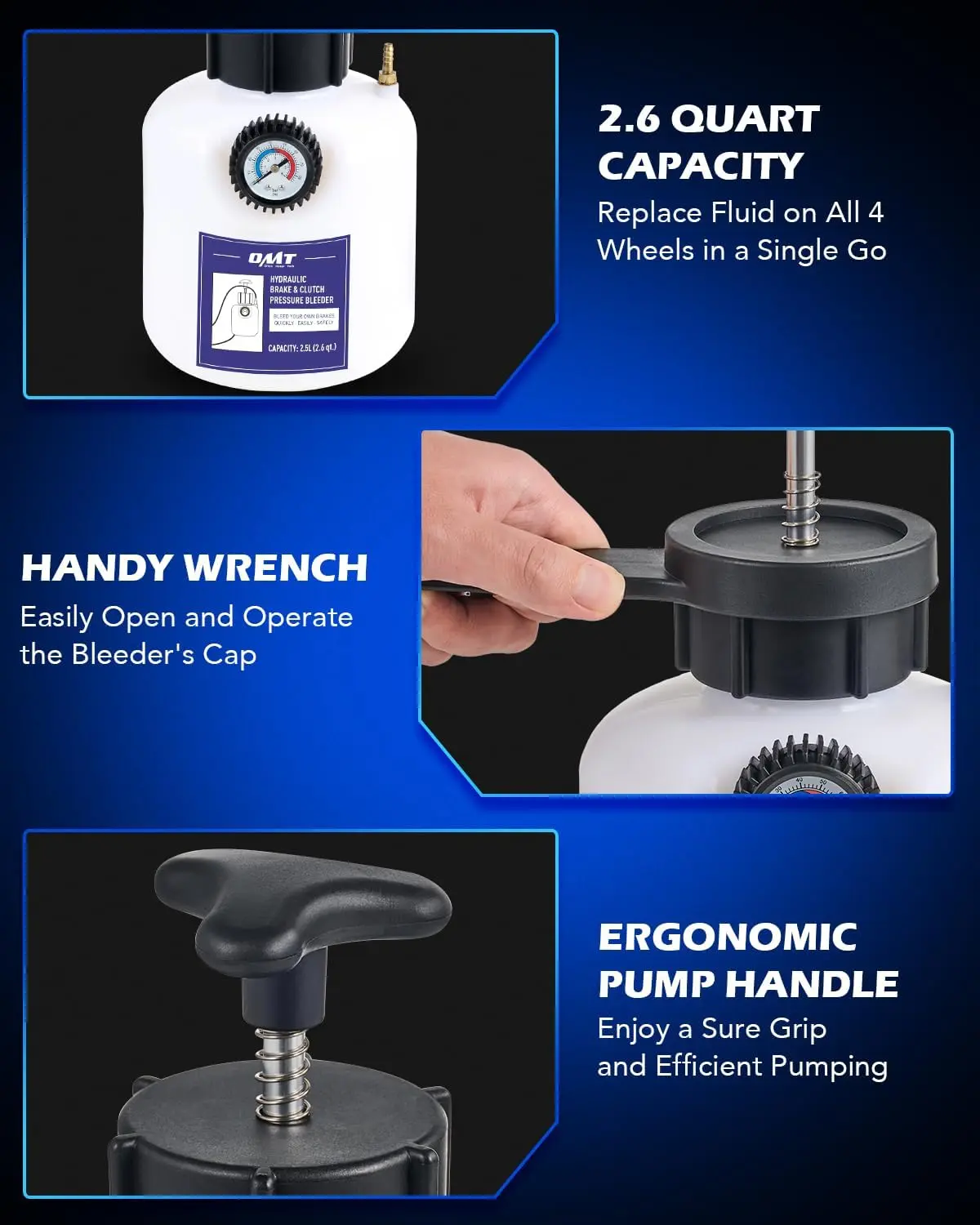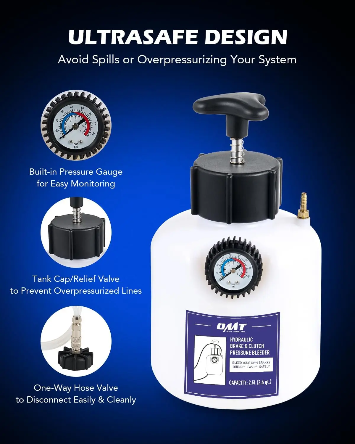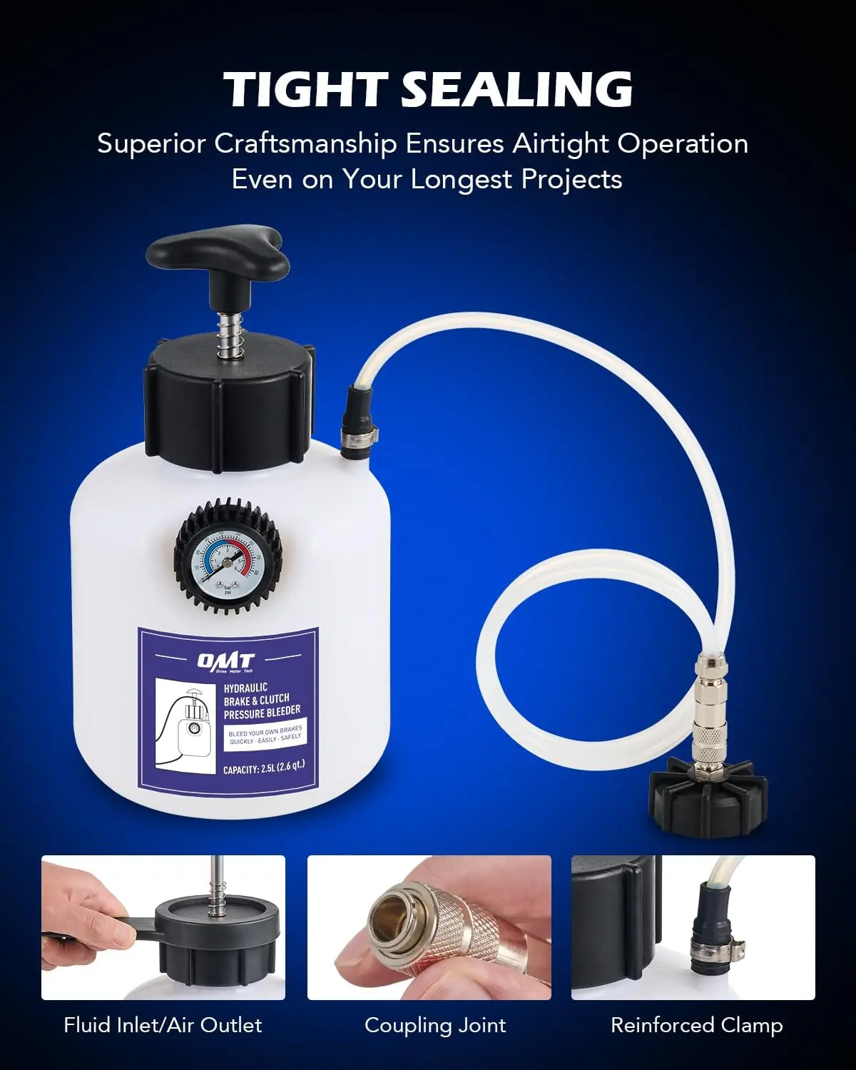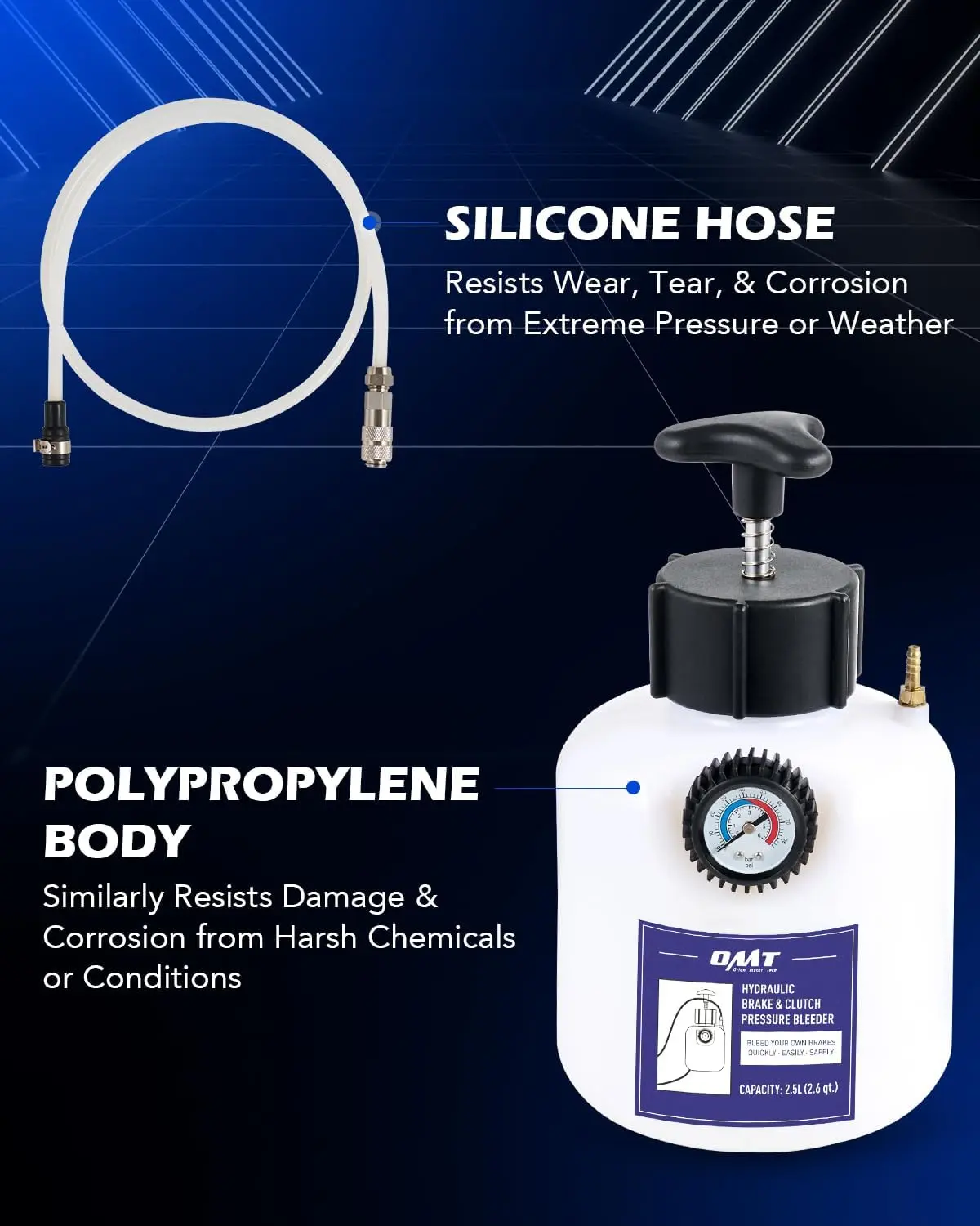The 2.5L polyethylene bottle and 1 metre silicone hose are both highly resistant to heat, wear, and chemical corrosion for a long service life