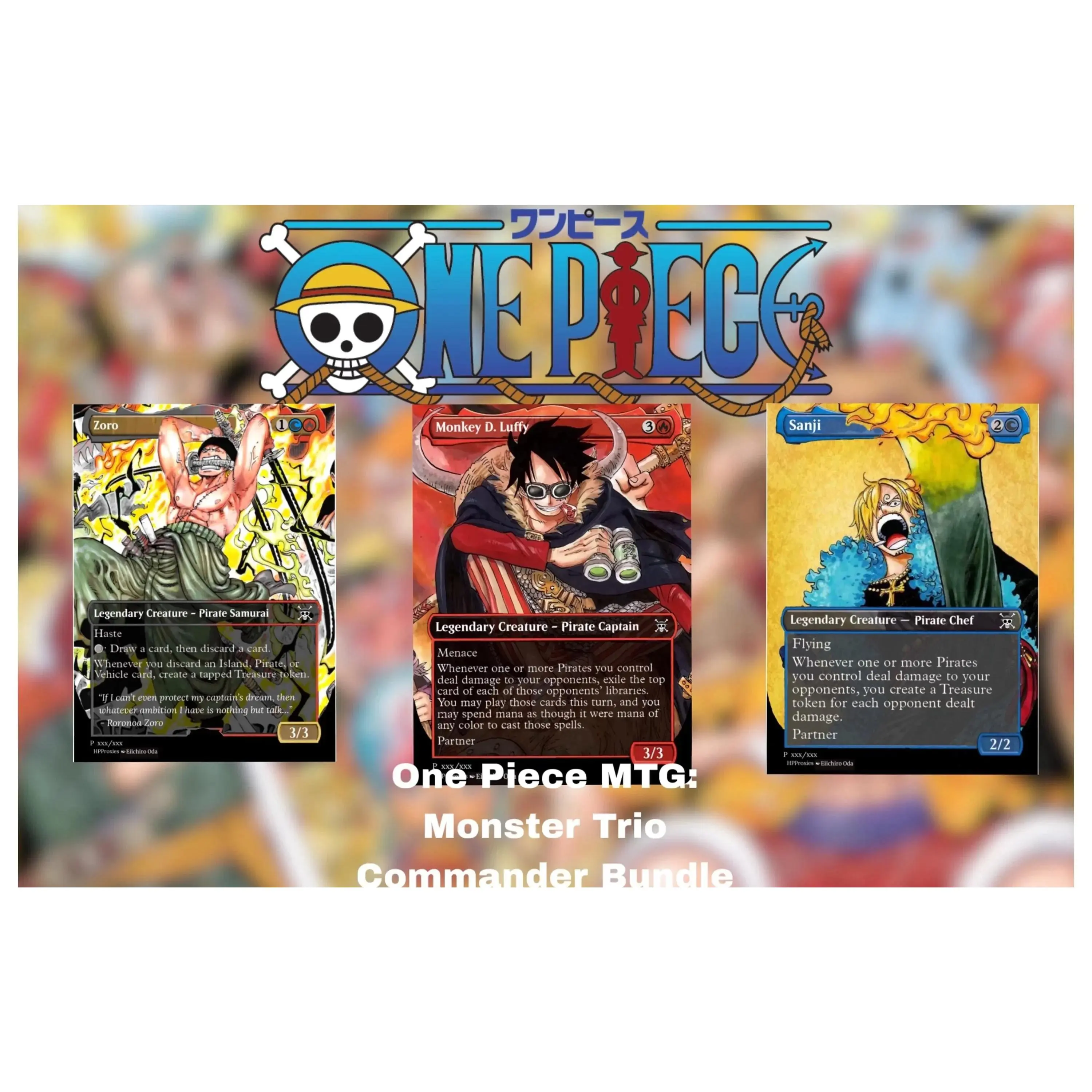 THIS BUNDLE COMES WITH 3 CREATURE COMMANDER PROXIES OF EACH MEMBER OF THE MONSTER TRIO (LUFFY, SANJI AND ZORO) FROM ONE PIECE! IT COMES IN THE UNIQUE ART STYLE OF THE HIT ANIME. PERFECT FOR EVERY ONE PIECE FAN!