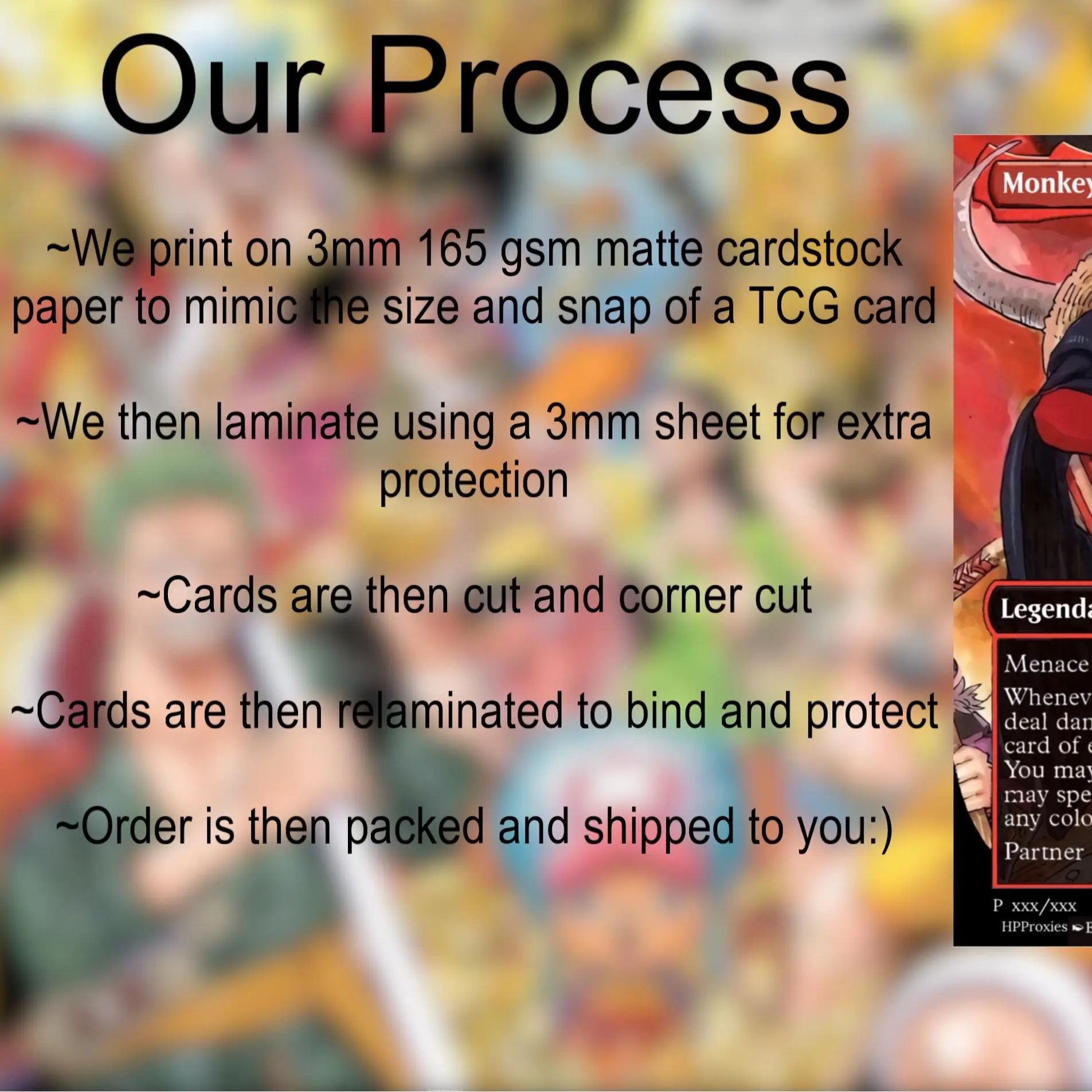 Proxies are laminated on 3 mil lamination sheets to mimic the thickness and snap of a TCG card as close as possible.