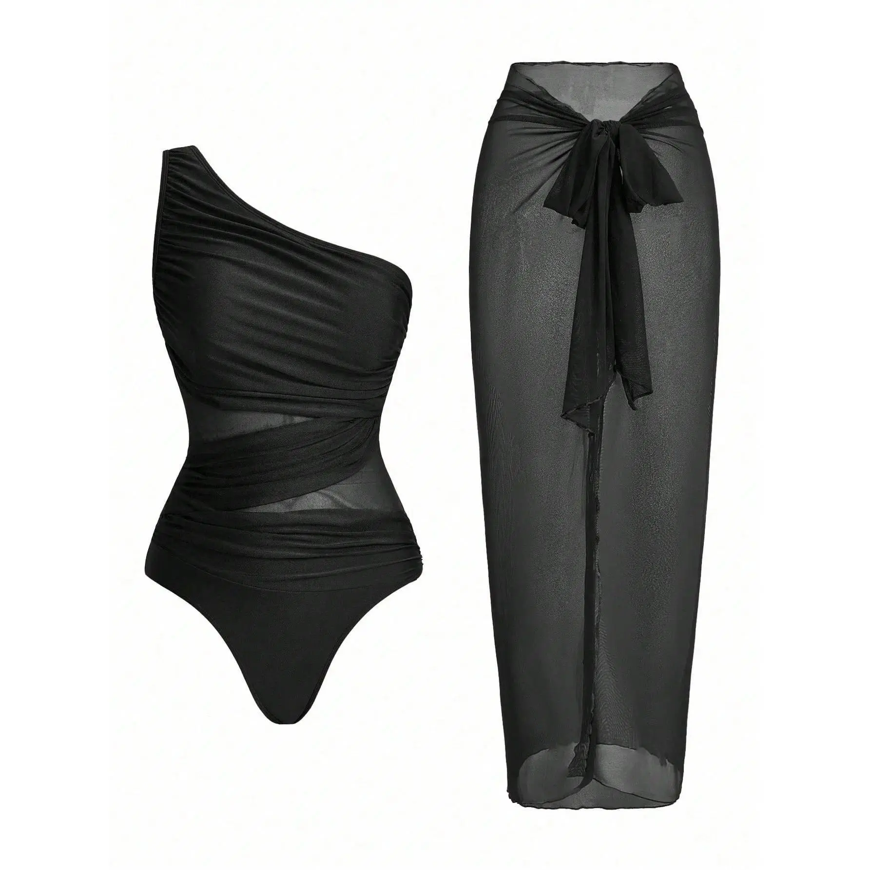 Women's Solid Color Ruched Mesh Panel One-Piece Swimsuit with Sarong SkirtElevate your beach style with this 2026 trendy one-piece swimsuit designed for confidence and comfort. Featuring ruched detailing and sheer mesh panels, it gently shapes your torso and offers a flattering, slimming effect. The attached sarong skirt provides modest coverage while adding a feminine, elegant touch, perfect for hiding problem areas and highlighting your curves.