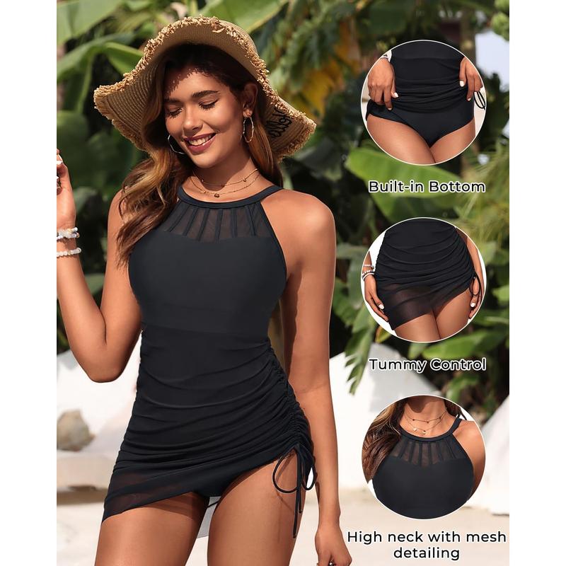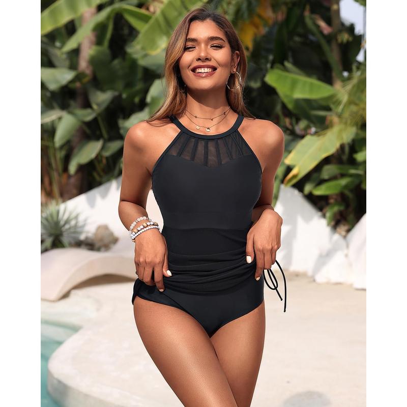 ·Slimming Swimsuit: This one-piece swimdress swimsuit combines a sheer mesh high neck with stylish sarong wraps, offering a modest yet subtly sexy look.